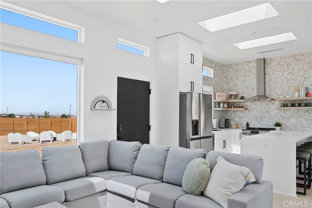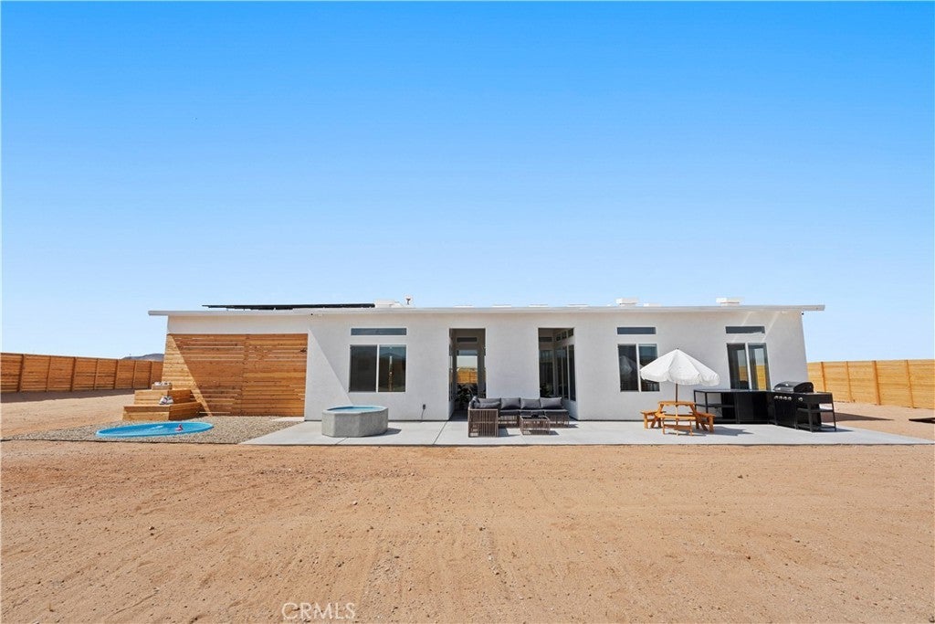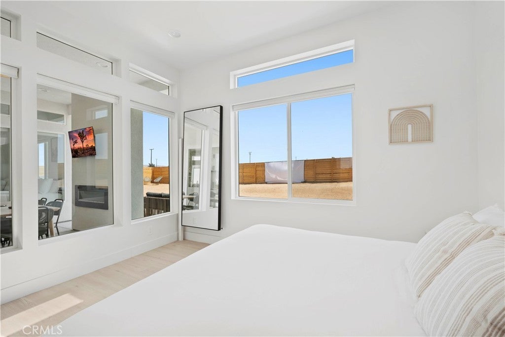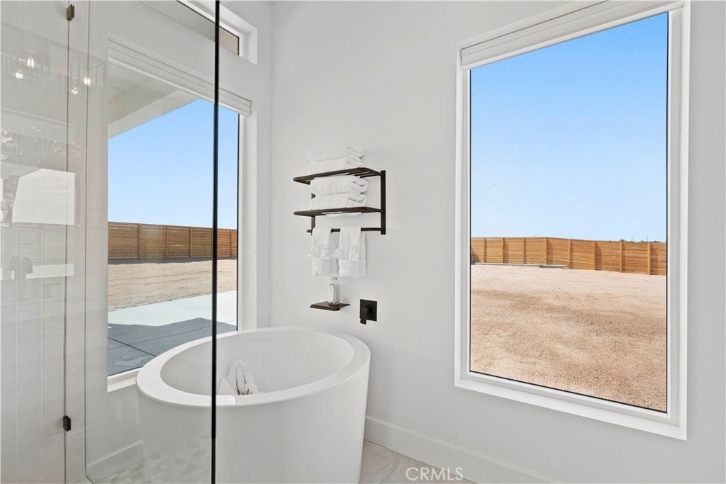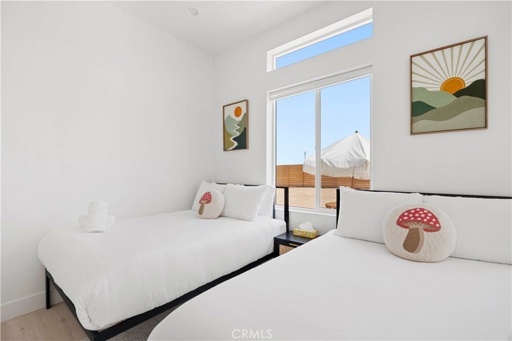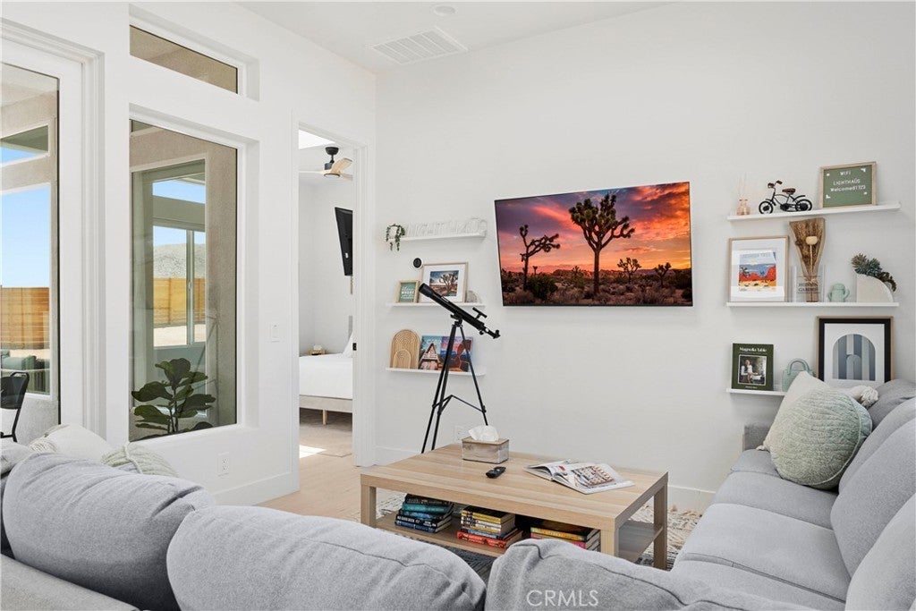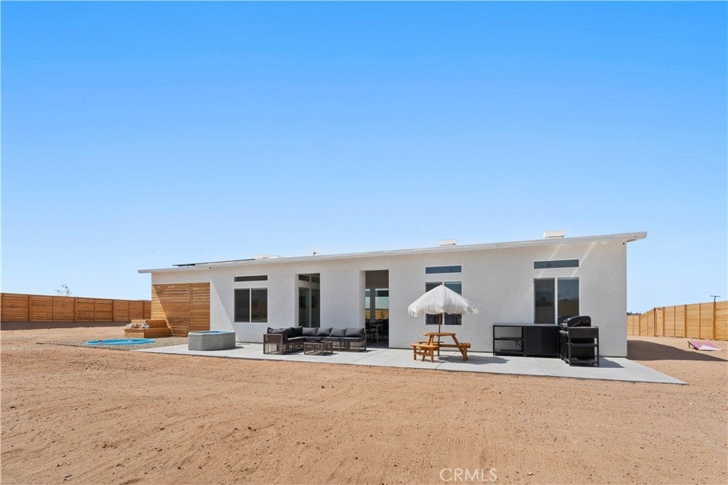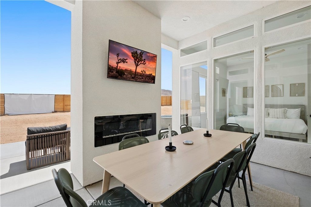 Architect-designed contemporary residence built in 2024, with custom detail throughout. The home features 10-foot ceilings, expansive windows, skylights, and an open floor plan. Interior living space totals 1,043 sq ft, complemented by a California room offering over 110 sq ft of indoor/outdoor dining and living space with an electric fireplace. Set on 2.5 acres, the property provides a rare sense of openness, with approximately one-third enclosed by 6-foot-high fencing for privacy. An automatic gate opens to a concrete driveway leading to an attached carport. Interior finishes include recessed lighting, linear air distribution, and a custom entertainment wall with floating shelving. The kitchen is designed for both function and aesthetics, featuring new stainless steel appliances, a 12-foot peninsula with breakfast bar seating, custom cabinetry extending to the ceiling, open shelving, a vent hood, and tiled accent walls. The home offers generously sized bathrooms with a modern aesthetic, including tile extending to the ceiling and 8-foot glass shower enclosures. The primary suite includes a large private bath with a round soaking tub, glass-enclosed shower with black wall-mounted shower fixtures, ceiling-height tile, and a dual-basin vanity. Bedrooms feature large windows with privacy shades. Additional amenities include a photovoltaic solar system with 15 panels and a Tesla battery capable of powering the home during electrical outages. Exterior features include a concrete patio, an in-ground stock tank pool with a full filtration system discreetly housed beneath a custom wooden bench, and an outdoor rain-style shower. Located in the Hidden River neighborhood, known for architecturally distinctive homes, with convenient access to restaurants, cafés, the farmers market, and Joshua Tree National Park. Property is partially occupied. Please do not disturb occupants.