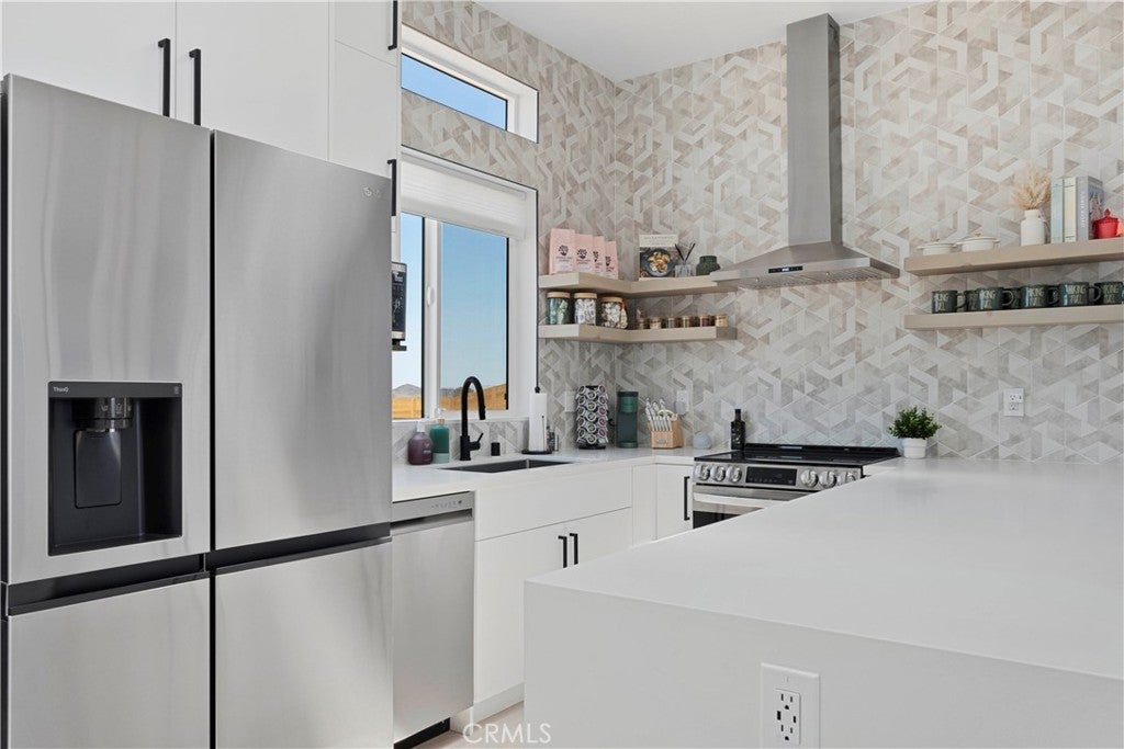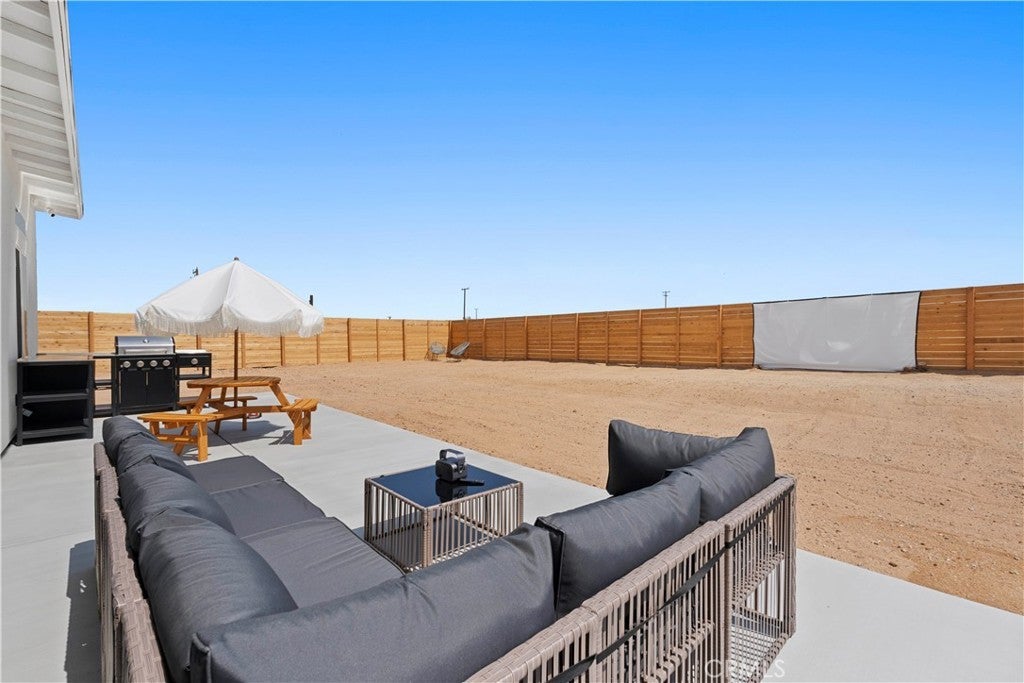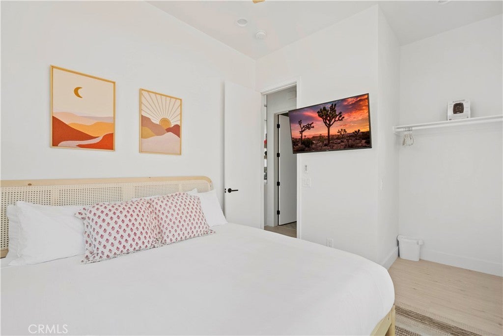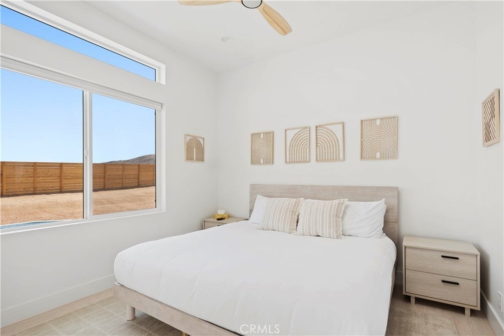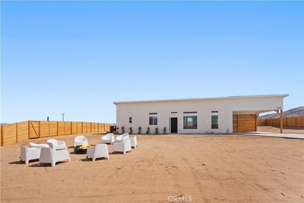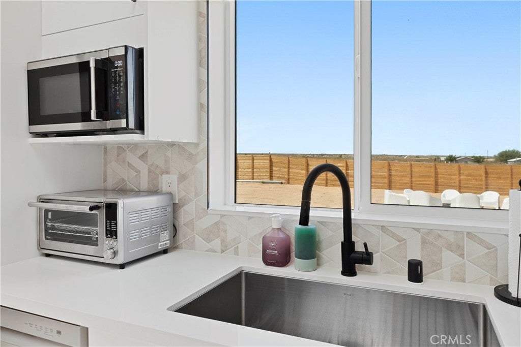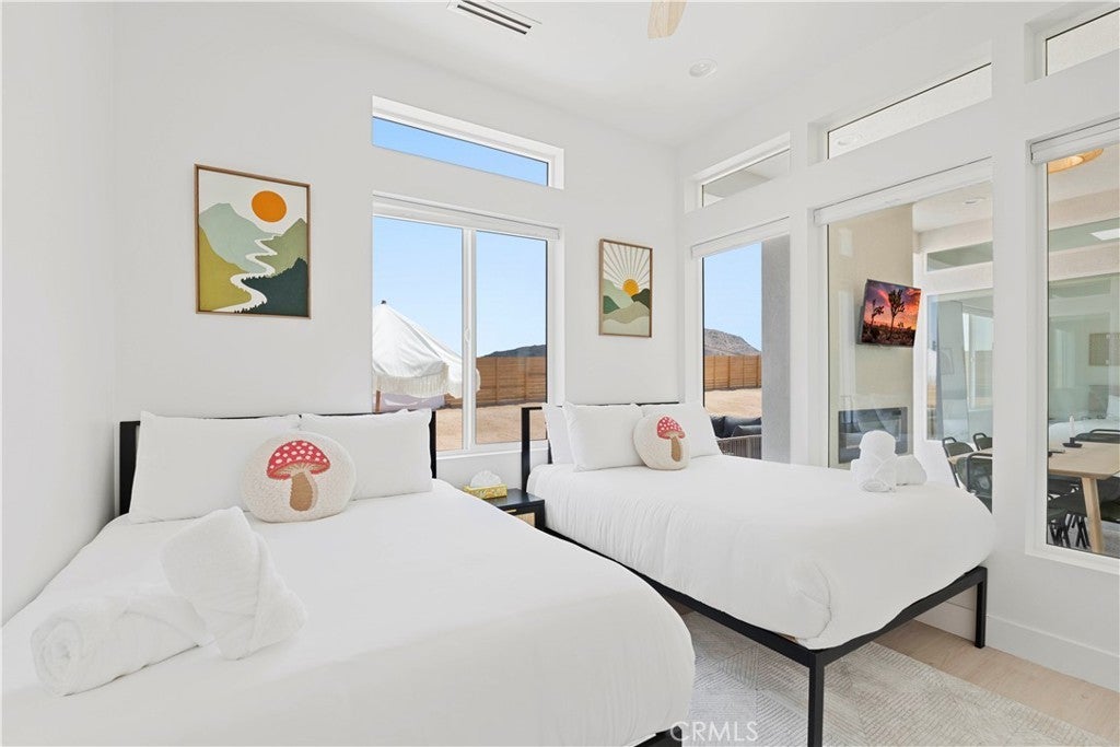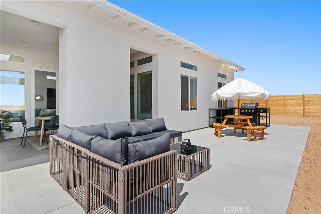 Architect-designed contemporary residence built in 2024, with custom detail throughout. The home features 10-foot ceilings, expansive windows, skylights, and an open floor plan. Interior living space totals 1,043 sq ft, complemented by a California room offering over 110 sq ft of indoor/outdoor dining and living space with an electric fireplace. Set on 2.5 acres, the property provides a rare sense of openness, with approximately one-third enclosed by 6-foot-high fencing for privacy. An automatic gate opens to a concrete driveway leading to an attached carport. Interior finishes include recessed lighting, linear air distribution, and a custom entertainment wall with floating shelving. The kitchen is designed for both function and aesthetics, featuring new stainless steel appliances, a 12-foot peninsula with breakfast bar seating, custom cabinetry extending to the ceiling, open shelving, a vent hood, and tiled accent walls. The home offers generously sized bathrooms with a modern aesthetic, including tile extending to the ceiling and 8-foot glass shower enclosures. The primary suite includes a large private bath with a round soaking tub, glass-enclosed shower with black wall-mounted shower fixtures, ceiling-height tile, and a dual-basin vanity. Bedrooms feature large windows with privacy shades. Additional amenities include a photovoltaic solar system with 15 panels and a Tesla battery capable of powering the home during electrical outages. Exterior features include a concrete patio, an in-ground stock tank pool with a full filtration system discreetly housed beneath a custom wooden bench, and an outdoor rain-style shower. Located in the Hidden River neighborhood, known for architecturally distinctive homes, with convenient access to restaurants, cafés, the farmers market, and Joshua Tree National Park. Property is partially occupied. Please do not disturb occupants.