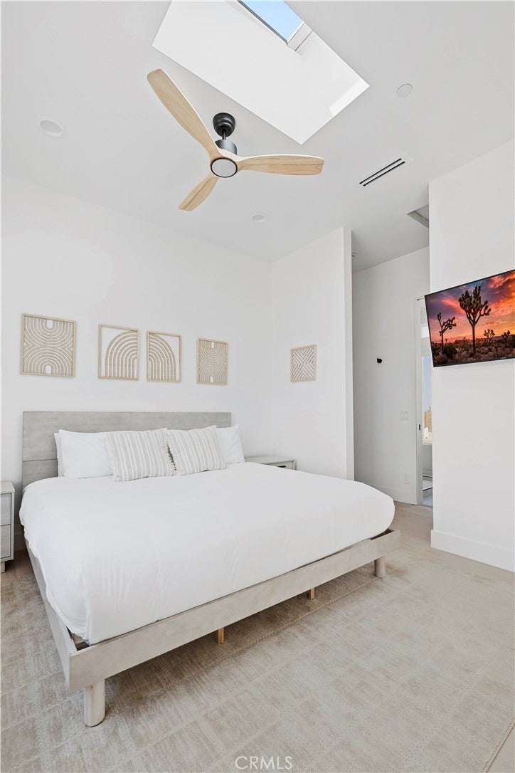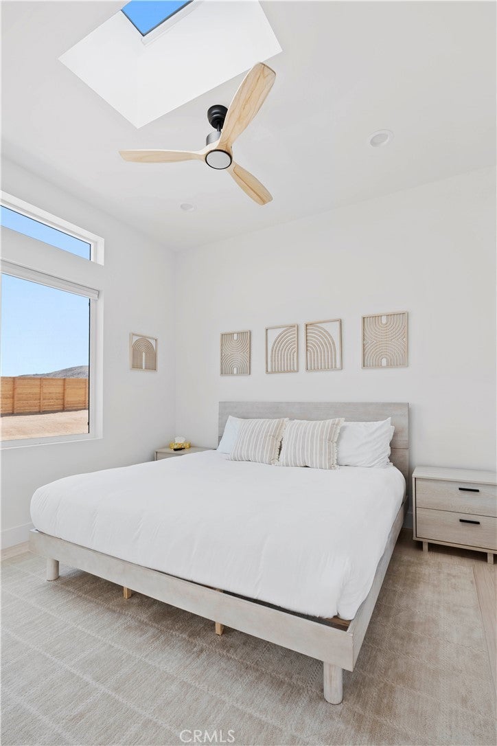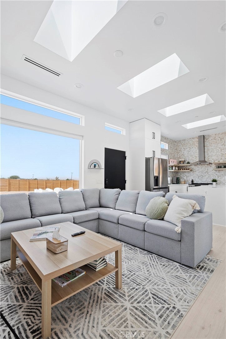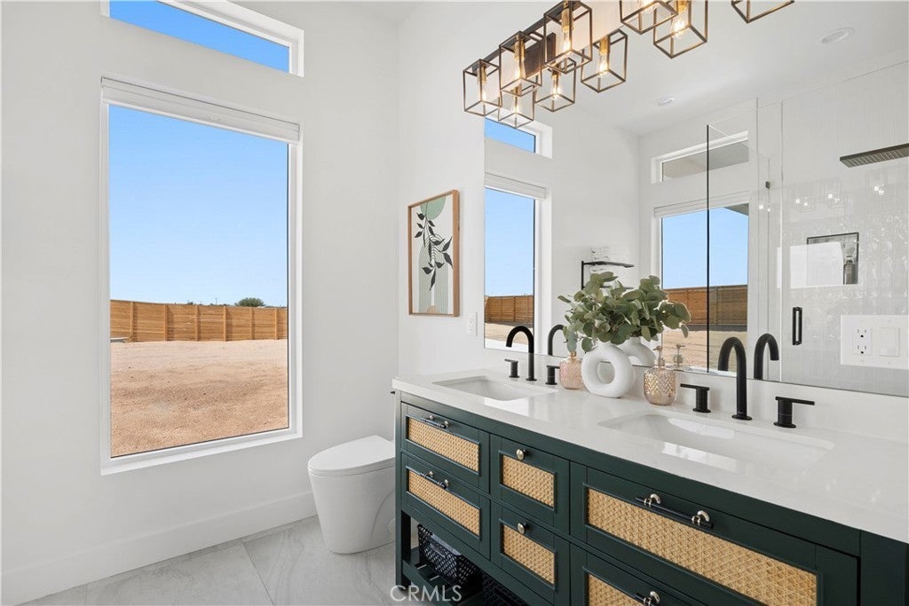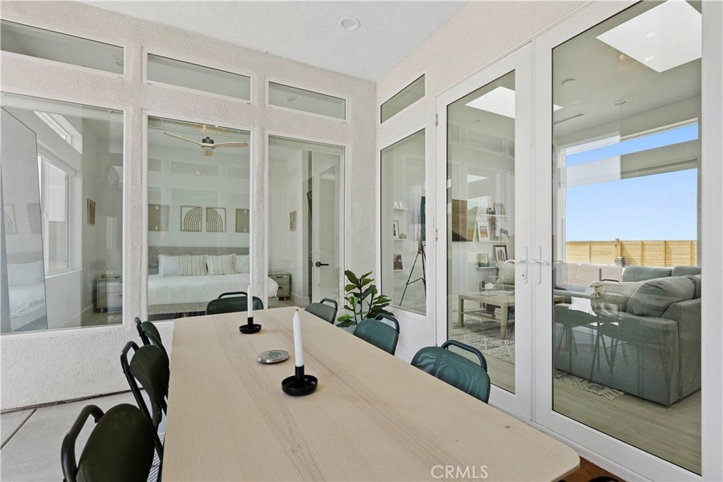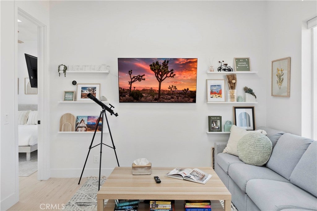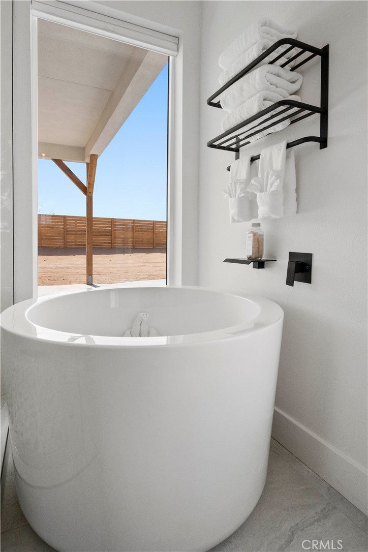Architect-designed contemporary residence built in 2024, with custom detail throughout. The home features 10-foot ceilings, expansive windows, skylights, and an open floor plan. Interior living space totals 1,043 sq ft, complemented by a California room offering over 110 sq ft of indoor/outdoor dining and living space with an electric fireplace. Set on 2.5 acres, the property provides a rare sense of openness, with approximately one-third enclosed by 6-foot-high fencing for privacy. An automatic gate opens to a concrete driveway leading to an attached carport. Interior finishes include recessed lighting, linear air distribution, and a custom entertainment wall with floating shelving. The kitchen is designed for both function and aesthetics, featuring new stainless steel appliances, a 12-foot peninsula with breakfast bar seating, custom cabinetry extending to the ceiling, open shelving, a vent hood, and tiled accent walls. The home offers generously sized bathrooms with a modern aesthetic, including tile extending to the ceiling and 8-foot glass shower enclosures. The primary suite includes a large private bath with a round soaking tub, glass-enclosed shower with black wall-mounted shower fixtures, ceiling-height tile, and a dual-basin vanity. Bedrooms feature large windows with privacy shades. Additional amenities include a photovoltaic solar system with 15 panels and a Tesla battery capable of powering the home during electrical outages. Exterior features include a concrete patio, an in-ground stock tank pool with a full filtration system discreetly housed beneath a custom wooden bench, and an outdoor rain-style shower. Located in the Hidden River neighborhood, known for architecturally distinctive homes, with convenient access to restaurants, cafés, the farmers market, and Joshua Tree National Park. Property is partially occupied. Please do not disturb occupants.