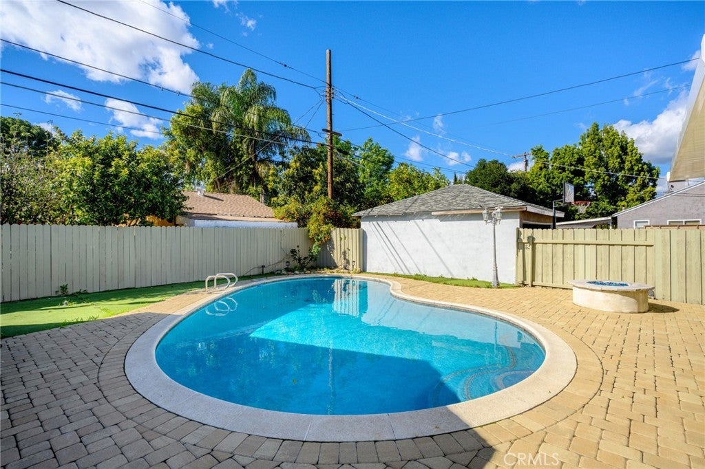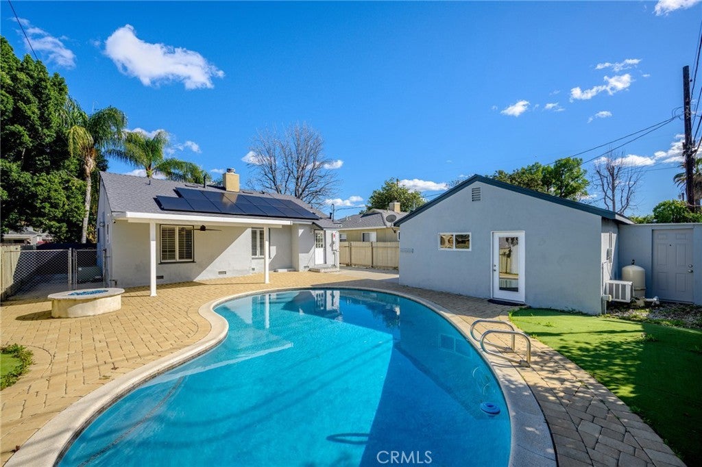 Beautifully updated 3-bedroom, 2-bath home located on a quiet, tree-lined street in Reseda CA. Set back on a large gated lot with an extended driveway that fits 2–3 cars, offering privacy and security. Inside features original hardwood floors, great natural light, recessed lighting, and a cozy gas fireplace with built-in shelving. The dining area connects to a galley kitchen with shaker cabinets, marble countertops, stainless steel appliances, and a farmhouse sink. Bedrooms offer generous closet space and built-ins. The full bath includes a separate tub and shower. The backyard is built for entertaining — spacious, sunny, with paved decking, patio trellis, and a sparkling pool for true California indoor-outdoor living. Upgrades include a new roof, solar system, and tankless water heater (2025). Move-in ready and perfect for entertaining.