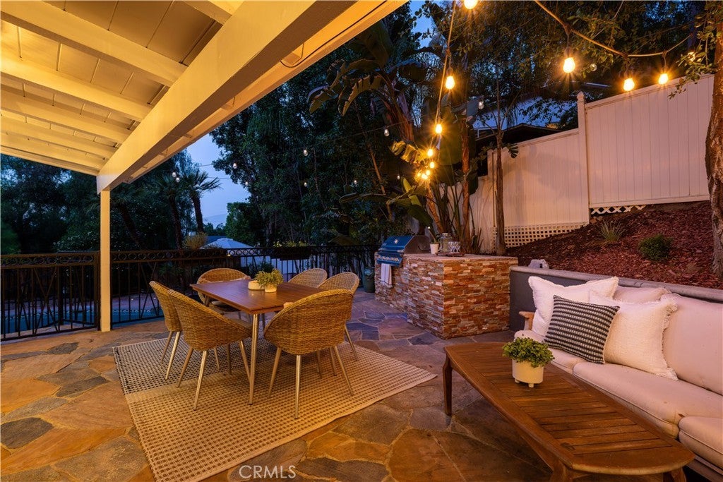 South of the Boulevard | Pool Home on One of Woodland Hills' Quietest Streets This is the kind of Woodland Hills property that doesn't come along often — a flat corner lot, a year-round pool, and a location south of the boulevard that feels worlds away from the noise while keeping everything within easy reach. This 3-bedroom, 2.5-bath home offers 2,470 sq ft of living space that balances warmth, privacy, and thoughtful upgrades throughout. Lots of this size with a pool are something special in Woodland Hills. The manicured grounds feature updated landscaping, a full irrigation system, and a backyard built around outdoor living. Perfect for summer and cool winter evenings alike, the gas-heated pool anchors the space alongside a covered patio, built-in BBQ, built-in refrigerator, and mature trees that create a resort-like atmosphere without sacrificing light. The upgraded half bath opens directly to the patio — a thoughtful touch that keeps wet feet from ever entering the house. Parking is abundant: 2-car garage, 4 driveway spaces, and a dedicated uphill pad bring the total to 8 — rare in an area where narrow streets make parking a challenge. Inside, skylights, vaulted ceilings, and an open flow keep the home remarkably bright despite the surrounding tree canopy. The family room impresses with crown molding, wood flooring, recessed lighting, and a gas fireplace, with surround sound extending through the first floor, home theater, and patio. The custom breakfast nook with built-in storage, Sunbrella cushions, and Rejuvenation hardware elevates everyday moments from sunlit morning breakfasts to casual evening dinners. The primary suite occupies its own floor, anchored by a completely transformed bath — Emser tile, solid teak vanity, quartz countertops, California Faucets, multi-head shower, and Kohler x Studio McGee mirrors and lighting. A new RHEEM 5-ton high-efficiency HVAC and owned solar panels mean you can run the AC and enjoy the pool without watching the meter. Additional upgrades: custom blackout Roman shades, custom electronics cabinet, Ring and Arlo security, and new light fixtures throughout. Pre-inspected and move-in ready: roof repairs completed, termite Section 1 cleared, septic cleaned and treated. Inspection report and disclosures available upon request. The quiet street, the flat lot, the year-round pool, the privacy — individually each is hard to find in Woodland Hills. Together, they make this one truly special.
