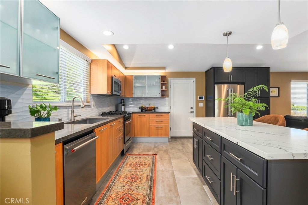**Fully Renovated Woodland Hills Gem with Dual Primary Suites, New Roof & Prime Location!** Welcome to 20516 Aetna — a beautifully updated single-story home offering 4 bedrooms, 3 full baths, and ~1,975 sq ft on a spacious 9,100 sq ft lot with stunning city light views. Bright, open-concept layout with vaulted ceilings, abundant natural light, and seamless flow between the living room, dining area, remodeled kitchen, and expansive family room — ideal for entertaining. Rare **two primary suites**, including a private retreat with French doors, custom closets, and a spa-like bath featuring dual vanities, soaking tub, and walk-in shower. Extensive upgrades throughout: remodeled kitchen with custom cabinetry & quartz island, updated baths, hardwood flooring, newer HVAC with heat pump, upgraded electrical, tankless water heater, and more. **Brand new roof + fresh exterior paint** add major value and curb appeal. Ultra-private backyard with new landscaping, irrigation, vinyl fencing, electric gate, and multiple patio spaces for indoor-outdoor living. Prime location near Ventura Blvd, The Village at Topanga, top shopping & dining, and the Rams training facility. **Turnkey, upgraded, and priced to move — don’t miss this opportunity!**