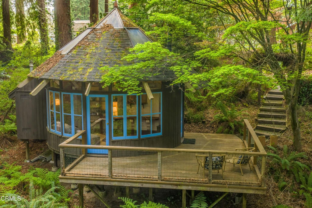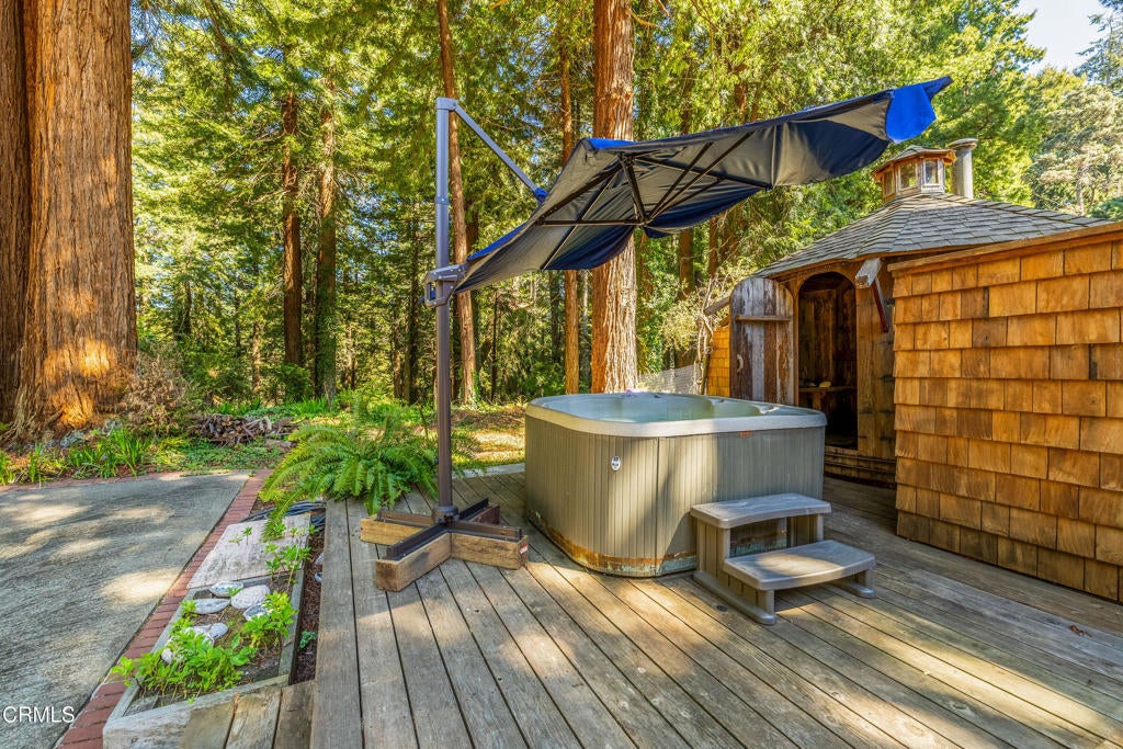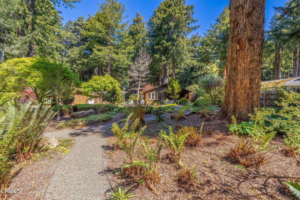 Tucked behind a private, automatic gated entry and fully fenced for ultimate seclusion, this extraordinary property unfolds like your own personal botanical sanctuary where the noise of the outside world fades and nature takes center stage. Just minutes from town and the coastline, it offers a rare balance of peaceful country living with effortless access to coastal amenities.Set within a park-like landscape of meticulously trimmed, towering redwoods that filter sunlight beautifully throughout the grounds, the custom-built home is warm, inviting, and rich with character. Inside, vaulted old-growth redwood ceilings, custom woodworking, and thoughtfully placed windows create a seamless connection between indoor comfort and the surrounding natural beauty. Warm tile flooring flows through the main living areas, anchored by a wood-burning fireplace and complemented by a sun-drenched solarium, perfect for year-round relaxation.The primary suite offers a peaceful retreat with an additional loft space ideal for guest accommodations, while both bedrooms feature large, redwood-trimmed windows that invite the outdoors in. Custom cabinetry enhances both form and function throughout the home. Designed for both wellness and creativity, the property features a private hot tub and sauna, along with a truly one-of-a-kind guest experience--a custom-crafted studio built from a converted water tank. This artistic space offers incredible flexibility as guest quarters, a vacation rental, or a private creative retreat, complete with its own deck for enjoying sunny afternoons or listening to coastal rain against the skylights. The newly finished garage expands the usability of the property with two private workshop spaces ideal for a home gym, studio, or hobby space, along with extended enclosed storage for bikes, tools, and coastal gear. A large water storage system and irrigation support the lush grounds, enhancing both sustainability and ease of maintenance.Two distinct entry points welcome you home. One from the south, guiding guests through the gardens, and a west-facing entrance where the gentle sounds of a fish pond create an immediate sense of calm. This is more than a home--it's an experience. A place where tranquility, creativity, and comfort come together in one truly special offering.
