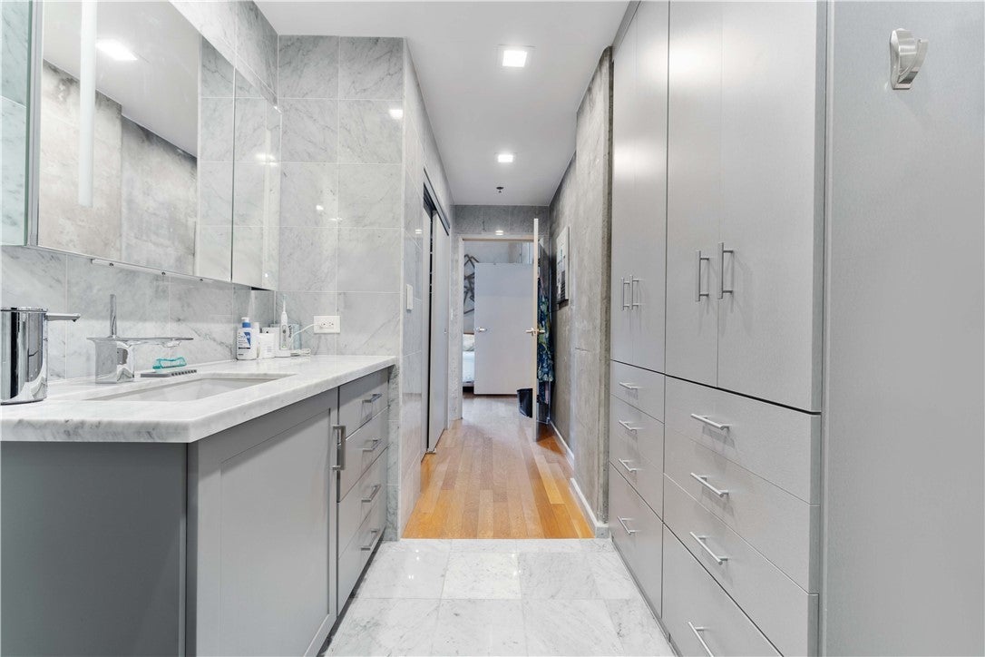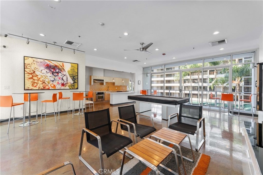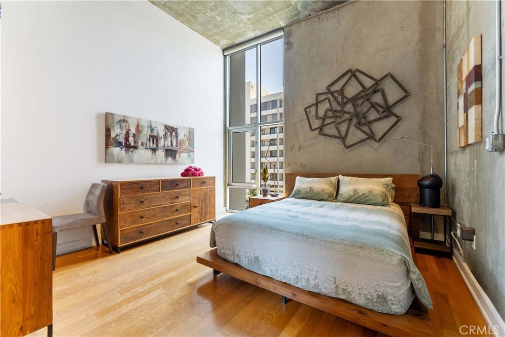 Located on the corner of the top floor, it has 13 ft floor-to-ceiling windows. Exposed concrete walls, open-concept layout, wood flooring and a kitchen with stainless steel appliances. The living space opens to a patio overlooking downtown with plenty of natural light. The primary suite has a renovated bathroom and custom-made closet. Additional conveniences include an in-unit washer/dryer, parking spaces, and an entryway storage closet Enjoy the inviting pool, fitness center, clubhouse, BBQ area, and a private screening room.