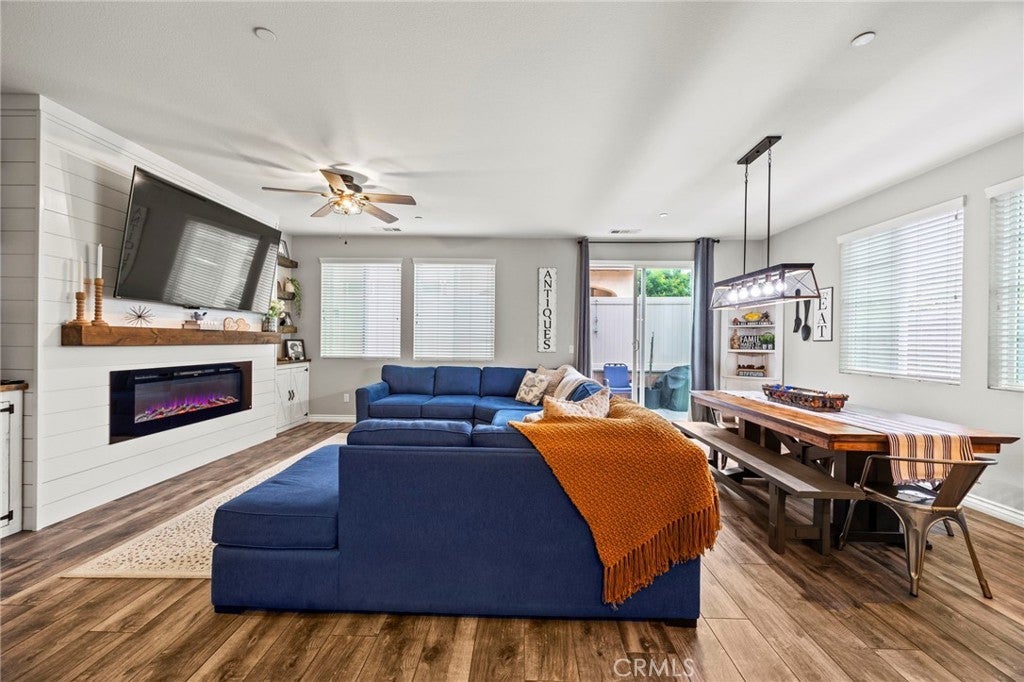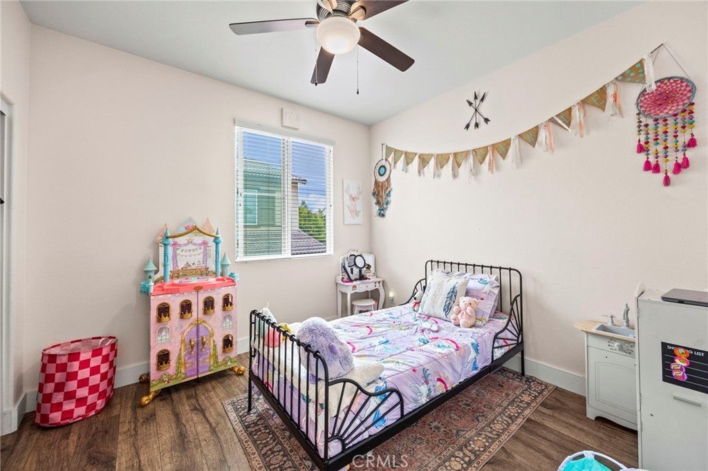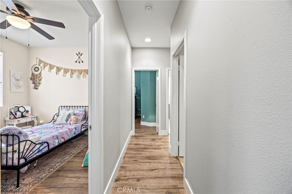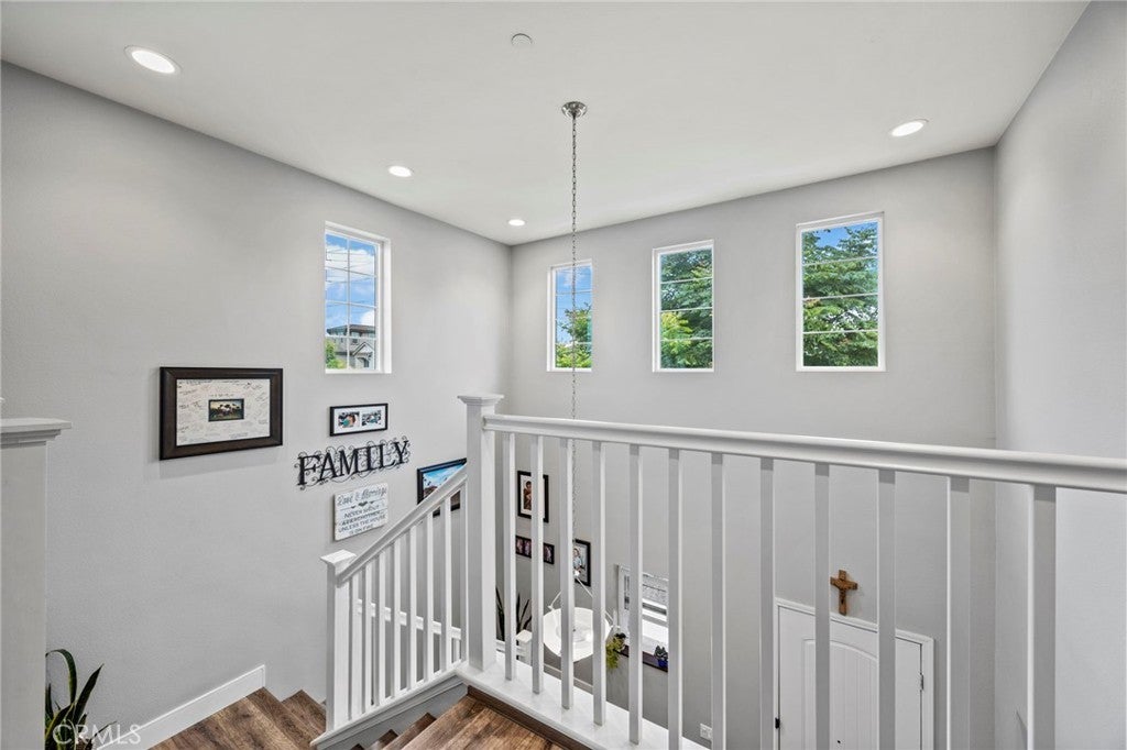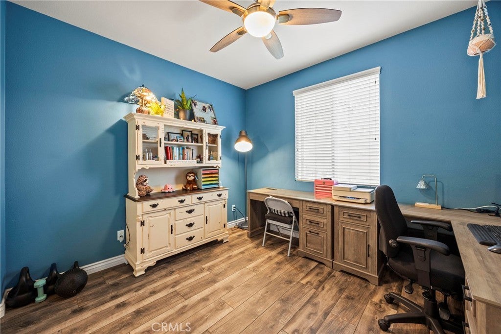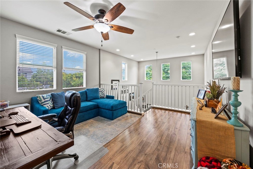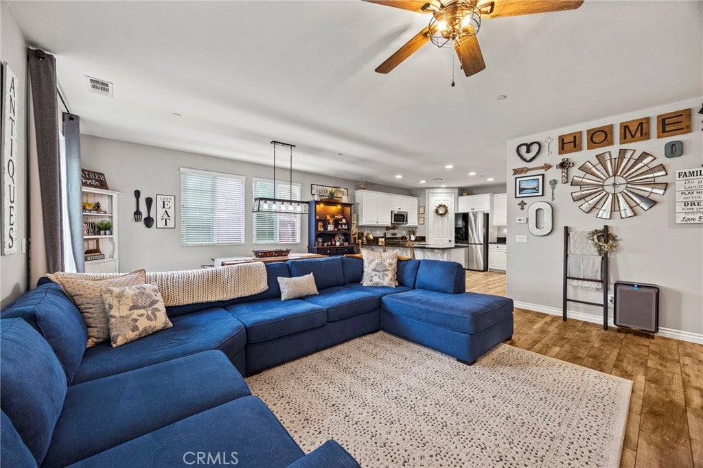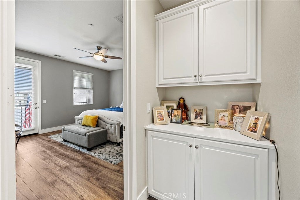 Welcome to this stunning 5 bedroom, 3 bath home nestled in the highly desirable Chino Preserve community. This light-filled, open-plan residence features vaulted ceilings and wood plank tile flooring throughout the main level. The gourmet kitchen is a chef's delight, boasting sleek granite countertops, stainless steel appliances, a sprawling bar style countertop and a walk-in pantry. A custom wood-paneled accent wall with built-in shelving flanks the cozy fireplace in living room, creating an elegant focal point. A versatile bedroom downstairs is perfect for guests, a home office or multi-generational living, while the upstairs laundry room adds daily convenience. Retreat to the generous master suite, complete with a private balcony, scenic views and a massive walk-in closet with custom shelving. Situated next door to a tranquil greenbelt park and just minutes from new schools and a recently developed shopping center. As part of the Preserve community, you'll also have access to resort style amenities including pools, tennis courts, parks, clubhouse and much more.