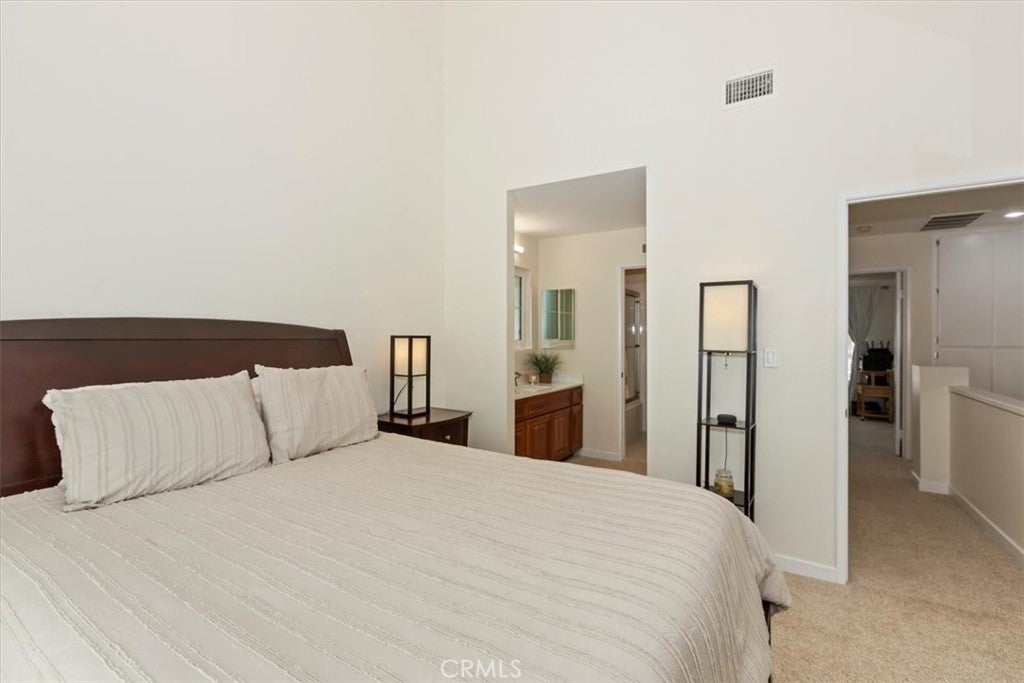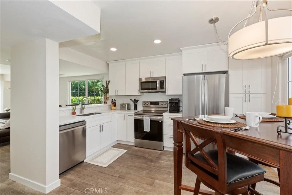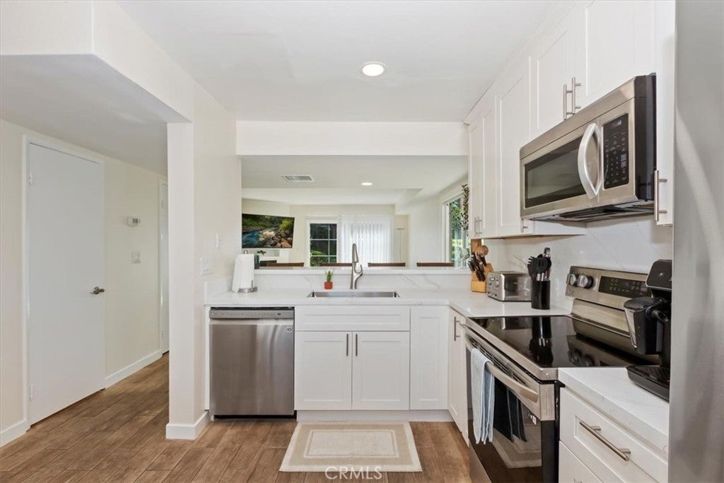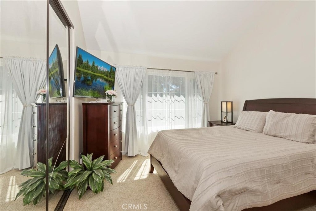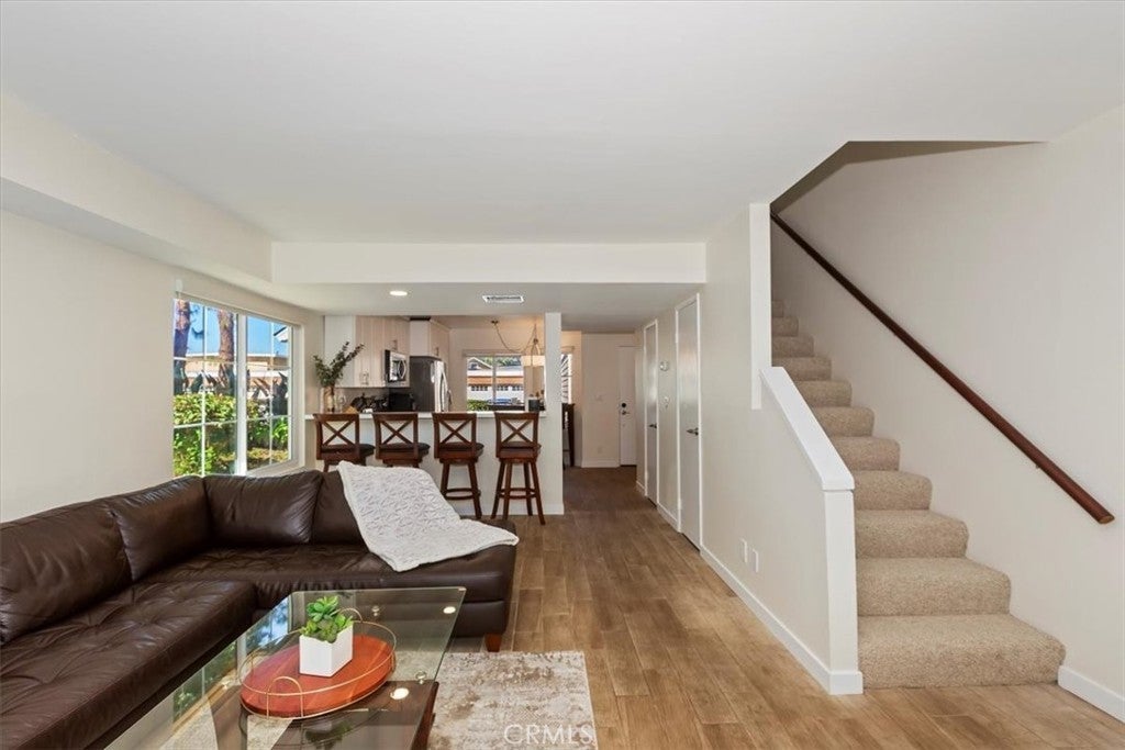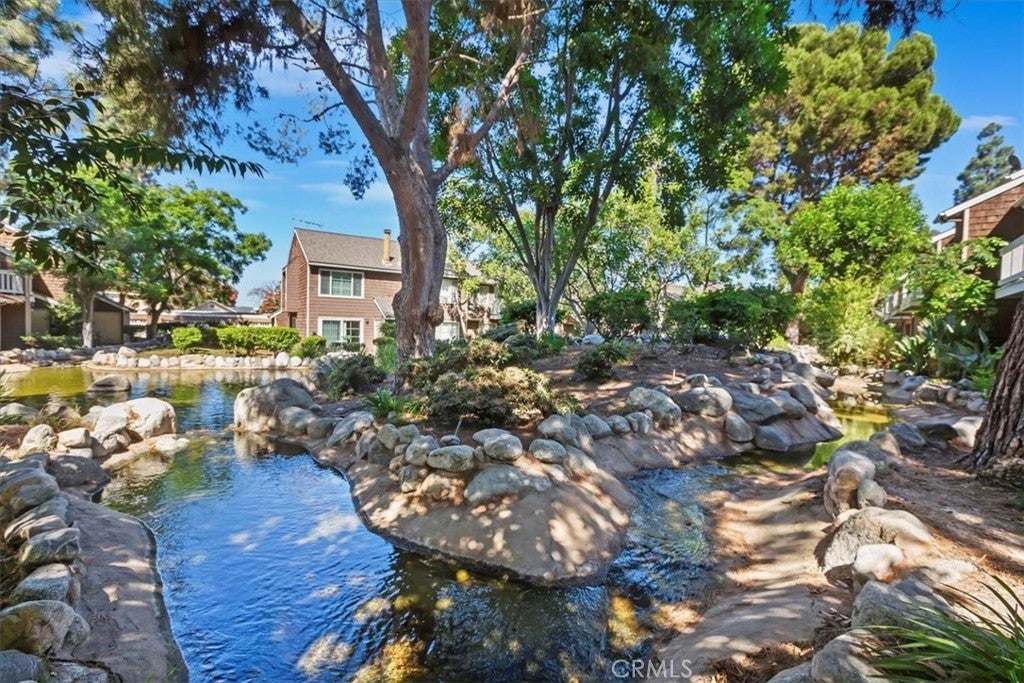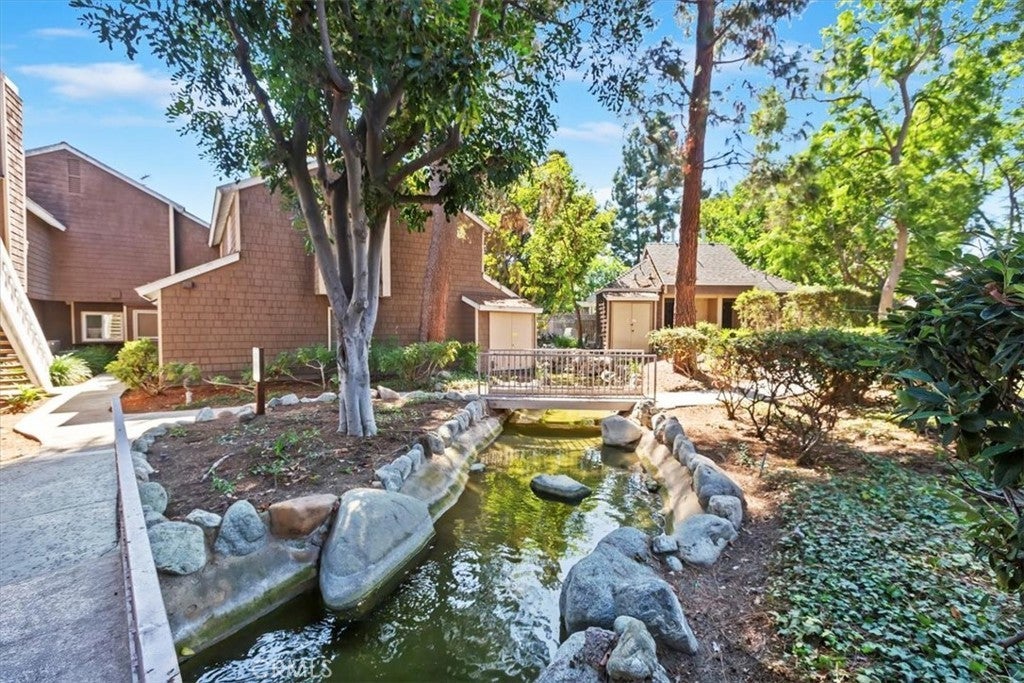 Welcome to this beautiful 2-bedroom, 1.5-bath condo, an ideally located end unit, with no neighbors above or below, offering privacy and tranquility in the sought-after Lake Grove community. From the moment you step inside, you'll notice the attention to detail and quality upgrades throughout. The spacious living room features fresh paint, and new flooring. The windows fill the room with natural light, creating an inviting and airy atmosphere. Enjoy cozy evenings by the elegant fireplace while appreciating the peaceful surroundings. You’ll love preparing meals in the beautifully remodeled kitchen, complete with striking quartz countertops, brand-new cabinetry, and high-quality stainless steel appliances. Upstairs, you'll find two comfortable bedrooms. The primary bedroom is generously sized with a cathedral ceiling, new carpet, fresh paint, and scenic views from the window. The remodeled full bathroom includes a new vanity and flooring, plus a separate dressing area with an additional vanity and sink—perfect for busy mornings. A convenient half bath is located downstairs for guests, adding to the home's functionality and comfort. All windows throughout the condo have been recently replaced to enhance energy efficiency and ensure quiet, restful nights. Step outside onto the patio—located next to one of the community’s peaceful ponds—and enjoy the tranquil water features, including waterfalls, mature trees, and lush landscaping. Lake Grove offers a retreat-like atmosphere with its tranquil ponds, beautiful landscaping, and serene walking paths. You’ll have access to a sparkling pool—perfect for relaxing or enjoying the sun. The condo also includes a valuable two-car garage, providing secure parking and additional storage space. Enjoy the security and peace of mind provided by this wonderful, gated community. Located in the heart of Garden Grove within walking distance to the historic Downtown Main St. scene with the popular Friday Night car show, the lively Sunday Farmers Market and nearby are the Amphitheater and trendy Steel Craft. Come see this exceptional condo …you won’t be disappointed!