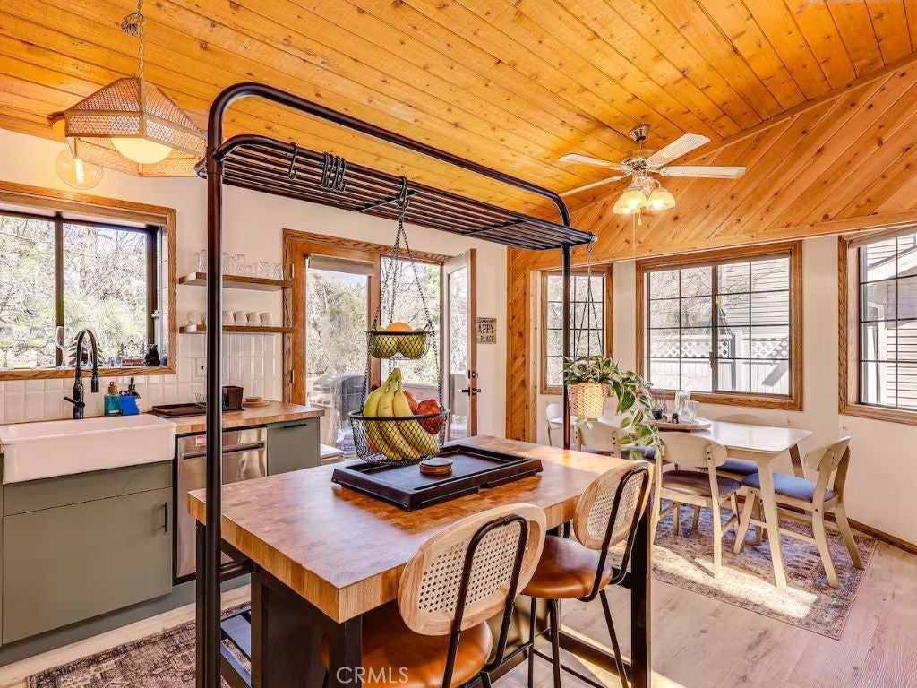 Welcome to 452 Orange Avenue, a beautifully updated 2-bedroom, 1-bath cabin tucked away in the quiet mountain community of Sugarloaf. This home combines rustic Big Bear charm with modern comforts, making it the perfect retreat, rental, or year-round residence. Step inside to soaring vaulted ceilings with exposed wood beams, updated flooring, and a cozy fireplace that sets the tone for mountain living. The upgraded kitchen features butcher block counters, open shelving, and plenty of storage—ideal for home-cooked meals or entertaining guests. Both bedrooms provide peaceful retreats, while the remodeled bathroom offers a modern spa-like touch. Outside, enjoy the fresh mountain air from your spacious deck and fully fenced yard. As a BONUS - Furniture can be included in the sale! Just minutes from Big Bear Lake, ski slopes, hiking trails, and The Village, this cabin is ideally located for adventure and relaxation. Whether you’re looking for a vacation getaway, an STR investment, or a full-time home, 452 Orange Avenue checks all the boxes. Don’t miss this rare opportunity to own a turn-key cabin in the heart of Sugarloaf!