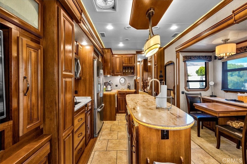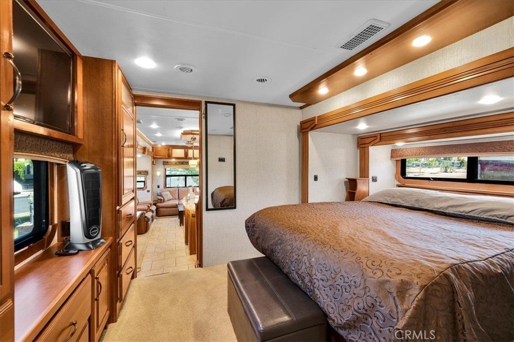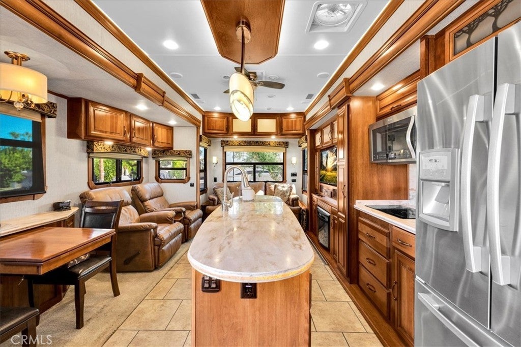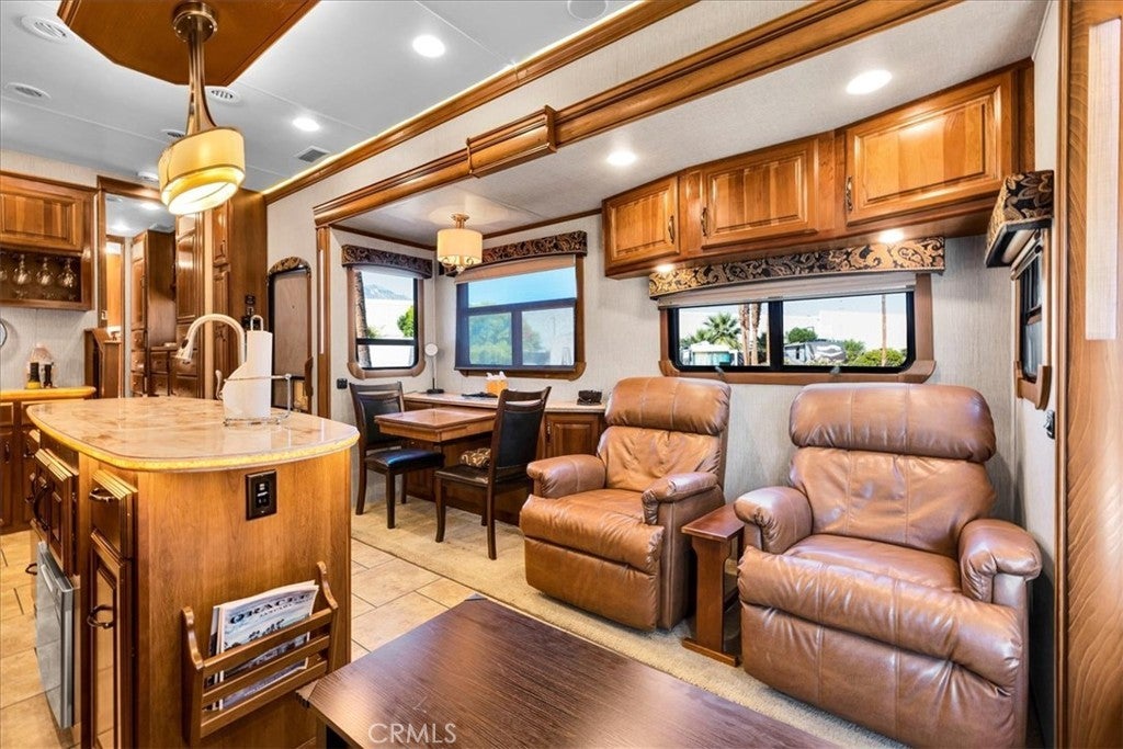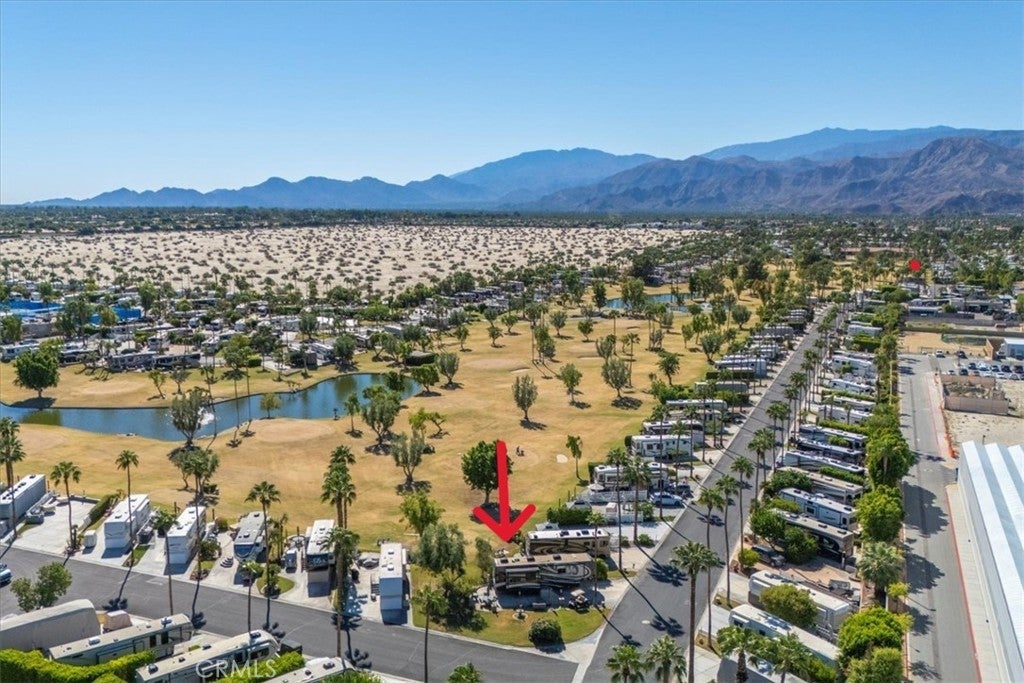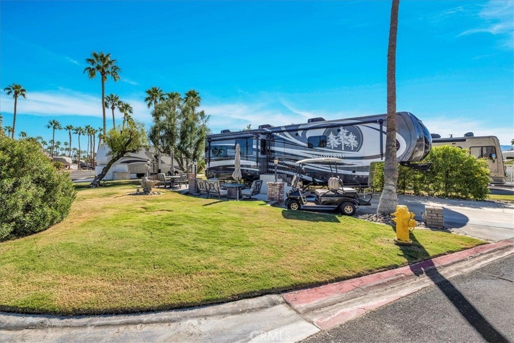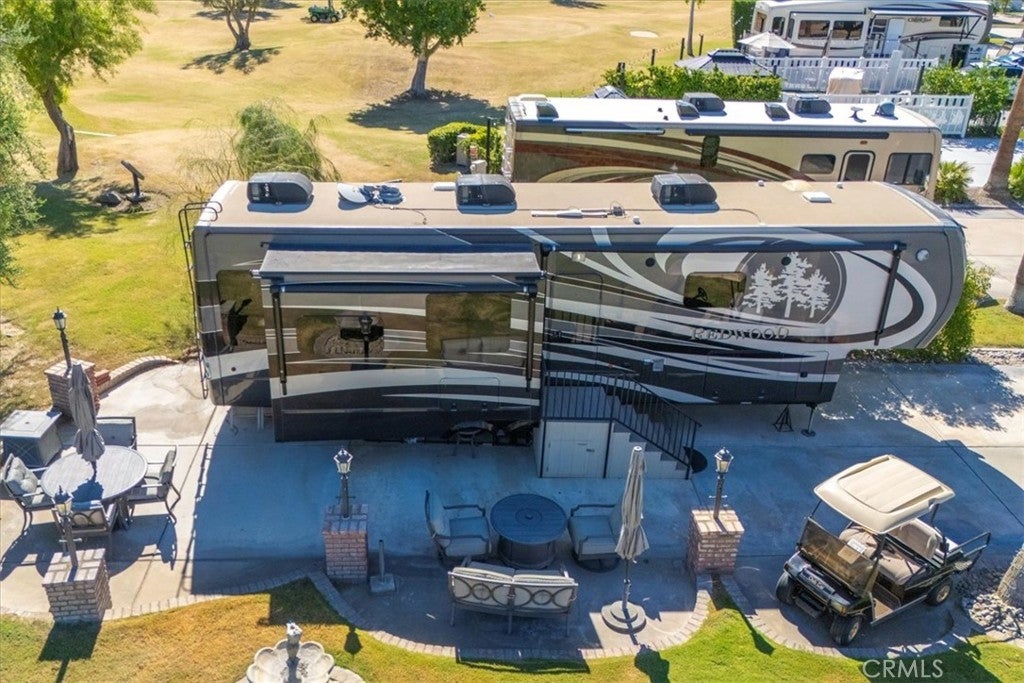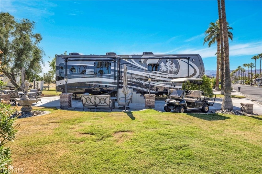 Beautiful Premium Expanded Corner Lot with Luxury Fifth Wheel & Resort Amenities! Discover this premium, low-maintenance expanded corner lot with a peaceful fountain view, located on the 8th tee box of the “Big 18” golf course in the vibrant, guard-gated Outdoor Resorts Palm Springs RV Resort Community. Included is a 2016 Crossroads Redwood Fifth Wheel, a stunning home-on-wheels offering residential quality finishes throughout — tile flooring, leather sofa and dual recliners, fireplace, flat-screen TV, and Jensen surround speakers. The open kitchen boasts granite countertops, full backsplash, center island, real wood cabinetry, electric stove, dishwasher, stainless-steel residential refrigerator, and a coffee & wine bar area. Enjoy meals at the wood dining table for four surrounded by windows with pull-down shades that fill the space with natural light. The king-size bedroom provides abundant wardrobe and drawer space, while the spacious bathroom/dressing area features dual sinks, large shower, and two storage areas (one plumbed for a stackable washer and electric dryer). A cedar-lined closet adds an elegant touch. Step outside to your luxurious patio retreat, complete with a love seat, two swivel chairs with thick cushions, firepit table, dining table for four, two umbrellas, and an additional firepit table — perfect for relaxing or entertaining under the desert sky. A reupholstered Club Car golf cart with cover is also included in this perfectly priced package. Beyond your lot, the resort offers an unmatched lifestyle on 137 beautifully landscaped acres, featuring:27 holes of executive golf, 10 tennis courts and 13 pickleball courts, 8 sparkling swimming pools, fully equipped state of the art fitness center, cafe, on-site salon/barber shop, two clubhouses hosting year-round activities, events, and entertainment. Whether you’re seeking an active social scene or a peaceful retreat, Outdoor Resorts Palm Springs delivers the best of both worlds. This is more than just a lot—it’s a lifestyle!