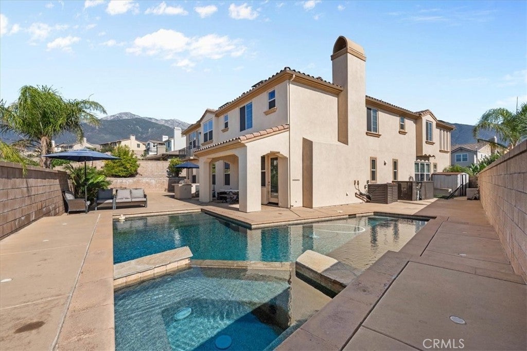 This home has everything you could desire — an amazing floor plan, breathtaking city and mountain views, and a beautiful pool and spa. Located in the private, gated community of Rancho Etiwanda Estates, this two-story home features a spacious foyer, guest bath, living room, and formal dining room. The kitchen offers an island with bar seating, a walk-in pantry, and opens to the family room, breakfast nook, and laundry room, which leads into the 3-car tandem garage. The lower level also includes a second staircase to the upper level and a bedroom with its own private bath, ideal for guests or multigenerational living. Upstairs, you’ll find a loft area perfect for a game room, three additional bedrooms each with their own bath, a workspace, and a luxurious primary suite. The primary suite features a sitting area with a fireplace, access to a private balcony, and a spa-like bath with dual vanities, a makeup counter, separate shower and tub, and two walk-in closets. Additional highlights include a porte-cochere leading to the courtyard, extra driveway parking, professional landscaping, a gas firepit, outdoor BBQ island, covered patio area, an in-ground pool with a baja shelf and pebble-tec finish, and an in-ground spa with a waterfall. Located in an award-winning school district and close to major shopping, dining, and entertainment — including Victoria Gardens, Ontario International Airport, and Toyota Arena. Every moment you wait, someone else could take your opportunity.