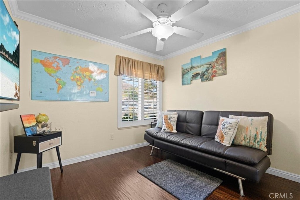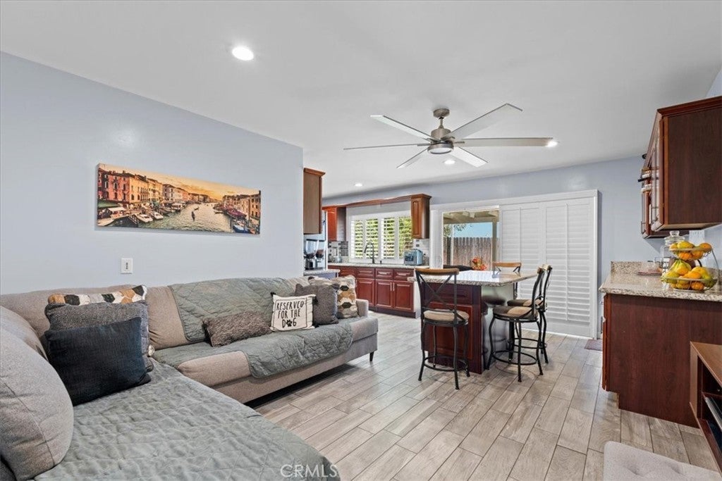 Updated single-story home ready for you to move in. The living room features a cozy fireplace and opens to a dining area with vaulted ceilings. The remodeled kitchen includes granite countertops, an island with a wet bar, and a bar seating area—perfect for entertaining. The spacious primary suite includes a converted bedroom that now serves as an impressive walk-in closet. Two additional bedrooms, a hall bathroom, and a dedicated laundry room complete the layout. Further highlights include upgraded tile flooring, recessed lighting, ceiling fans, and newer windows throughout. Conveniently located near the 91 Freeway, Hillcrest High School, shopping, and major employment centers. Schedule your appointment today!