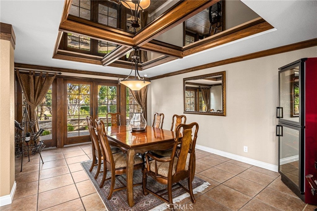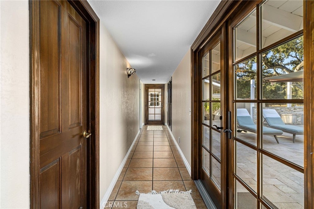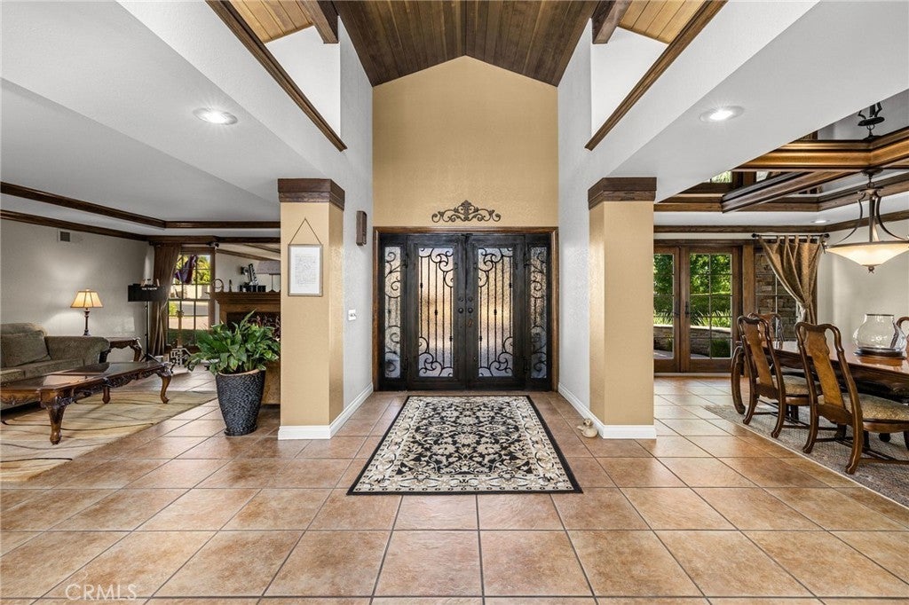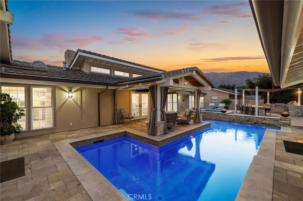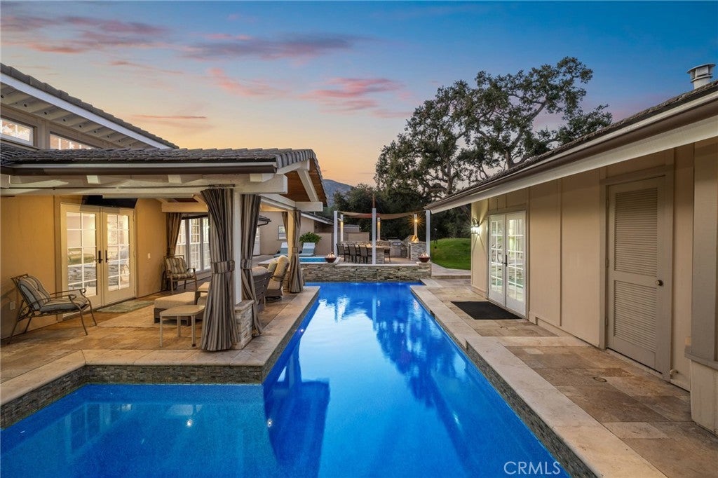 Custom California Ranch-Style Estate featuring a symmetrical façade, circular paver driveway, stacked-stone accents, and meticulous landscaping. Double iron-and-glass entry doors opens to a light-filled interior framed by floor-to-ceiling windows and wood-trimmed architectural columns, leading seamlessly into the formal living and dining rooms. The living room offers a tray ceiling with crown molding, a fireplace, and windows overlooking the front yard. The dining room offers a mirrored coffered ceiling and French doors that open to a front sitting area. The kitchen features custom wood cabinetry, granite countertops, stainless steel appliances, bar-top seating, and a breakfast nook with a built-in desk area. The adjacent family room offers a dramatic fireplace framed in granite, exposed white trusses, and wood-plank ceiling that blends architectural character. French doors and wood-framed, grid-style casement windows provide views and a seamless transition to the backyard. This wing also includes a bathroom with shower, a laundry room, and access to the three-car garage. On the opposite wing, an executive-style office showcases millwork, coffered ceilings, floor-to-ceiling built-ins, and richly stained cabinetry. The luxurious primary suite is a sanctuary–oversized and appointed with tray ceilings, dual sets of French doors, tall windows, and dual walk-in closets. The spa-inspired en suite bath features a jetted tub set beneath stained-glass windows, a walk-in shower, dual vanities with granite counters, and a double-sided fireplace shared with the bedroom. Additional bedrooms include one with an angled tongue-and-groove plank ceiling, and another with a tray ceiling. The hall bathroom features granite countertops, a frameless walk-in shower, and a jetted tub. The private, resort-style backyard is designed for elevated living–an expansive outdoor retreat ideal for entertaining or everyday luxury. A sleek PebbleTec pool is the centerpiece, paired with a stacked-stone spa, dramatic fire bowls, and cascading water features. A covered cabana lounge with vaulted wood ceiling, recessed lighting, heaters, and drapery offers a year-round outdoor living experience. A built-in BBQ island with stainless appliances, a fire table, sail shades, and paver decking sits beneath a majestic oak tree with views of hillside vistas. The detached three-car garage sits beyond a private gated driveway, where a putting green adds the final touch to this extraordinary estate.