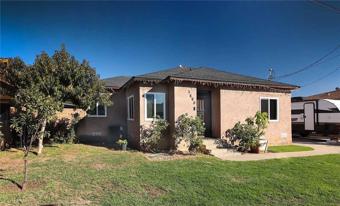 Your Dream Home Awaits – Affordable, modern, and Full of Possibilities! Discover this cozy 2-bed, 1-bath starter home with potential. Nestled on a small cul-de-sac in a rural neighborhood yet convenient location, it’s close to amenities, including easy freeway access, and The Shops at Jurupa Valley, a new vibrant 32-Acre shopping destination with anchor tenants such as Target, In-N-Out, Pollo Campero, Ross, Burlington, and more. This location is close to everything but feels like a tiny but mighty spot for family life, farm animals, and more. Lovingly updated, this home has laminate flooring, ceiling fans, AC, new windows, new roof, and a stylish front living room. Step outside to a versatile backyard with room for your outdoor lifestyle: a spacious plywood-covered patio with decorative tiled concrete, ideal for creating an outdoor kitchen or entertaining space, perfect for family gatherings or even a “dirty kitchen”. The yard also features a chicken coop, dog kennel, turf play area, raised garden beds, and room for a pool. Grow your own food with an impressive array of fruit trees, including Avocado, Orange, Myers Lemon, Mexican Lemon, Guava, Apple, Blood Orange, Pomegranate, Pear, Plum, and Nectarine, all supported by front-yard sprinklers. With a spacious front driveway for a RV parking (37' is likely max length) and room for a detached garage or an ADU. As One of the most affordable homes in the area, it’s perfect for first-time buyers, growing families, or savvy investors. Don’t miss out—join us at the open house and envision your future in this welcoming, opportunity-filled home!