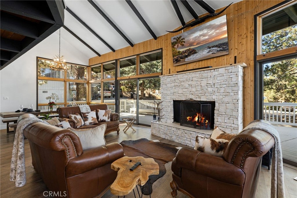 Escape to the pines and discover this completely reimagined mountain home, nestled on a peaceful cul-de-sac just minutes from the heart of Wrightwood. Every corner of this property has been thoughtfully updated with more than $150,000 in recent improvements, blending timeless cabin charm with sleek, modern sophistication. The moment you step inside, you’re welcomed by a soaring great room framed by floor-to-ceiling windows, vaulted wood-beamed ceilings, and a striking white stone fireplace. Natural light pours across the open-concept living area, highlighting new wide-plank flooring and rich wood accents that create warmth and character. The designer kitchen offers the perfect mix of rustic and refined with quartz-style counters, contemporary black fixtures, and open shelving—ideal for both quiet mornings and lively gatherings. Step outside to a covered wraparound deck with expansive forest and mountain views, complete with a private hot tub and barbecue space—a dream setting for entertaining, stargazing, or unwinding after a day on the slopes. Downstairs, the finished basement features a second fireplace, flexible living space, and a private entry—perfect for guests, extended family, or a potential rental suite. Each of the bedrooms offers a cozy retreat, while the updated bathrooms boast modern tile, custom vanities, and matte black finishes worthy of a designer magazine. Practical touches include a covered carport, abundant wood storage, and easy access to hiking, skiing, and the village—giving you the best of both relaxation and adventure. Whether you’re looking for a luxury full-time residence, vacation home, or investment getaway, this property captures the essence of Wrightwood living—where mountain charm meets modern comfort.
