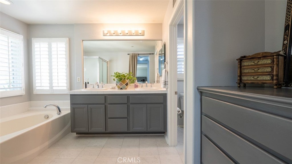 Nestled in the highly sought after Canyon View gated community with 24/7 security, this beautifully maintained 4 bedroom, 3 bathroom home offers stunning mountain views and an inviting atmosphere throughout. Step inside to find a bright, open layout featuring new quartz countertops, elegant window shutters, and stylish crown molding. The spacious kitchen offers a center island, ample cabinetry, and a dedicated dining area that opens to a cozy family room with a fireplace perfect for relaxing or entertaining. The main floor includes a bedroom and full bath, ideal for guests or multi generational living. Upstairs, the primary suite boasts breathtaking views, dual closets, and a luxurious ensuite with dual sinks, soaking tub, and separate shower. Two additional bedrooms share a full hall bath with dual sinks, and the upstairs laundry room with a sink adds convenience. Enjoy outdoor living in the private backyard featuring a built in BBQ and patio area, perfect for gatherings. Additional highlights include dual pane windows, recessed lighting, a commercial grade fire sprinkler system, and a 3 car attached garage with direct access. Community amenities include a sparkling pool, spa, playground, and clubhouse all within minutes of schools, parks, and shopping.