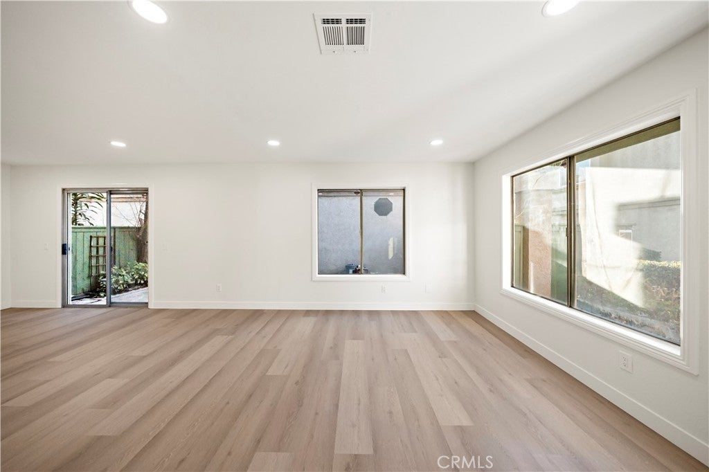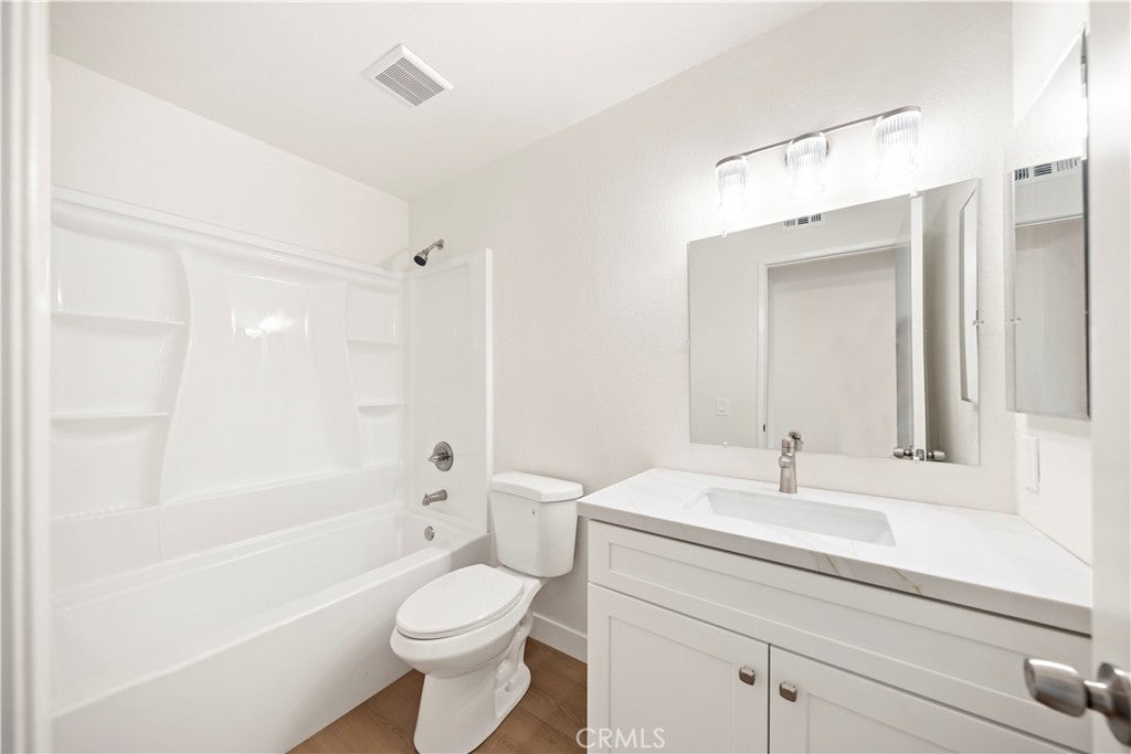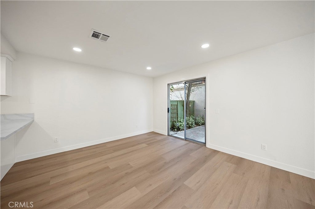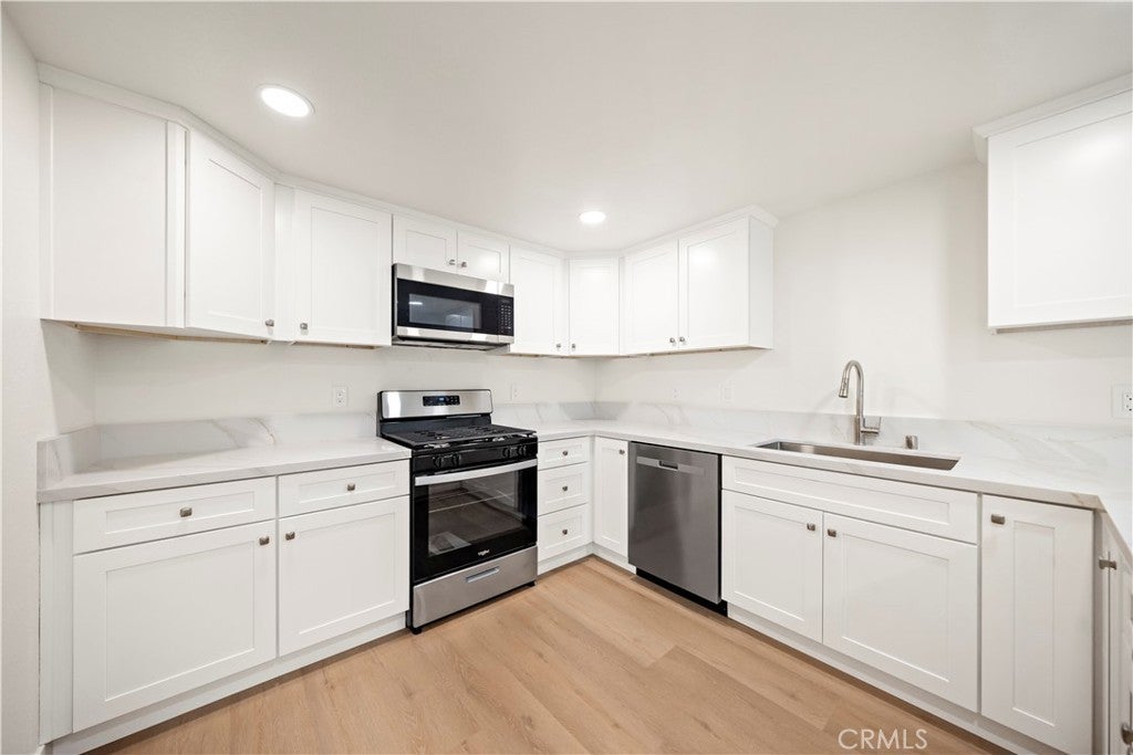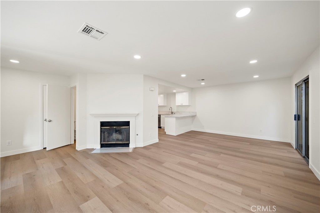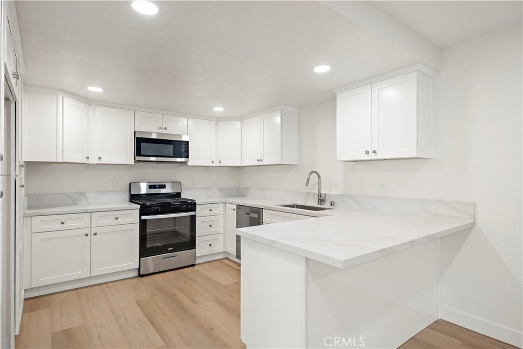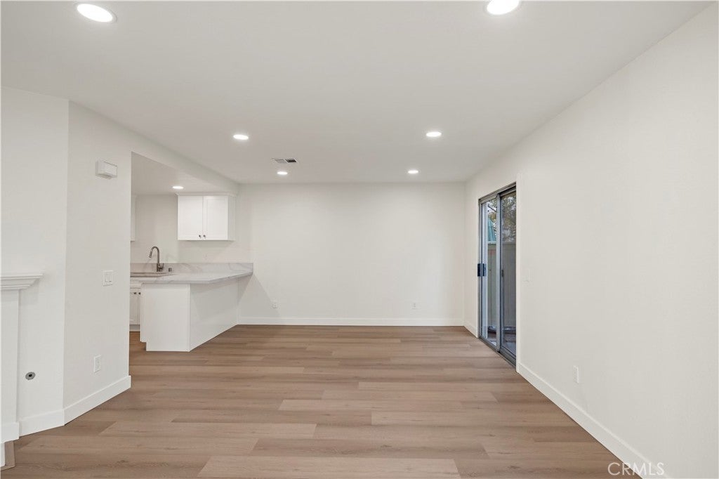 Remodeled two-story home in the Meadowood Village community of Rancho Cucamonga. The main level features an open living and dining area with fireplace, recessed lighting, and new luxury vinyl plank flooring throughout. The updated kitchen offers white shaker cabinetry, quartz countertops, stainless steel appliances, and a peninsula with bar seating. A sliding glass door opens to a private patio with hardscape and perimeter fencing. All bedrooms are located upstairs, including a primary suite with en-suite full bathroom. Secondary bedrooms feature sliding-door closets and updated lighting. Bathrooms have been refreshed with quartz vanities, modern fixtures, and tub/shower combinations. Interior improvements include fresh paint, updated finishes, and central air conditioning. The property includes a detached two-car garage and is located within an HOA community offering pool, spa, tennis courts, greenbelt paths, and common landscaped areas. Convenient access to nearby parks, shopping, dining, and major roadways.