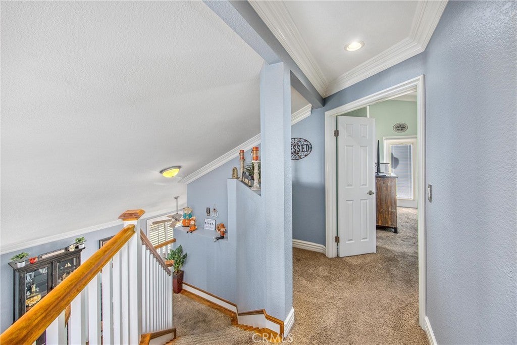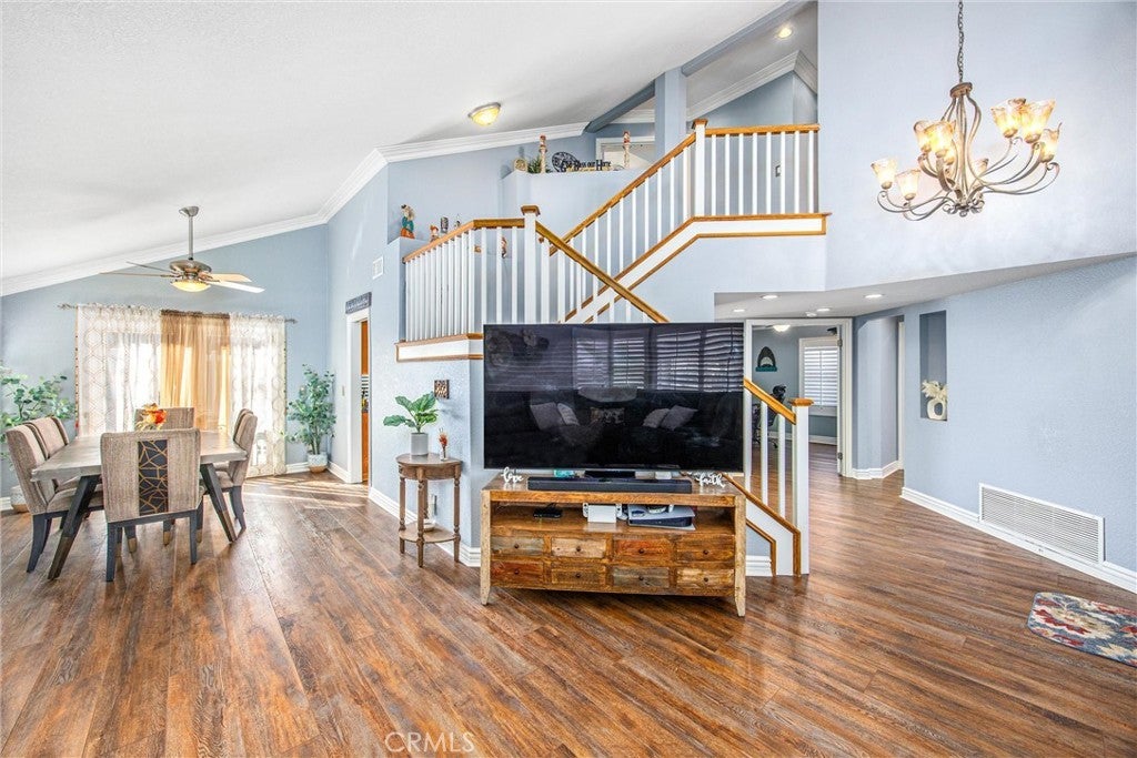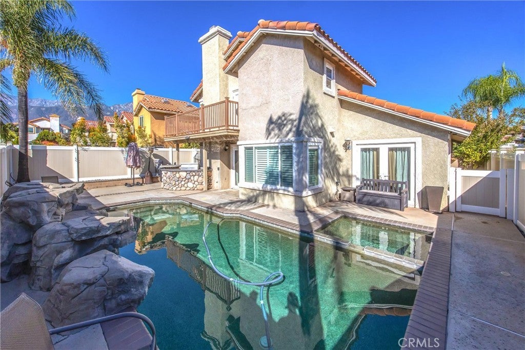 Welcome to this stunning 4-bedroom, 3-bath home located in one of Rancho Cucamonga’s most sought-after neighborhoods. The formal living and dining rooms are perfect for entertaining, featuring plantation shutters and laminate flooring throughout the lower level. The kitchen offers granite countertops and a cozy breakfast nook that opens to the family room, complete with a warm and inviting fireplace. A convenient downstairs bedroom and bath make an ideal space for guests, an office, nanny, or in-law suite. Upstairs, you’ll find the remaining spacious bedrooms, including a Jack-and-Jill setup and a beautiful primary suite. The primary bedroom boasts a romantic balcony overlooking the backyard and stunning mountain views. The recently updated primary bath features a custom closet, walk-in shower, dual sinks, elegant mirrors, and a stylish vanity. Step outside to the entertainer’s backyard with a built-in BBQ and a sparkling Pebble Tec pool and spa — perfect for relaxing or hosting gatherings. Located in the highly rated Los Osos school district, this home offers easy access to shopping, dining, and the 210 freeway. Enjoy peaceful neighborhood walks and all the amenities this exceptional home has to offer.