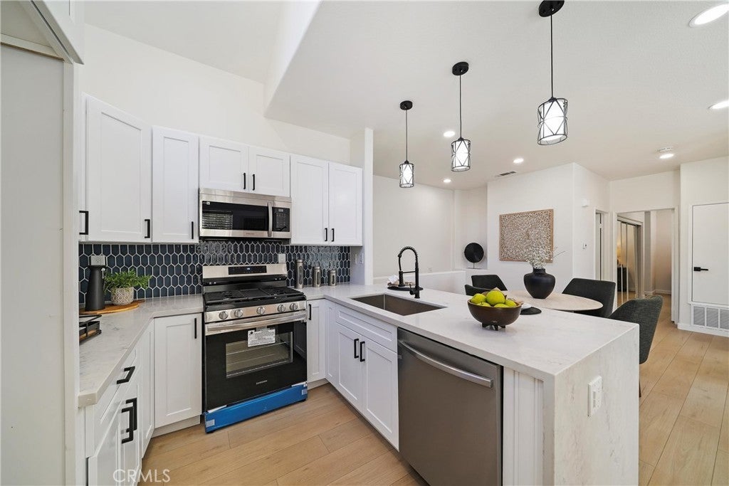 Beautiful, Turn-Key upper-end unit, 2-bedroom, 2 bath condominium in the prestigious St. Tropez community of Aliso Viejo. This Condo has been fully renovated. Upgrades include new electrical throughout, new kitchen, new bathrooms, flooring, paint, and much more. Carriage style is located above garages. Direct garage access leads to an inside formal entryway with coat closet and a stairway to the main floor, where you'll reach the spacious dining and living rooms. The living room features a gas fireplace and Access to the relaxing exterior deck. Kitchen features brand new cabinets, waterfall quartz, a breakfast bar, and brand-new stainless steel appliances. Indoor laundry with washer and dryer included. A direct-access garage includes extensive cabinetry, an extra storage area, and epoxy flooring. The condo comes with 3 parking spots (Garage, driveway, and one dedicated spot). Community pool & spa complete with restrooms and showers, plus a short walk from Argonaut and Pinewood Parks with sprawling grassy fields, basketball courts, baseball fields & tot-lot and nearby walking trails too! Just minutes to the 73-toll road, Aliso Viejo Town Center, shopping, restaurants, resorts, and Laguna Beach!