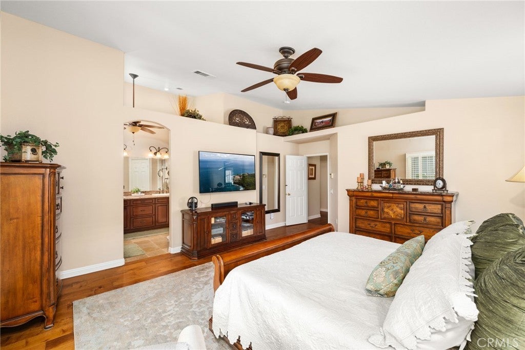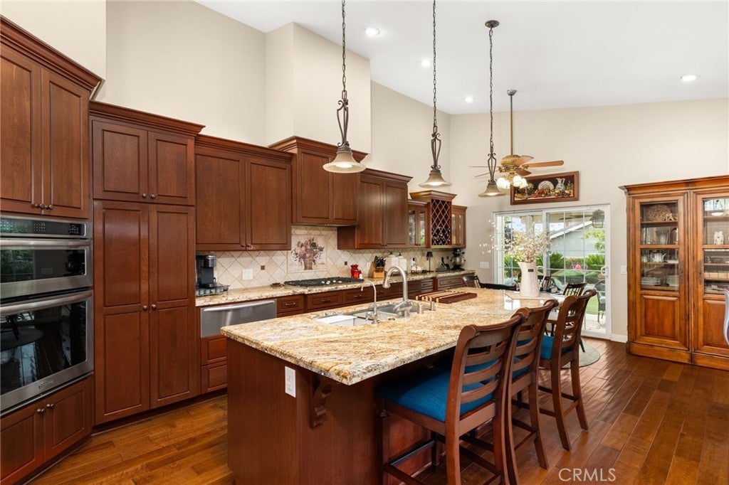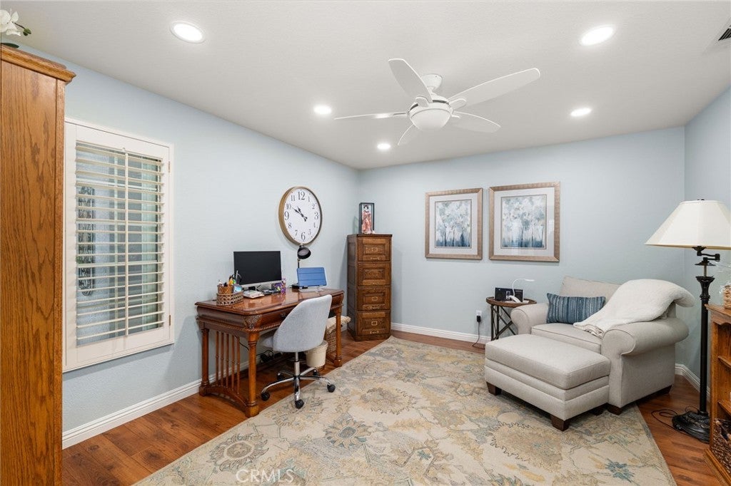 This is the one you’ve been waiting for! Situated on an oversized corner lot with gated RV parking and a 3-car garage, this stunning single-level home offers 3 bedrooms plus an optional bonus 4th bedroom/office, 2 beautifully upgraded bathrooms, and a sensational floor plan filled with exquisite finishes throughout. Step inside to discover newer dual-pane windows with wood shutters, engineered hardwood floors, upgraded lighting, custom cabinetry, and a gorgeous chef’s kitchen featuring an oversized island and convenient pull-outs throughout and 2 pantries for extra storage. The spacious living, dining, and family rooms flow effortlessly, creating the ideal environment for entertaining and everyday living. The family room is enhanced by a surround-sound system that also extends to the kitchen and back patio. The primary suite and secondary bath showcase tumbled stone tile and thoughtful upgrades. Outside is a true oasis. Enjoy beautifully manicured landscaping with mature fruit trees—avocado, peach, lemon, orange, and plum—as well as artificial turf and a charming rock stream for water runoff. The backyard is highlighted by an expansive Alumawood patio cover extending the full length of the home, complete with ceiling fans for year-round comfort. Two storage sheds are included, and the property offers room for an ADU. Additional upgrades include a new roof installed in 2020, Heavy-duty security screens and screen doors. Do not miss previewing this stunning home. From the wonderful curb appeal to the upgraded features that impress at every turn, this home truly has it all. Bring your pickiest buyers—this one will not last!