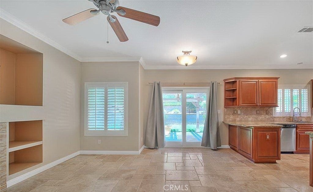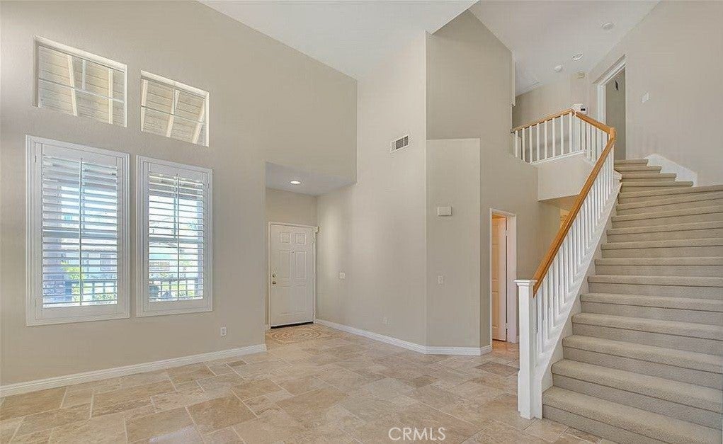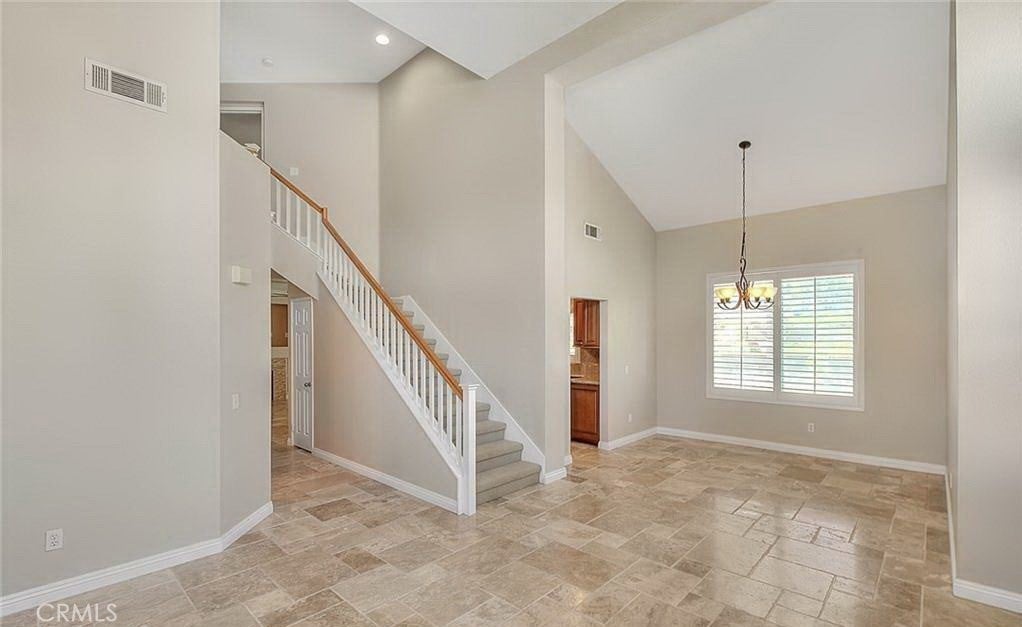 Fantastic Chino Hills property! This home features a great floor plan with 4 bedrooms (all on the upper floor) and 2 1/2 bathrooms (downstairs powder room). Tastefully done upgrades includes travertine flooring downstairs in the living room, dining area, kitchen, family room and laundry room. High ceilings as you enter create a spacious feeling to the living room and formal dining area. Kitchen has been remodeled with rich wood cabinetry, recessed lighting, decorative backsplash, stainless steel appliances and granite counters. The family room opens to the kitchen and there is a secondary informal dining space/breakfast nook. A cozy fireplace is in the family room, it has niches for components or decorative items and there are sliding doors that lead to the backyard and patio. Shutters and ceiling fans are notable extras in many of the rooms. Primary bedroom is nicely sized with high ceilings, shutters, on-suite bathroom that has walk in closet, dual sink vanity with decorative ship lap accent wall and upgraded flooring. Master bathroom has a soaking tub and a separate walk in shower with newer glass enclosure. There is a full guest bathroom upstairs with upgraded flooring and dual sink vanity. Powder room is located on the first level of the home & has pedestal sink & travertine floor. Convenient indoor laundry room with additional storage. The backyard is private with block wall fencing on all sides and the back additionally has vinyl fencing that provides additional privacy. Covered patio is a lovely setting for outdoor dining and entertaining. Chino Hills boasts award winning schools including desirable Wickman Elementary. For nature lovers this home is situated near Chino Hills State Park which offers hiking and biking in a beautiful setting of rolling foothills. 3 car garage along with generous driveway parking.