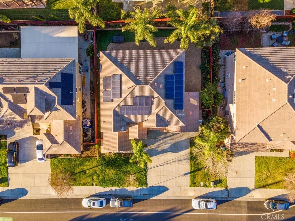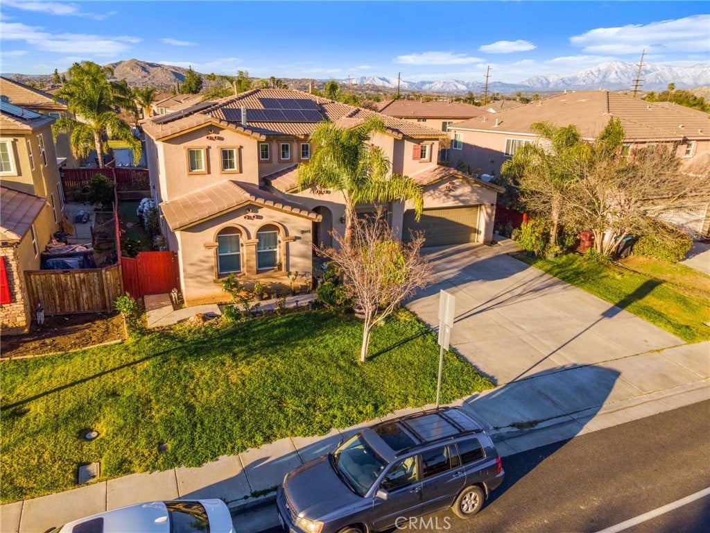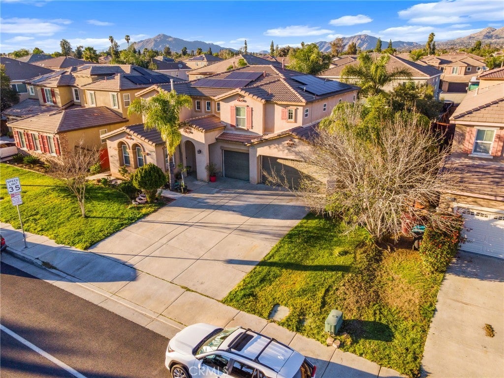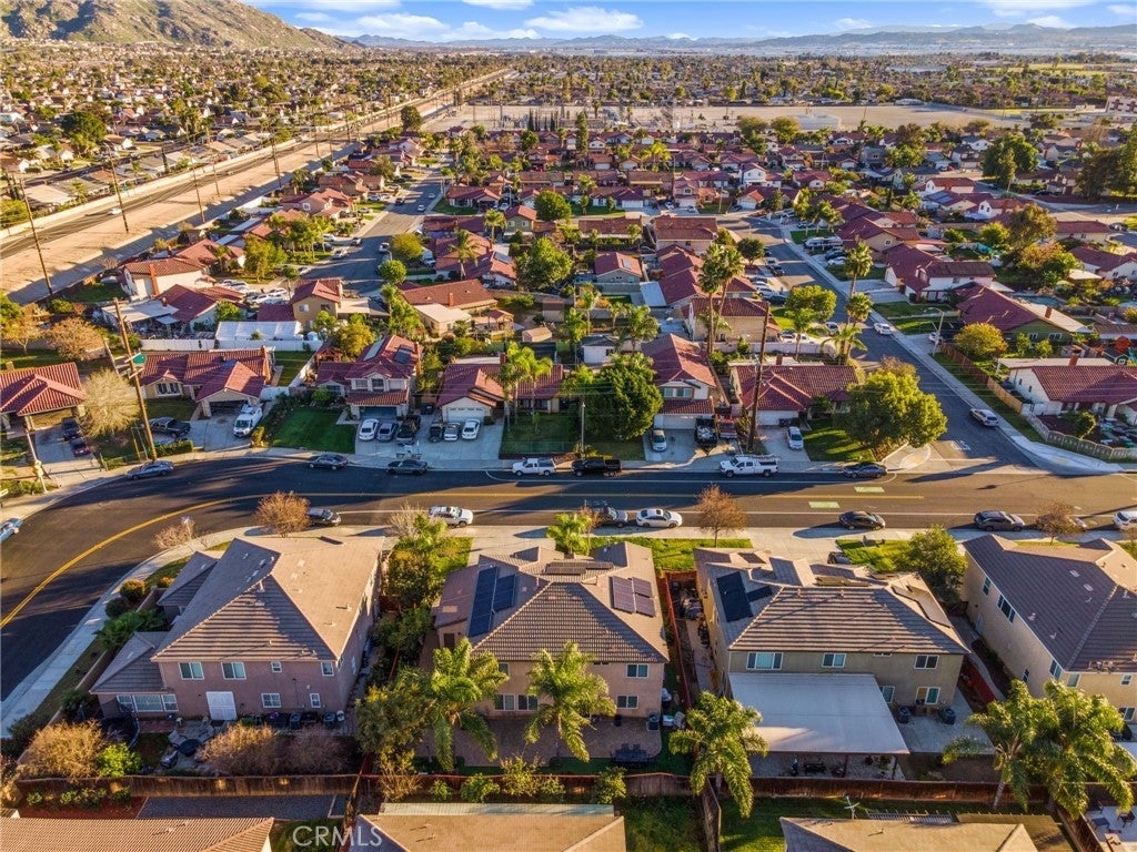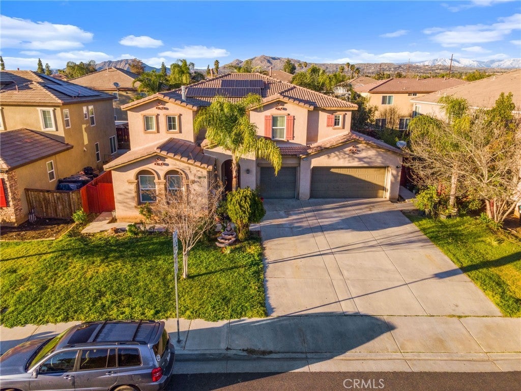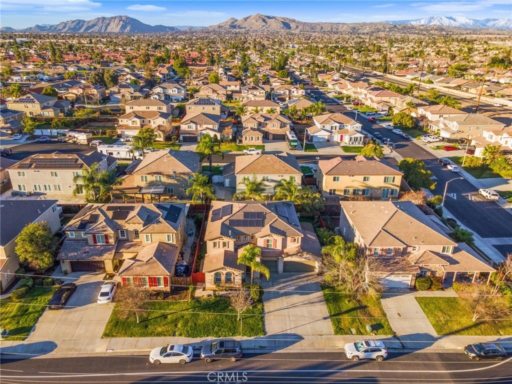 Welcome to this expansive and beautifully upgraded home in Moreno Valley offering exceptional space, functionality, and versatility. The main residence features 5 spacious bedrooms and 3.5 bathrooms, including a convenient Jack-and-Jill bathroom upstairs connecting two of the oversized bedrooms—perfect for added comfort and practicality. In addition, the property includes a fully permitted 1 bedroom, 1 bathroom ADU with its own private entrance and separate address, ideal for multi-generational living, rental income, guest quarters, or a private office setup. Designed with efficiency in mind, the home offers fully installed solar panels to help reduce energy costs and a generous 3-car garage for ample parking and storage. Step inside to a grand entry with soaring high ceilings that create an impressive first impression. The main level showcases rich wood flooring, recessed lighting, and an open-concept layout ideal for entertaining. The inviting living area is anchored by a cozy fireplace, while the chef-inspired kitchen boasts a massive center island, double ovens, abundant cabinetry, and expansive counter space that flows seamlessly into the dining and family areas. Upstairs features plush carpet throughout, massive bedrooms with impressive dimensions, a spacious loft perfect for a media room or additional lounge area, and a conveniently located, generously sized laundry room. The backyard is thoughtfully designed with low-maintenance artificial grass, palm trees, and ambient lighting, creating a private and inviting setting for gatherings or relaxing evenings. Located within an HOA community, this home delivers size, thoughtful design, energy efficiency, and built-in income potential all in one exceptional opportunity.