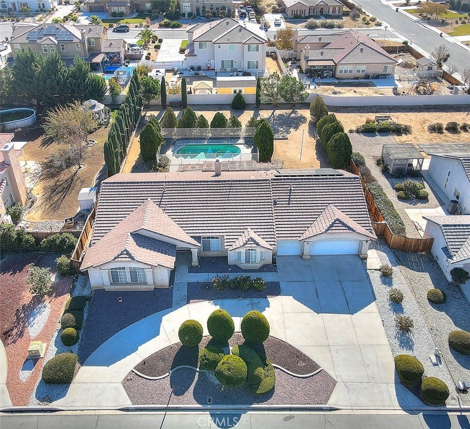 Welcome to this spacious 3,048 sq. ft. single-story ranch home situated on an expansive 18,025 sq. ft. lot, offering a highly functional layout and incredible potential. All bedrooms are located on one side of the home, featuring three large secondary bedrooms and an over sized primary suite with a sliding door to the backyard. The primary bathroom includes a separate tub and shower, dual-sink vanity, private toilet room, a generous walk-in closet within the bathroom area, plus an additional closet in the bedroom. The bedroom wing also includes a guest powder room and a full bath. Multiple living spaces include a large living room and a spacious family room that share a dual-sided fireplace, along with a formal dining area. The kitchen is exceptionally large with abundant cabinetry, a center island, pantry, and a generous dining area. Four sliding glass doors throughout the home offer great natural light and a seamless indoor/outdoor flow. A huge bonus room with its own attached bathroom sits on the opposite side of the home—ideal for multi generational living, a private guest suite, home office, gym, or creative space. Additional features include an individual laundry room and a four-car garage with a workshop area and a pass-through to the backyard. The expansive backyard features a pool, horseshoe pit, and plenty of room to customize. This single-story ranch home sits on a large horseshoe driveway lot and includes solar for added energy efficiency. A wonderful opportunity to make this home your own.