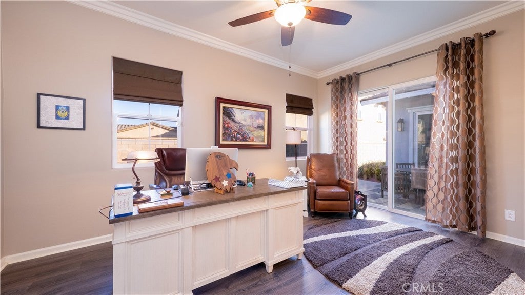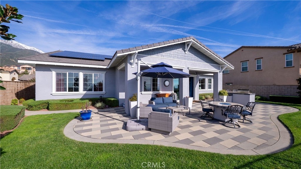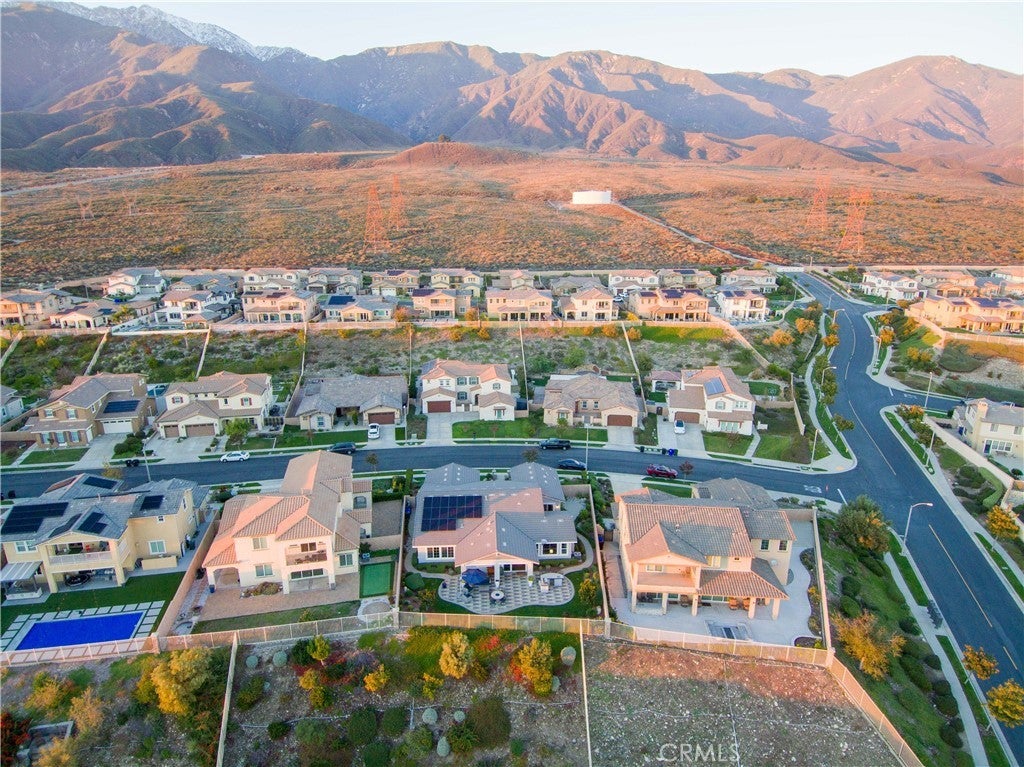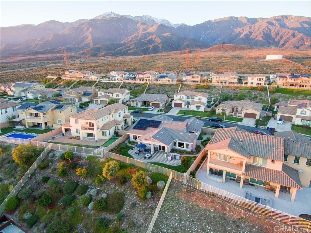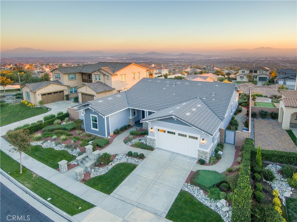 Rancho Etiwanda Estates Single Story with Spectacular City Light & Mountain Views. This beautiful single-story home sits in Rancho Etiwanda Estates and delivers rare panoramic city light and mountain views. The curb appeal is impressive, featuring custom professional landscaping, hardscape lighting in front and back, LED lighting wrapped around the exterior, and fresh paint inside and out. A large, inviting front porch captures a perfect mountain view, & the Ring doorbell adds convenience and security. Inside, the home offers 3 bedrooms plus a dedicated office. Crown molding runs throughout. High-quality Pergo flooring adds warmth, & every bedroom features a ceiling fan with lighting. Each bedroom features an en-suite bathroom with a custom walk-in shower, detailed tile work, linear drains, & frameless glass doors. All closets feature upgraded organizers. The primary bath features a separate walk-in shower and oversized soaking tub, dual vanities, a makeup station, and a large walk-in closet with custom shelving and shoe racks. The office is a peaceful retreat with a ceiling fan and direct access to the serene center courtyard. A large formal dining room with a centerpiece chandelier sets the stage for gatherings. The family room includes a cozy fireplace with a mantle, an oversized ceiling fan, a media niche, and another access point to the courtyard. Natural light fills this home, keeping it bright and welcoming throughout the day. The kitchen opens to the family room and includes a breakfast nook with a panorama door that expands the indoor-outdoor experience. The kitchen features include a center island with a breakfast bar, granite countertops, pendant lighting, a new sink, stainless steel appliances, a cooktop with range hood, and a generous walk-in pantry. 10-foot ceilings create a sense of space and ease. The home also includes a full interior sprinkler system for added safety. The 3-car tandem garage with custom-built-in cabinetry, epoxy-coated floor, a workstation, tankless water heater, 2 sun-powered battery packs at 13 kilowatts each. 18 solar panels produce 430 watts each. The home is also wired for an alarm system. The backyard is designed for enjoyment, and the views are unforgettable. The panorama door leads out to a BBQ island, firepit, custom pavers, detailed landscaping, hardscape lighting, and a California room with fan and lighting. The mountain and city light views are unobstructed and some of the best you will find.
