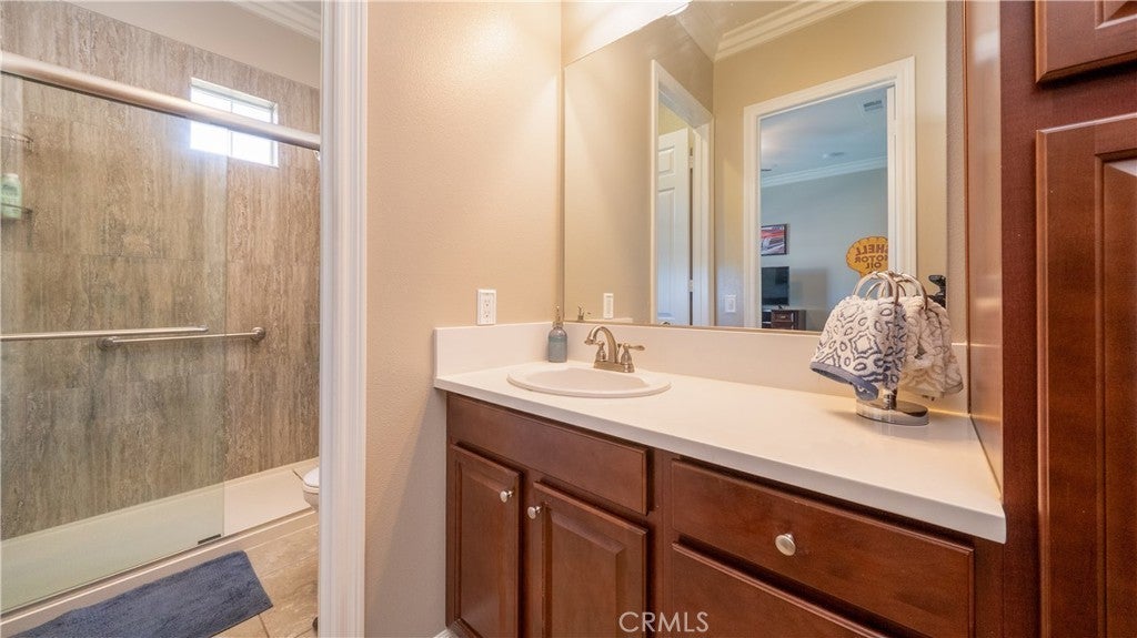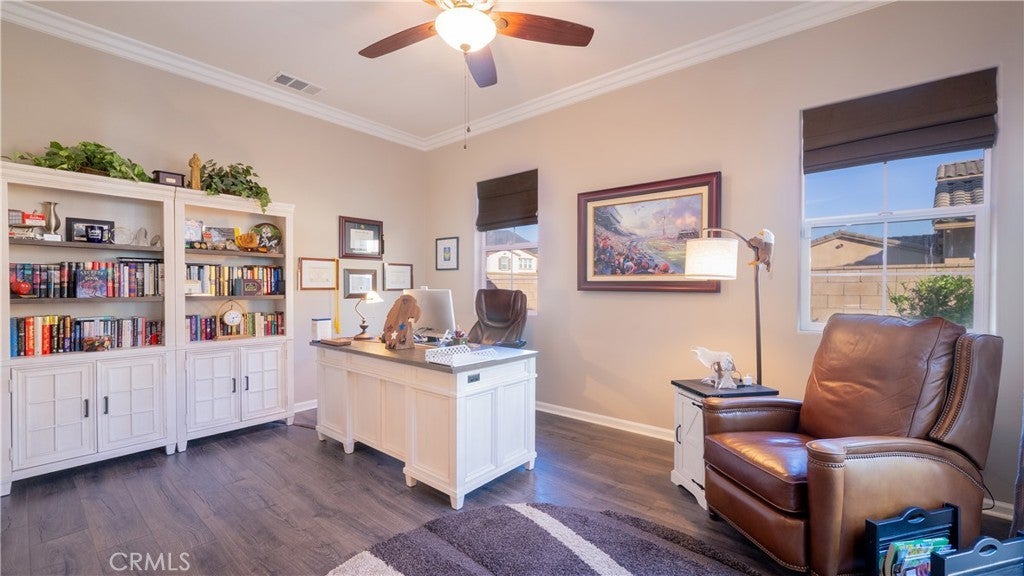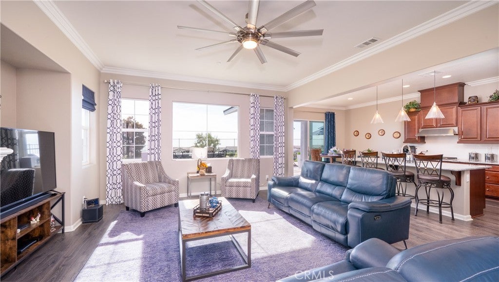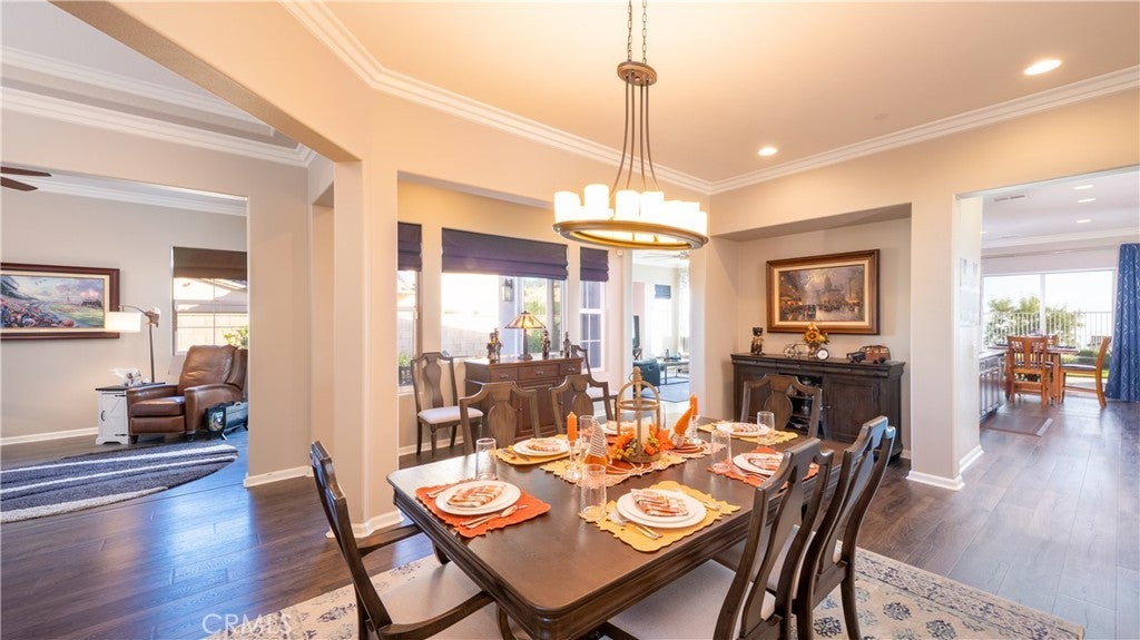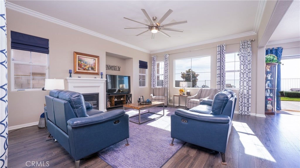 Rancho Etiwanda Estates Single Story with Spectacular City Light & Mountain Views. This beautiful single-story home sits in Rancho Etiwanda Estates and delivers rare panoramic city light and mountain views. The curb appeal is impressive, featuring custom professional landscaping, hardscape lighting in front and back, LED lighting wrapped around the exterior, and fresh paint inside and out. A large, inviting front porch captures a perfect mountain view, & the Ring doorbell adds convenience and security. Inside, the home offers 3 bedrooms plus a dedicated office. Crown molding runs throughout. High-quality Pergo flooring adds warmth, & every bedroom features a ceiling fan with lighting. Each bedroom features an en-suite bathroom with a custom walk-in shower, detailed tile work, linear drains, & frameless glass doors. All closets feature upgraded organizers. The primary bath features a separate walk-in shower and oversized soaking tub, dual vanities, a makeup station, and a large walk-in closet with custom shelving and shoe racks. The office is a peaceful retreat with a ceiling fan and direct access to the serene center courtyard. A large formal dining room with a centerpiece chandelier sets the stage for gatherings. The family room includes a cozy fireplace with a mantle, an oversized ceiling fan, a media niche, and another access point to the courtyard. Natural light fills this home, keeping it bright and welcoming throughout the day. The kitchen opens to the family room and includes a breakfast nook with a panorama door that expands the indoor-outdoor experience. The kitchen features include a center island with a breakfast bar, granite countertops, pendant lighting, a new sink, stainless steel appliances, a cooktop with range hood, and a generous walk-in pantry. 10-foot ceilings create a sense of space and ease. The home also includes a full interior sprinkler system for added safety. The 3-car tandem garage with custom-built-in cabinetry, epoxy-coated floor, a workstation, tankless water heater, 2 sun-powered battery packs at 13 kilowatts each. 18 solar panels produce 430 watts each. The home is also wired for an alarm system. The backyard is designed for enjoyment, and the views are unforgettable. The panorama door leads out to a BBQ island, firepit, custom pavers, detailed landscaping, hardscape lighting, and a California room with fan and lighting. The mountain and city light views are unobstructed and some of the best you will find.