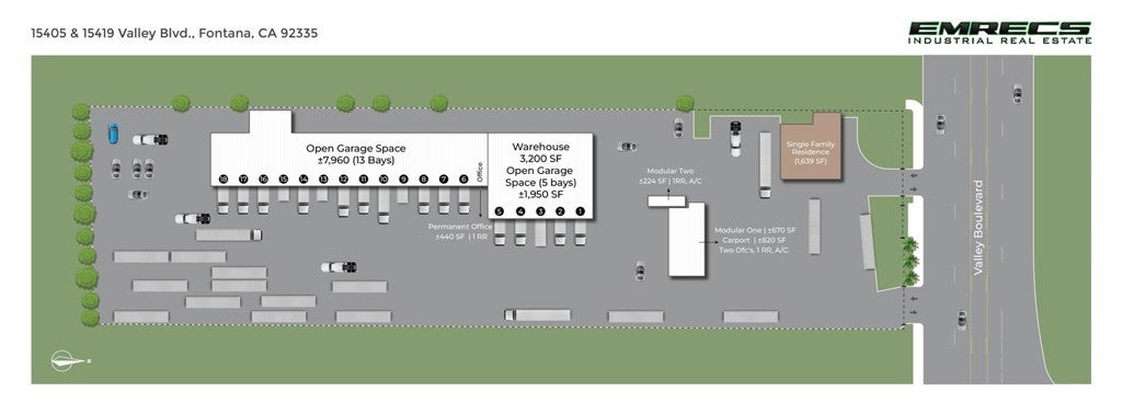 Exceptionally rare licensed truck and trailer sales facility in the heart of Fontana’s high-demand logistics and transportation corridor. Spanning ±2.39 acres across two legal parcels, this fully improved, street-front yard offers ±104,020 square feet of operational space designed specifically for commercial vehicle sales, leasing, and fleet maintenance. The property features a long-standing, city-approved “Trailer Sales” permit, giving tenants a significant advantage with expedited planning and zoning compliance—an increasingly scarce entitlement in today’s Inland Empire market. The site is highly functional and immediately ready for occupancy, offering an impressive ±9,910 SF of high-clearance covered canopy space spanning 18 bays suitable for vehicle display, washing, detailing, and light repair. Additional improvements include a ±3,200 SF warehouse with dual ground-level doors, ±1,950 SF open high-clearance garage, and multiple modular and permanent office structures totaling ±1,334 SF. A ±1,639 SF single-family residence provides added utility for an on-site manager or owner-user. Positioned along Valley Blvd with ±486 feet of frontage, the property delivers exceptional visibility in one of the nation’s busiest trucking submarkets, with traffic counts surpassing 35,000 vehicles per day. Conveniently located less than two miles from the I-10/I-15 interchange, the property offers seamless access to major regional freight routes and national distribution hubs. Ideal for truck/trailer dealers, fleet operators, logistics firms, or contractor uses seeking a plug-and-play environment in one of the Inland Empire’s most strategically located industrial zones.