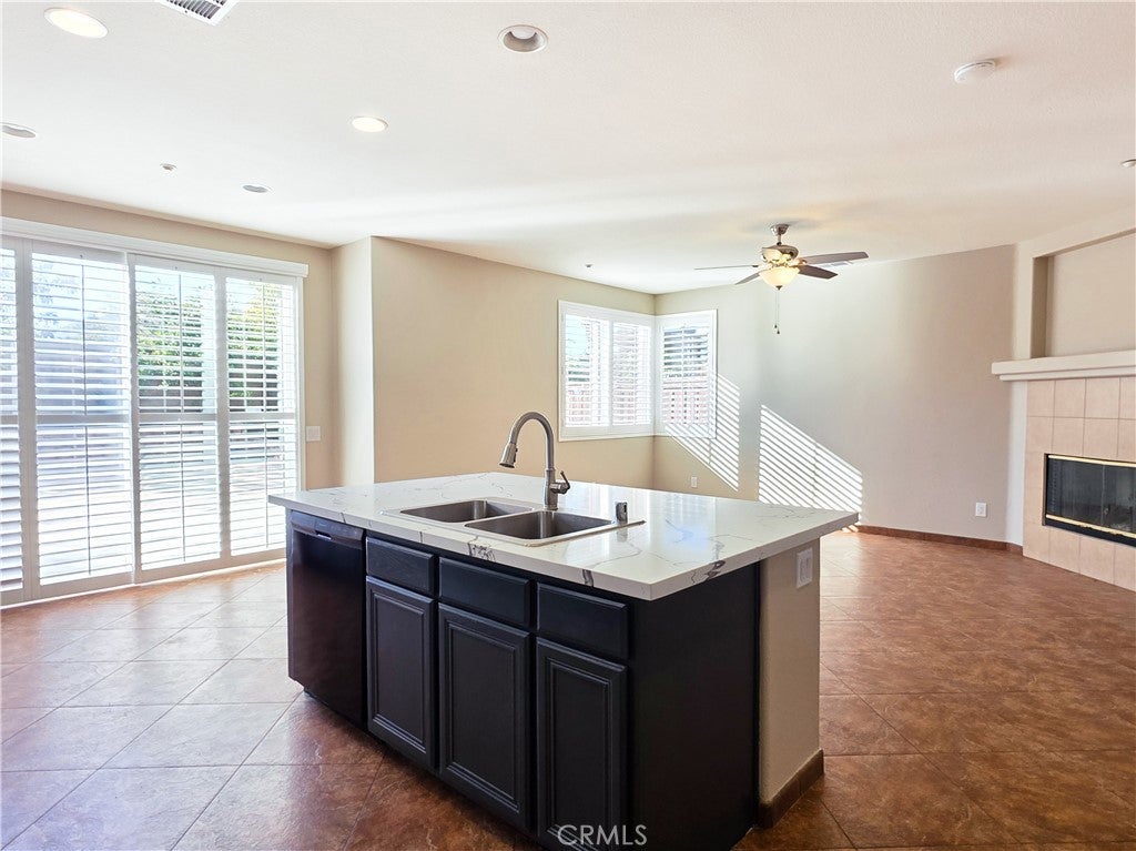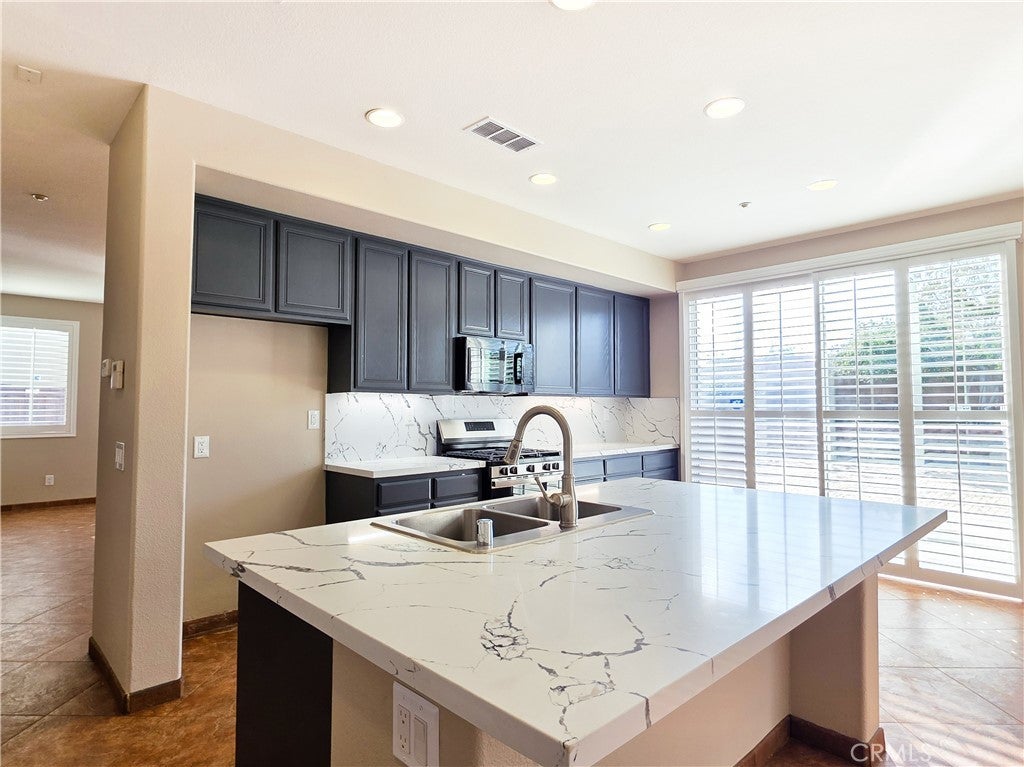 Move-in-ready 5-bedroom, 4-bath home with 3-car garage in the gated Tiburon community. Approx. 2,999 square ft with one bedroom and full bath on the main level. Kitchen features quartz countertops, island, and walk-in pantry, opening to the family room with fireplace and backyard access. Upper level includes additional bedrooms, a loft, and a laundry room. The primary suite offers dual vanities, a makeup station, soaking tub, walk-in shower, and two walk-in closets. Backyard features a fireplace, outdoor cooking area, pavers, and concrete hardscape. Interior features include tile flooring downstairs, vinyl flooring upstairs, large baseboards, and a new range. Low-maintenance front yard with artificial turf. Community amenities include a pool, playground, walking paths, and volleyball and basketball courts. Located near schools, parks, shopping centers, and local universities.