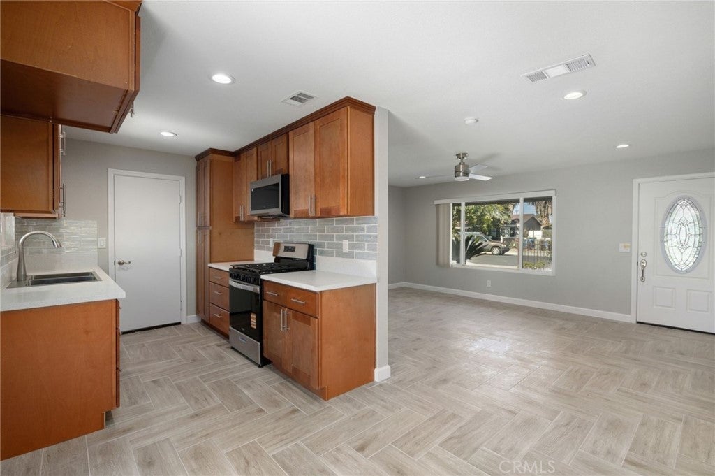 Beautifully Remodeled Home With Modern Upgrades and Expansive Outdoor Living Welcome to this impeccably remodeled single-story home, where modern comfort meets effortless style. From the moment you arrive, you’ll appreciate the brand-new roof, fresh exterior finishes, oversized driveway with pavers, and gated RV parking—offering both convenience and privacy. The inviting front patio and new dual-pane windows create exceptional curb appeal while flooding the interior with natural light. Step inside to a bright, open living space featuring new tile flooring laid in a stylish herringbone pattern, fresh paint, recessed lighting, and a contemporary ceiling fan. The fully upgraded kitchen is a true standout, showcasing new appliances, quartz countertops, sleek cabinetry, a gorgeous subway-tile backsplash, and direct access to the covered patio—perfect for indoor/outdoor living. All bedrooms and bathrooms have been thoughtfully refreshed, including a beautifully tiled shower with a mosaic niche and modern fixtures. The oversized single-car garage offers pristine epoxy flooring, tankless water heater, and ample room for storage or a workshop. Outside, enjoy a spacious, landscaped backyard with vibrant garden beds, mature trees, and a large open area ideal for entertaining, play, or future customization. A brand-new patio cover provides shade for relaxing afternoons, and the fully fenced yard offers peace and privacy. Additional upgrades include a new AC/heating system, new windows throughout, updated plumbing and electrical finishes, and more—truly a turnkey home with every major component replaced or improved. Conveniently located just 15 minutes from Soboba Hot Springs & Casino and under one hour to Palm Springs, this home blends comfort, style, and accessibility. Completely remodeled. Move-in ready. Packed with upgrades. Come see why this property stands out from the rest!