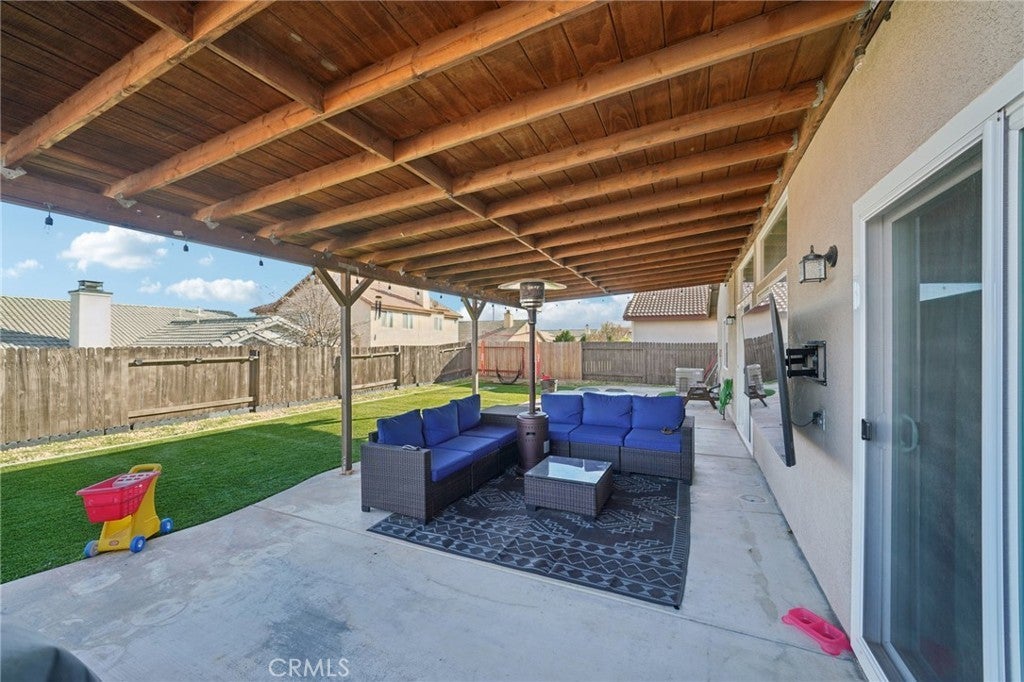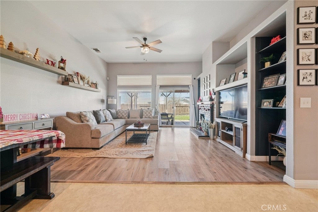 Situated on a desirable corner lot, this spacious and well-designed home offers comfort, privacy, and an ideal layout for everyday living and entertaining. The inviting living room welcomes you with laminate flooring throughout the main living areas and plush carpeting in the bedrooms. Just off the foyer is a bedroom with an en suite bathroom. At the heart of the home, the spacious kitchen features stainless steel appliances, a large center island with bar seating, and opens seamlessly to the dining area and family room. The family room is anchored by a charming brick-framed fireplace with built-in media shelving for a cozy gathering area. A sliding door leads to the expansive covered patio, offering ample room for outdoor dining, play, BBQs, and entertaining. Two additional bedrooms and a full bathroom are located on one side of the home, while the oversized primary suite is privately situated on the opposite end. The primary retreat features a slider with direct patio access, a generous walk-in closet, and an en suite bathroom complete with dual-sink vanity, soaking tub, and separate shower. The backyard is designed for low-maintenance enjoyment with artificial turf and two side yards ideal for storage or a dog run. Additional highlights include a laundry room off the kitchen with direct access to the garage. Conveniently located near schools, shopping, dining options, and with easy access to the 15 freeway, this home offers space, functionality, and a prime location.