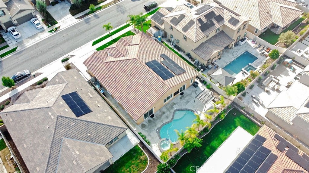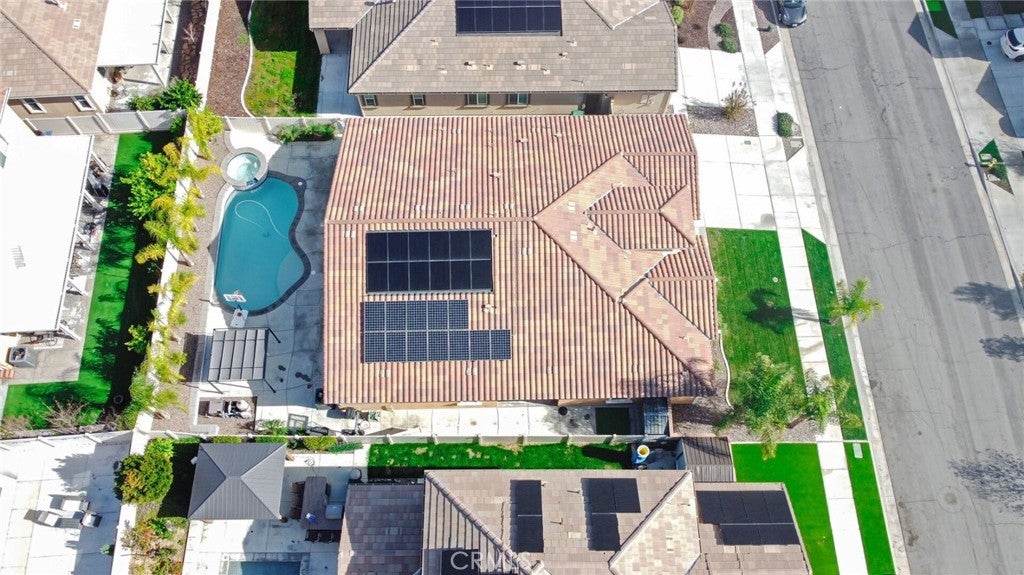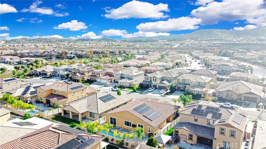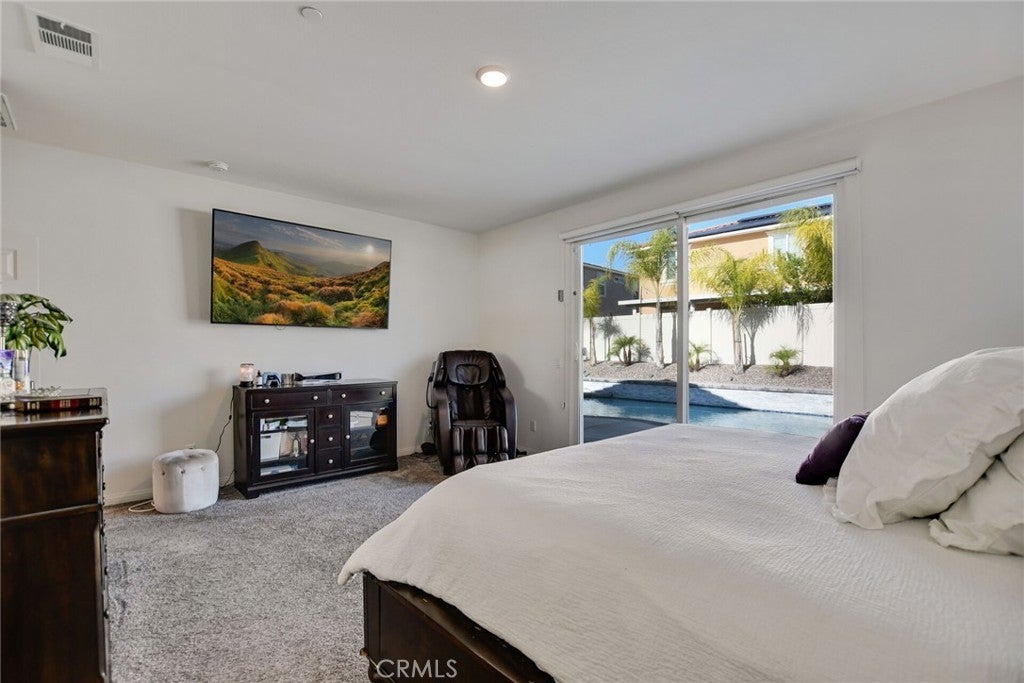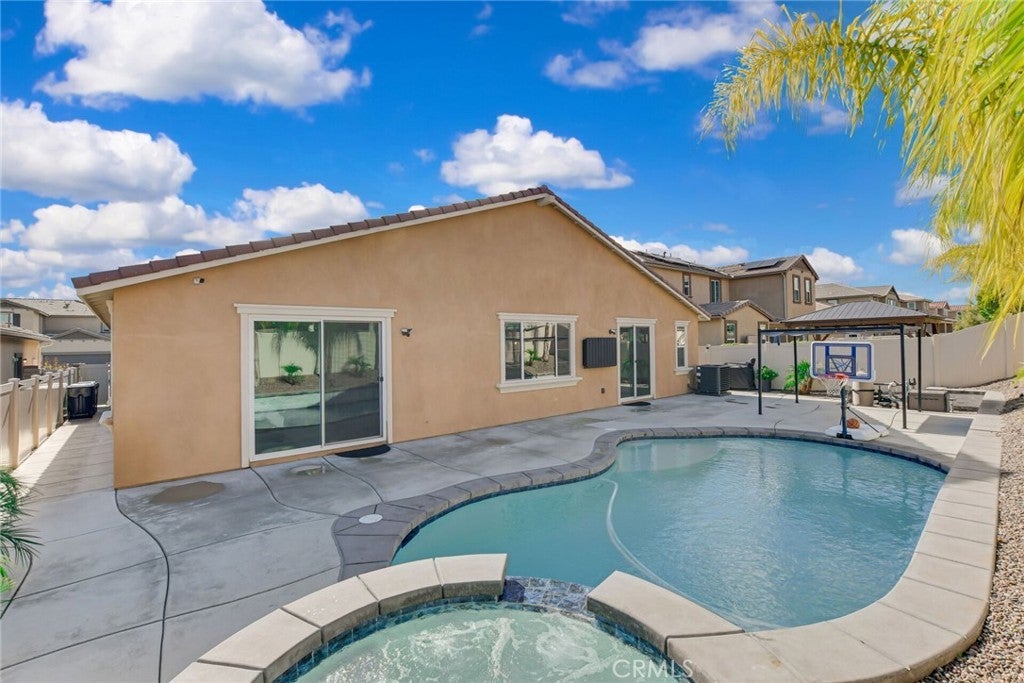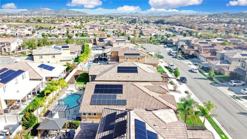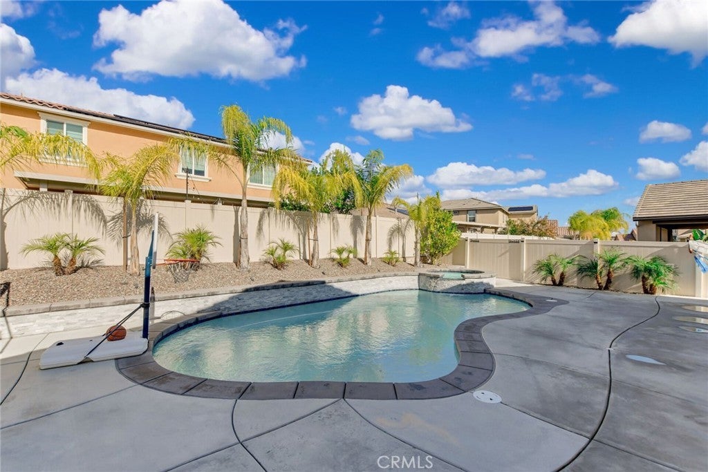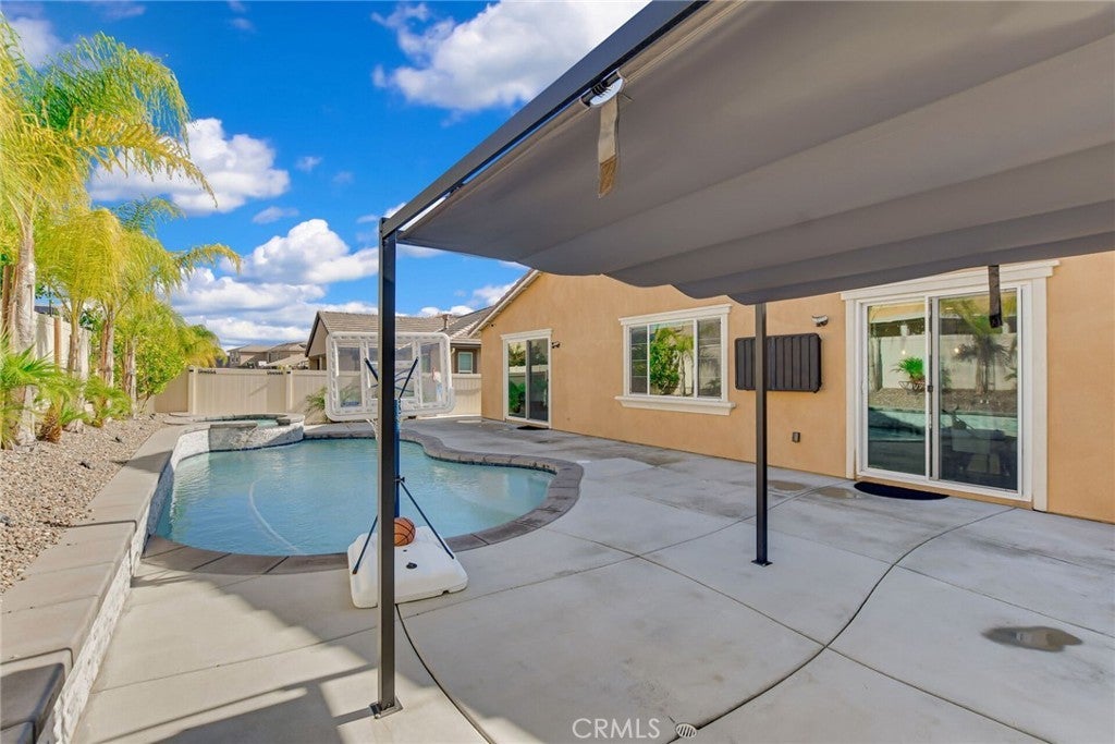 SINGLE STORY SALTWATER POOL HOME located in the desirable Audie Murphy Ranch community of Menifee, built in 2021 by Richmond American Homes featuring the Julia floor plan with an open and functional layout and modern finishes throughout, including a fourth bedroom option in place of a tandem garage. The exterior offers mature landscaping and a private backyard with an in-ground saltwater pool and spa, vinyl fencing, and space for outdoor use. Private backyard includes a freestanding pergola creating a shaded outdoor seating space. Interior highlights include luxury vinyl plank flooring in the main living areas, carpeted bedrooms, abundant natural light, upgraded lighting, window shutters in the bedrooms, shades in the main living area, and an open great room with ceiling speakers. The kitchen features a quartz extended island, GE Profile black stainless steel appliances, double oven, large pantry, and ample cabinetry. The primary suite includes an ensuite bathroom with soaking tub and custom shower, while three additional bedrooms provide flexible living space. Additional features include a tankless water heater, 24 leased solar panels, and a two-car garage with automatic door openers. Community amenities include pools and spas, tennis courts, walking and biking trails, parks, barbecue areas, clubhouse, and skate and sport parks, with convenient access to award-winning schools, shopping, medical facilities, and the 15 and 215 freeways.