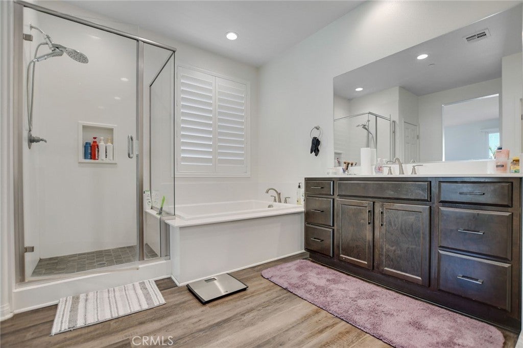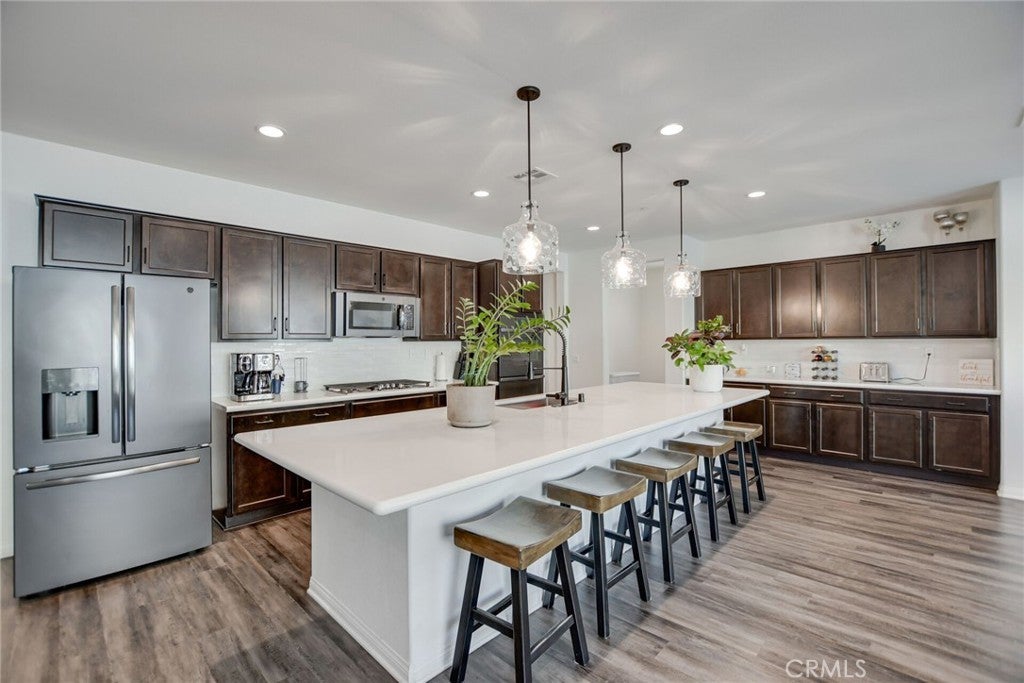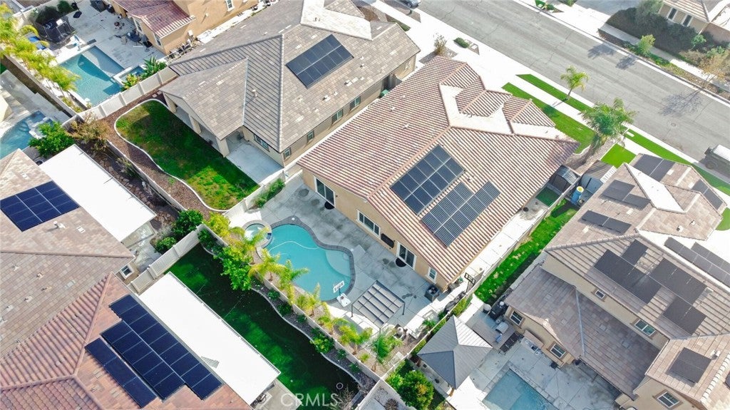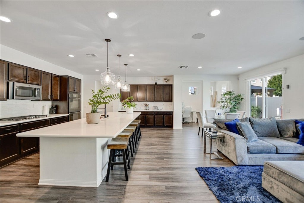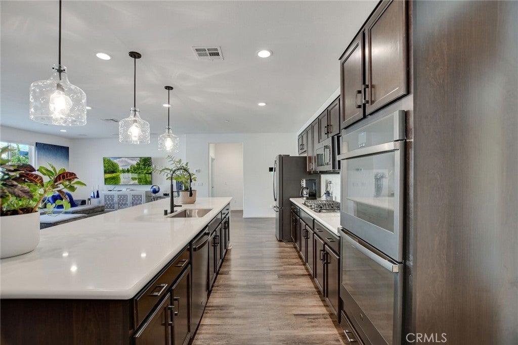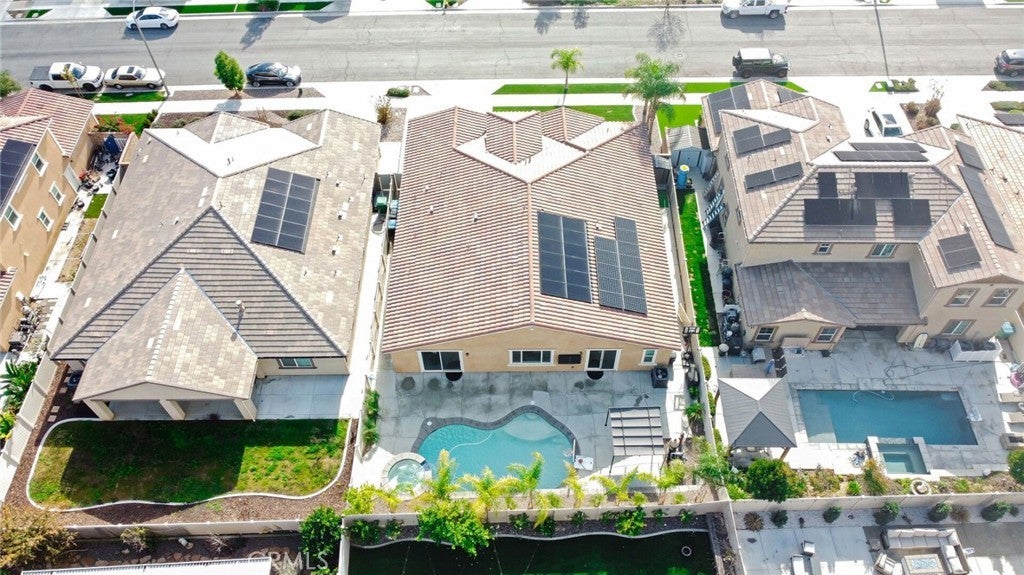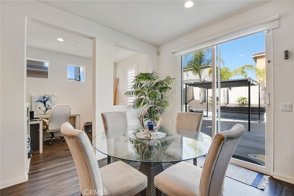 SINGLE STORY SALTWATER POOL HOME located in the desirable Audie Murphy Ranch community of Menifee, built in 2021 by Richmond American Homes featuring the Julia floor plan with an open and functional layout and modern finishes throughout, including a fourth bedroom option in place of a tandem garage. The exterior offers mature landscaping and a private backyard with an in-ground saltwater pool and spa, vinyl fencing, and space for outdoor use. Private backyard includes a freestanding pergola creating a shaded outdoor seating space. Interior highlights include luxury vinyl plank flooring in the main living areas, carpeted bedrooms, abundant natural light, upgraded lighting, window shutters in the bedrooms, shades in the main living area, and an open great room with ceiling speakers. The kitchen features a quartz extended island, GE Profile black stainless steel appliances, double oven, large pantry, and ample cabinetry. The primary suite includes an ensuite bathroom with soaking tub and custom shower, while three additional bedrooms provide flexible living space. Additional features include a tankless water heater, 24 leased solar panels, and a two-car garage with automatic door openers. Community amenities include pools and spas, tennis courts, walking and biking trails, parks, barbecue areas, clubhouse, and skate and sport parks, with convenient access to award-winning schools, shopping, medical facilities, and the 15 and 215 freeways.