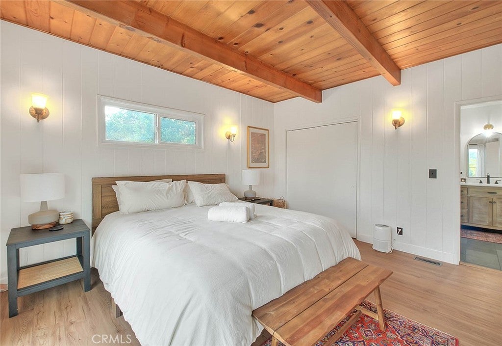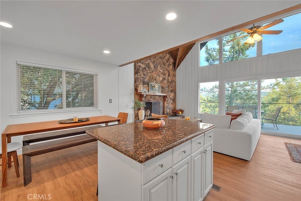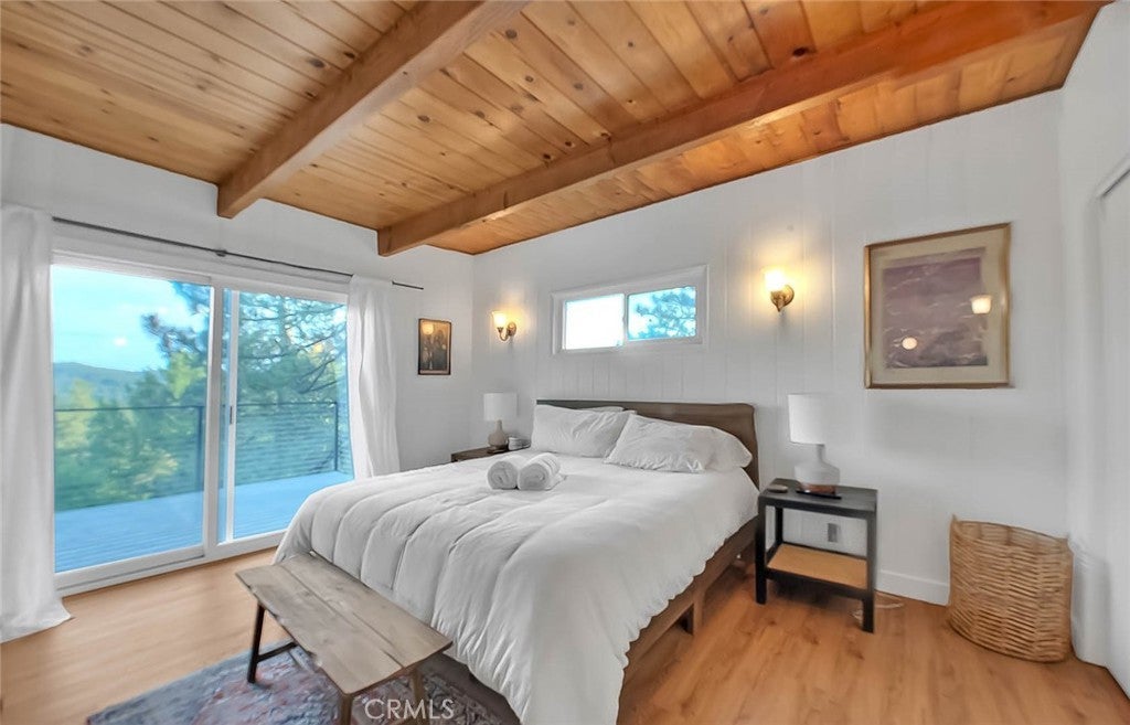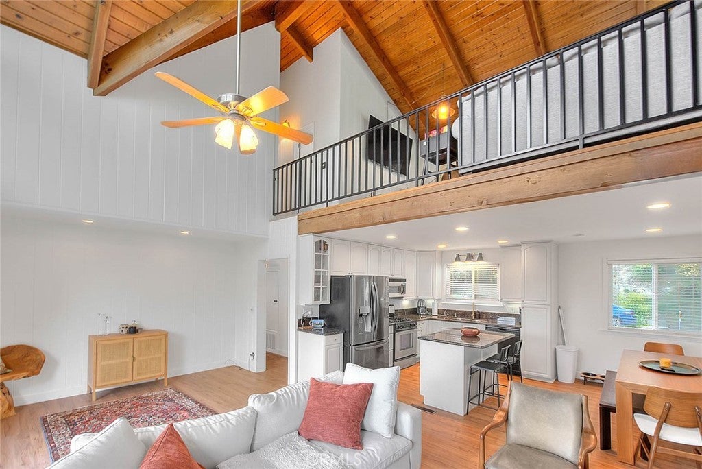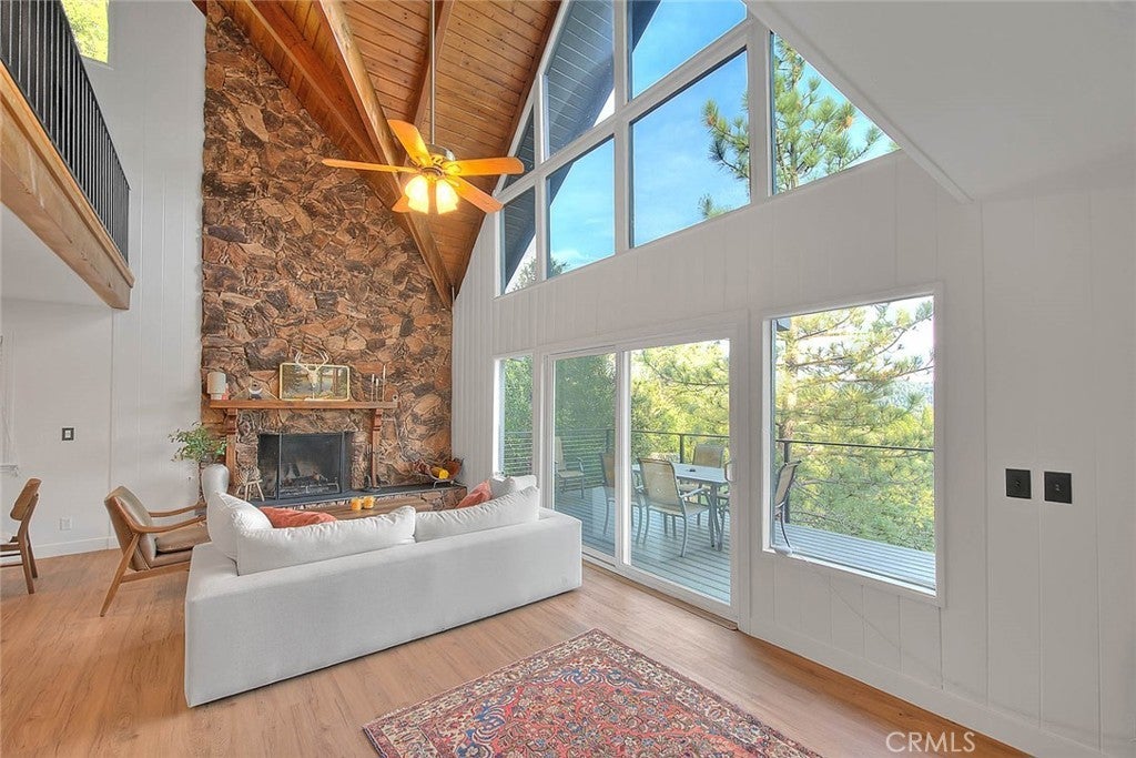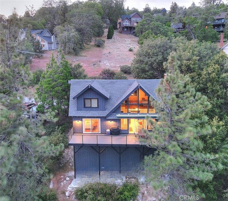 **Modern Mountain Retreat in the North Bay of Lake Arrowhead** Tucked into the pines with effortless curb appeal and level entry, this fully updated Lake Arrowhead retreat blends classic charm with modern upgrades. Recent improvements include a new Trex deck with cable railing, a new retaining wall, and fresh asphalt that creates an inviting and practical arrival experience. With level parking for multiple cars, a boat, or an RV, access is easy and snow-season ready. Inside, dramatic prow-style architecture, soaring beamed ceilings, and expansive windows fill the home with natural light and serene tree-top views. Fresh interior and exterior paint, a new front door, and updated windows throughout create a clean, contemporary feel. The remodeled open-concept kitchen flows into a bright living area with a cozy fireplace and forest backdrop. The main-level primary suite opens to the deck and features a spa-inspired en-suite bath. Upstairs offers two additional bedrooms and a spacious loft overlooking the great room. The lower level includes a fully equipped game and media room with new windows and modern finishes. All bathrooms have been updated, and new flooring and refreshed exterior paneling complete the transformation. The home is offered furnished per the seller’s inventory for an easy move-in. A new pontoon boat is also available for purchase separately. Located in Arrowhead Woods with lake rights and excellent year-round access, this retreat delivers the best of mountain living with style, comfort, and a modern treehouse vibe.