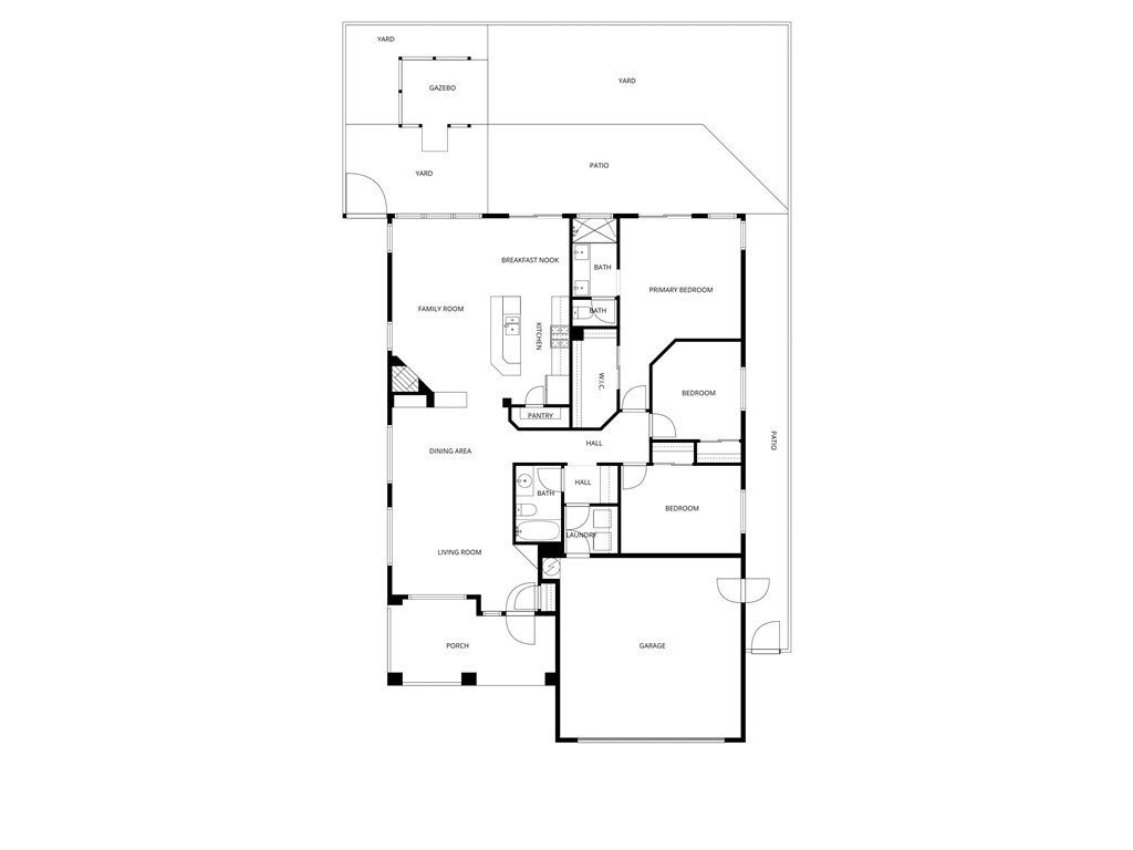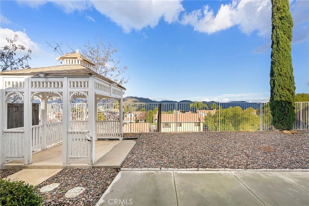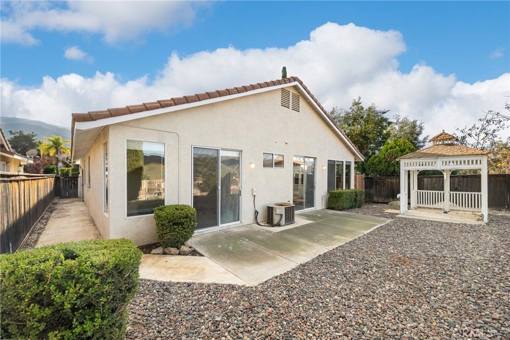 This inviting home features a charming covered front porch with stucco columns, tile roof accents, and neatly trimmed landscaping that creates welcoming curb appeal. Inside, the open living area is bright and spacious, highlighted by neutral walls, large windows, wood-look flooring, and a ceiling fan for comfort. The layout flows easily into an adjacent dining or sitting area with a raised counter opening that adds depth and connection between spaces. Out back, sliding glass doors lead to a concrete patio, ideal for outdoor seating or entertaining, set within a low-maintenance yard finished with decorative rock. A freestanding gazebo provides a shaded retreat, while mature shrubs and fencing offer privacy and a peaceful outdoor setting. Recently updated with new flooring, water heater, kitchen cabinets, and a modern master vanity. The kitchen shines with quartz countertops and a quartz-topped breakfast bar—perfect for everyday living and entertaining. Enjoy front and backyard views, a small but charming backyard, and a painted garage floor for a clean, finished look. The home also includes a stylish refrigerator (with ice cubes you’ll love!) plus a washer and dryer for added convenience.