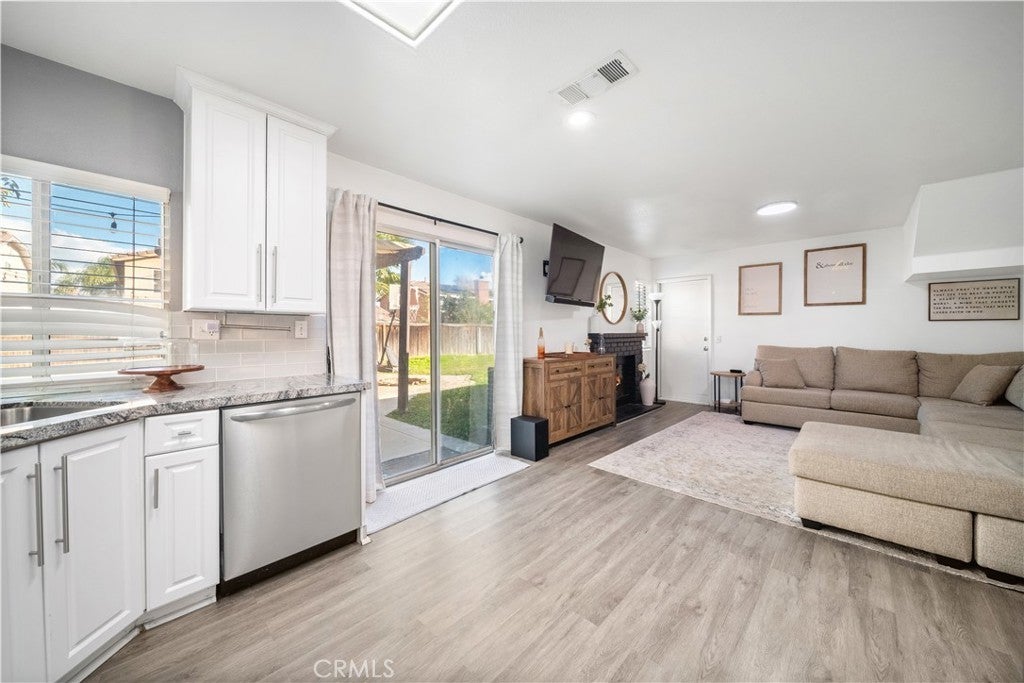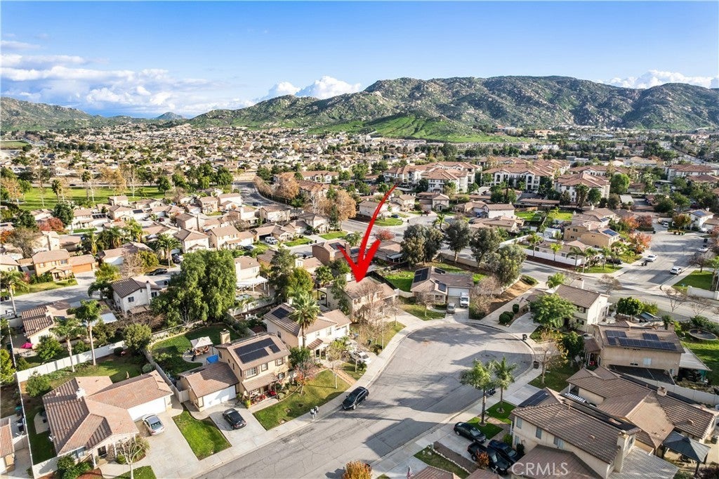 Situated in a quiet Moreno Valley cul-de-sac, this 2000-built home maximizes function and flow. The standout layout features two distinct living areas: a tiled front lounge perfect for a media room or office, and a separate family room anchored by a black brick gas fireplace and wood-style flooring. The bright kitchen is updated with granite countertops, stainless steel appliances, white cabinetry, and dual skylights that flood the space with natural light. Upstairs, the primary suite offers a private retreat with a walk-in closet and en-suite bath. Outside, the 6,098 sq. ft. lot shines with a lush green lawn, low-maintenance vinyl fencing, and a dedicated fire pit area. The included backyard gazebo creates an instant outdoor dining room. Complete with a leased solar system for energy efficiency, this home is move-in ready.