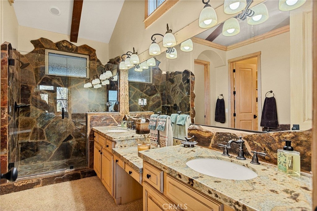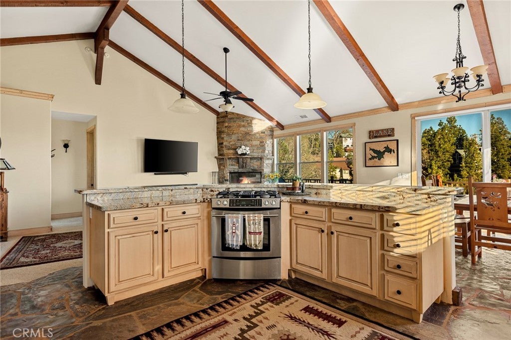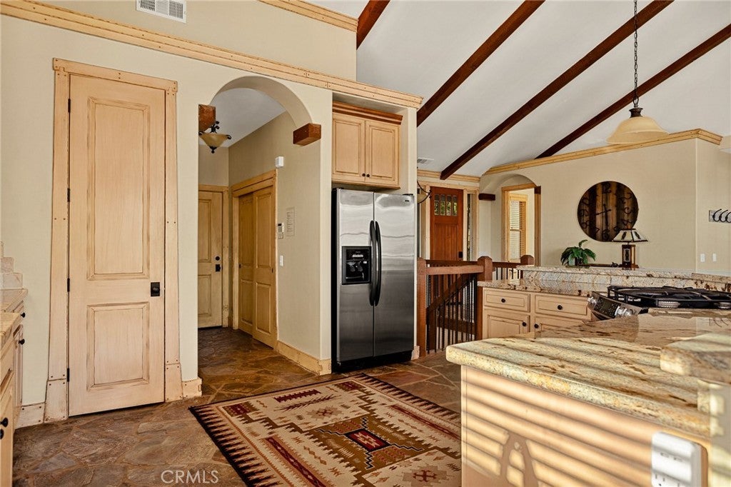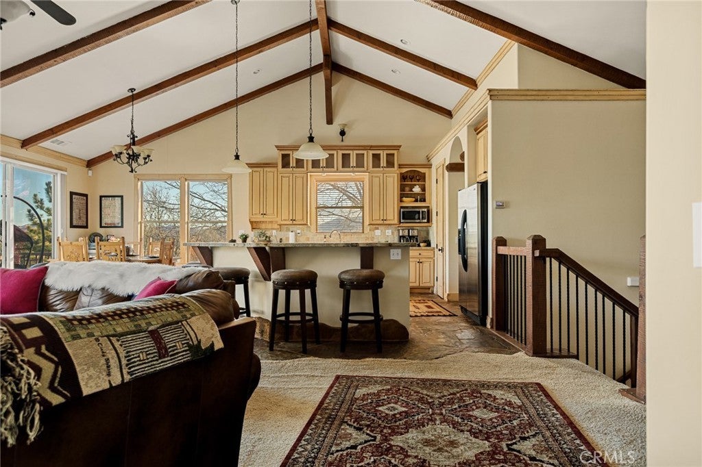 • Interior FeaturesBreakfast Bar, Ceiling Fan(s), Cathedral Ceiling(s), Eat-in Kitchen, Granite Counters, Recessed Lighting, Storage, Bedroom on Main Level, Primary Suite, Walk-In Closet(s), Beamed Ceilings, Crown Molding, High Ceilings, Living Room Deck Attached, Open Floorplan, Pantry, Stone Counters, Walk-In Pantry