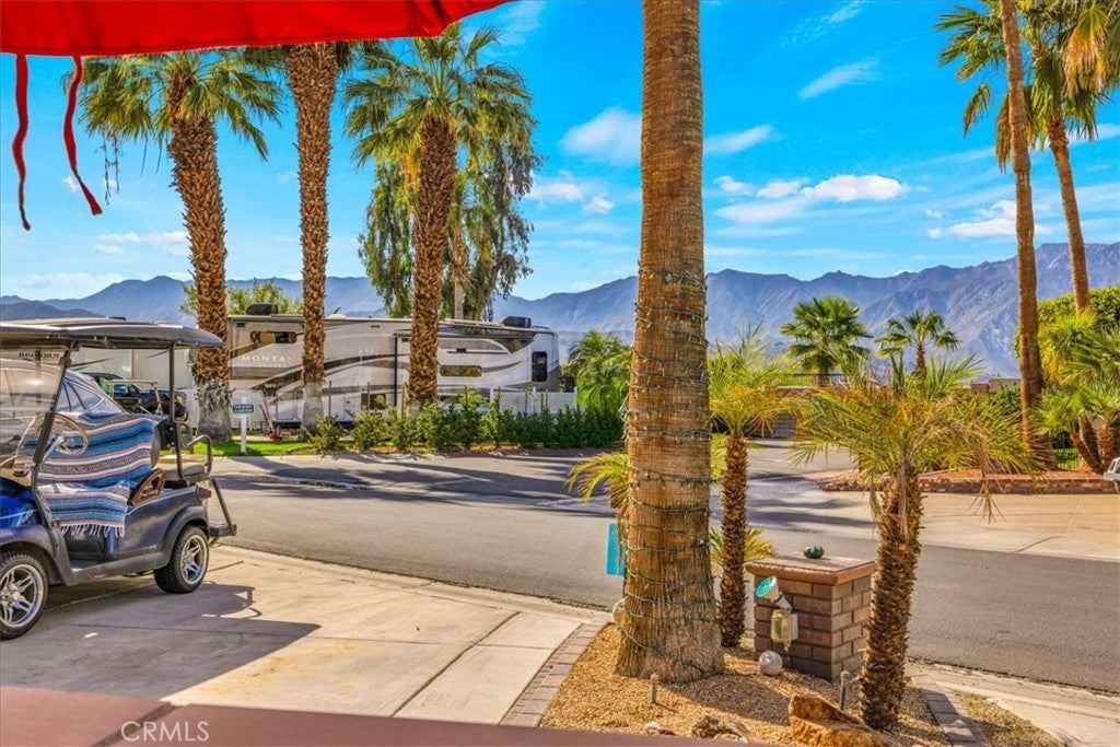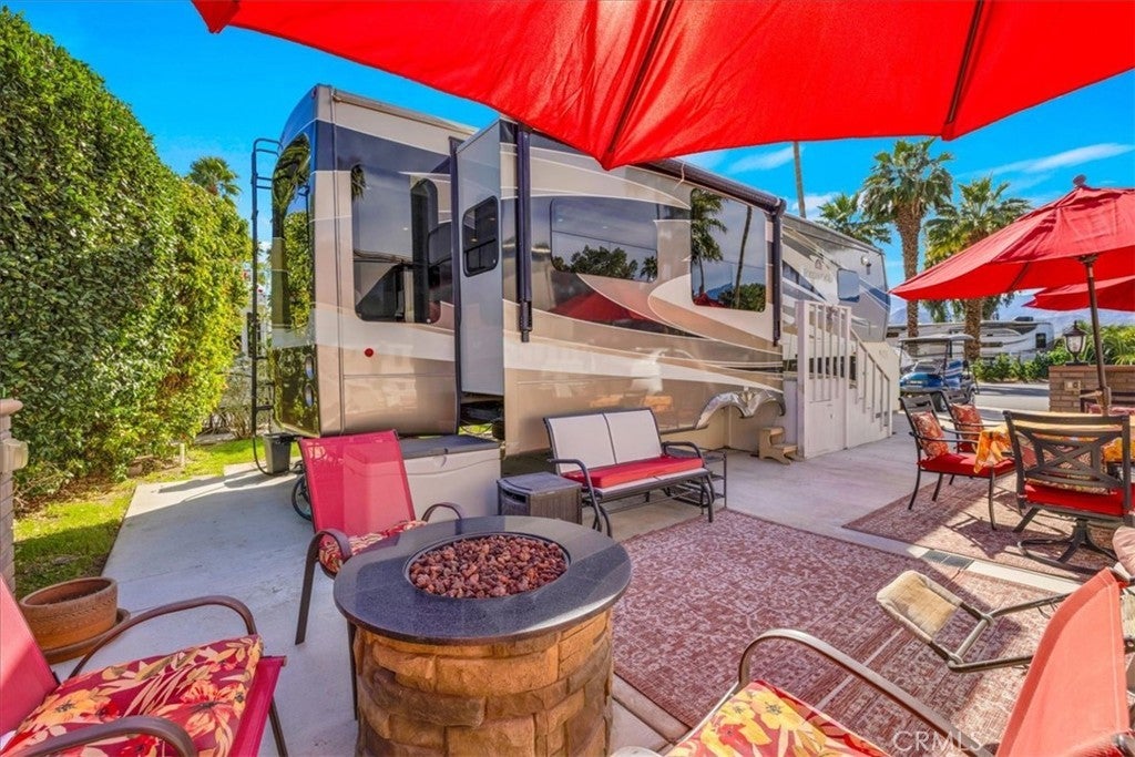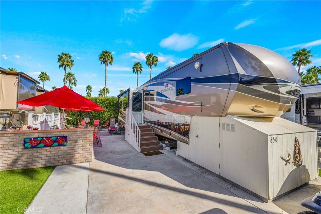 Beautifully upgraded east-facing lot on desirable Ficus Drive with unobstructed views of the San Jacinto Mountains in the guard-gated Outdoor Resorts Palm Springs Community. This turnkey outdoor living space features vinyl fencing, custom downlighting, a front privacy wall, low-maintenance astro turf, and expanded concrete in the rear—maximizing patio and entertaining areas. Included in the sale are all outdoor patio furniture, area rugs, storage box, a 2012 Redwood Fifth Wheel M-36RL with lots of natural light, front doghouse, and custom stairs with wood railing. A short walk to the dog park, Satellites D and E and the El Saguaro Club House with Pickleball Courts and Owners Lounge. Lot 650 is on the west side of the resort in the highly sought-after neighborhood locals call “WEHO.” Outdoor Resorts Palm Springs spans 137 beautifully landscaped acres and offers an unmatched resort lifestyle with 27 holes of executive golf, 10 tennis courts, 13 pickleball courts, 8 swimming pools, a fully equipped fitness center, sports bar (19th Hole), on-site salon/barber shop, café, and two clubhouses with year-round activities, events, and entertainment. Whether you’re seeking an active social scene or a peaceful desert retreat, this is more than a lot—it’s a lifestyle.