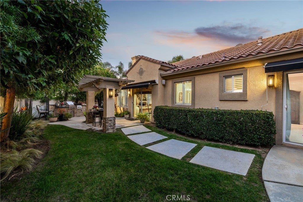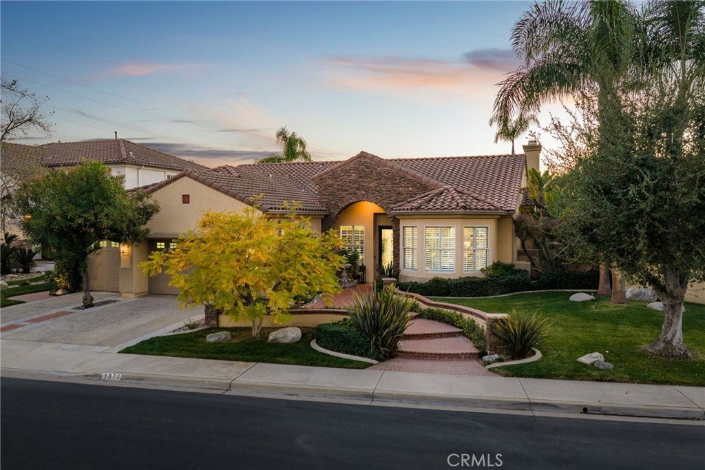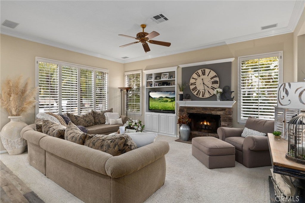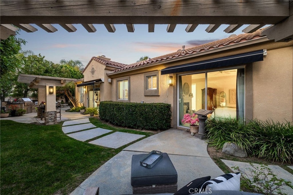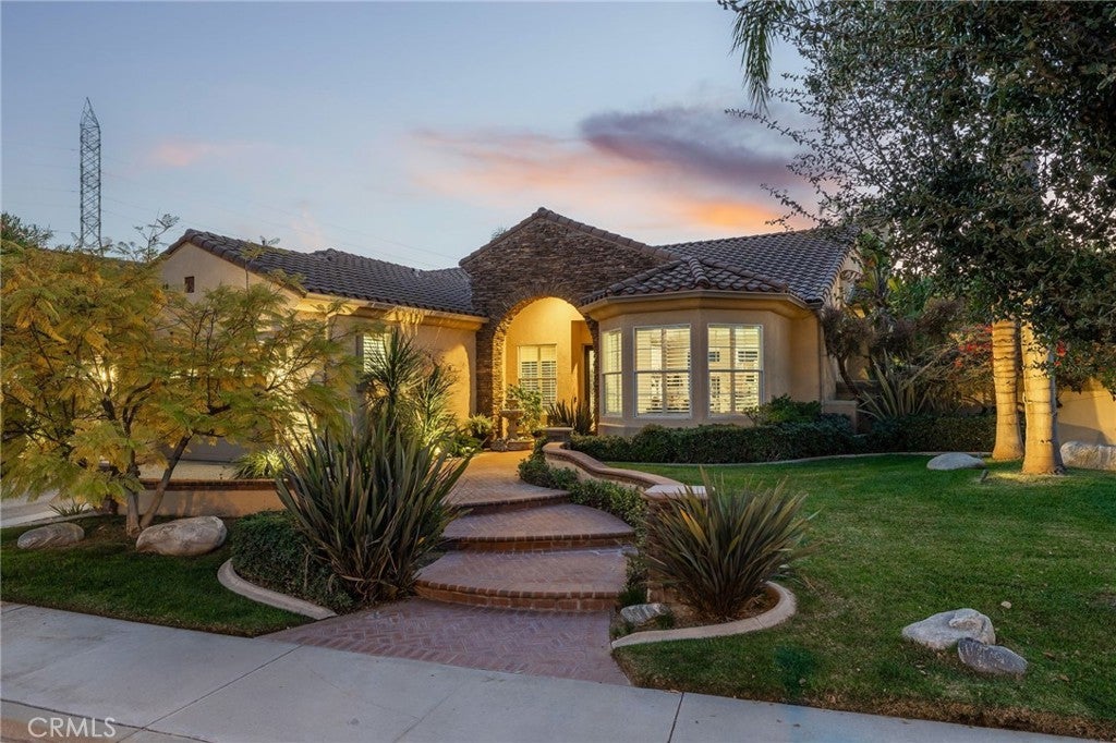 A refined single-story residence offering timeless architecture, privacy, and resort-style outdoor living, introduced by a striking stone-arched entry. Set within the gated La Verne Heights community, the home is approached by a brick-lined walkway and manicured landscaping, creating a warm and architectural first impression. Inside, the entry opens seamlessly into the main living spaces, where abundant natural light, plantation shutters, and crown molding establish an inviting, refined tone. The living room overlooks the front yard with mountain views through a bay window and flows effortlessly into the adjacent dining area. Just off the entry, a private office or optional fourth bedroom with double doors offers flexible use. The kitchen opens directly to the family room, forming a natural gathering space and featuring rich wood cabinetry, a spanning island with bar seating, Thermador stainless steel appliances, and a pantry. An open breakfast nook with sliding glass doors extends the living space outdoors, reinforcing the home’s effortless indoor–outdoor connection. The family room is anchored by a stone fireplace with custom built-in cabinetry and media center, complemented by crown molding, plantation shutters, built-in surround speakers, and abundant natural light through a wall of shuttered windows. The primary suite is a serene, retreat-like space designed for comfort and privacy. Generously sized, it features plush carpeting, crown molding, a ceiling fan, and shuttered windows that fill the room with soft natural light. A cozy fireplace adds warmth and character, while sliding glass doors open directly to the backyard, offering a peaceful connection to the landscaped grounds. The primary bath is spacious and thoughtfully designed, featuring dual vanities with generous counter space, a dedicated vanity area, a privacy door to the water closet, and modern light fixtures that create a bright, spa-inspired feel. A soaking tub sits beneath a window with plantation shutters, complemented by a separate glass-enclosed shower with full tile surround. Designed as a series of outdoor living spaces, the backyard features a private side-yard pool and spa with cascading water features, mature tropical landscaping, a grass area, and mountain views. The rear entertaining yard is complete with pergola-covered patios, a stacked-stone built-in barbecue with granite counters, Viking appliances including dual burners, and a custom outdoor fireplace.