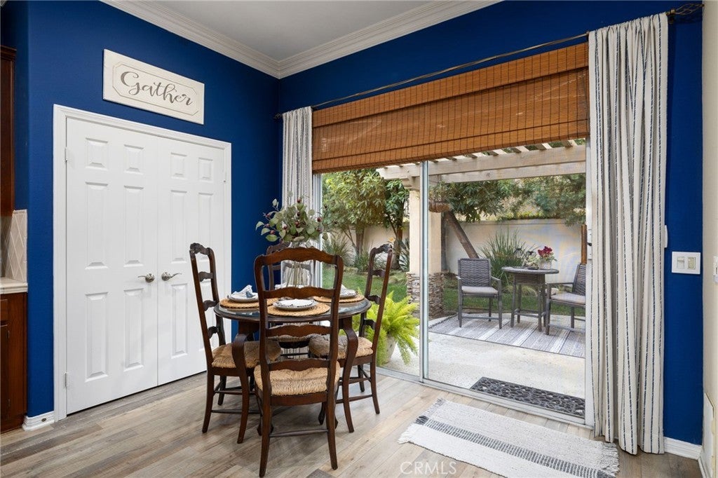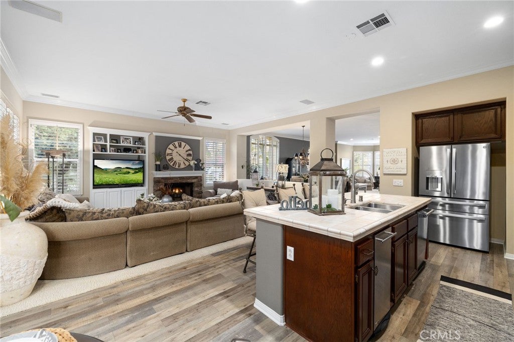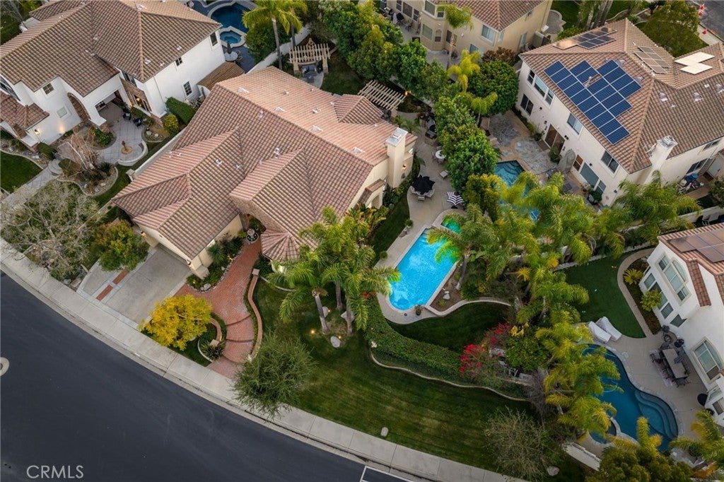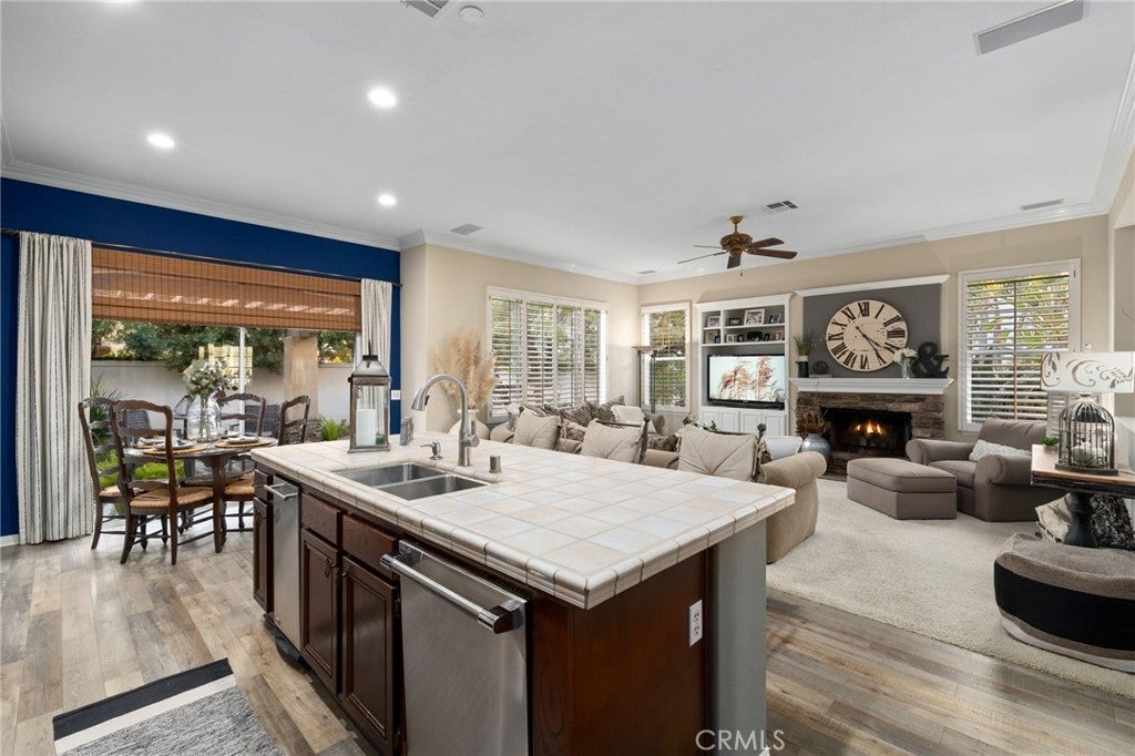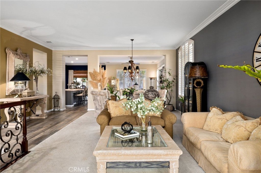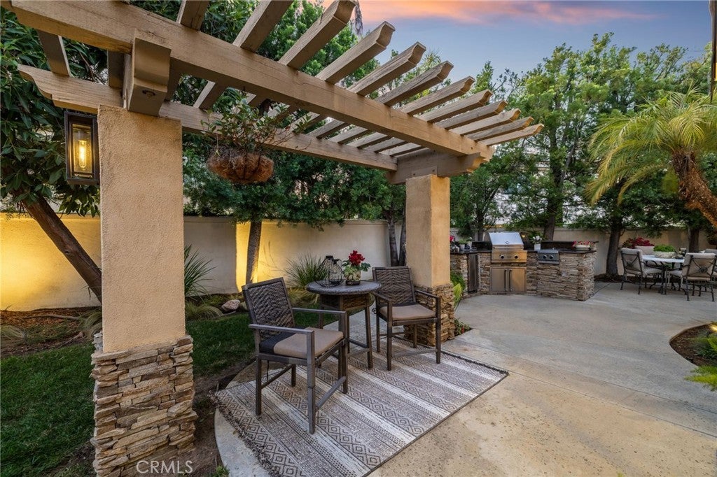 A refined single-story residence offering timeless architecture, privacy, and resort-style outdoor living, introduced by a striking stone-arched entry. Set within the gated La Verne Heights community, the home is approached by a brick-lined walkway and manicured landscaping, creating a warm and architectural first impression. Inside, the entry opens seamlessly into the main living spaces, where abundant natural light, plantation shutters, and crown molding establish an inviting, refined tone. The living room overlooks the front yard with mountain views through a bay window and flows effortlessly into the adjacent dining area. Just off the entry, a private office or optional fourth bedroom with double doors offers flexible use. The kitchen opens directly to the family room, forming a natural gathering space and featuring rich wood cabinetry, a spanning island with bar seating, Thermador stainless steel appliances, and a pantry. An open breakfast nook with sliding glass doors extends the living space outdoors, reinforcing the home’s effortless indoor–outdoor connection. The family room is anchored by a stone fireplace with custom built-in cabinetry and media center, complemented by crown molding, plantation shutters, built-in surround speakers, and abundant natural light through a wall of shuttered windows. The primary suite is a serene, retreat-like space designed for comfort and privacy. Generously sized, it features plush carpeting, crown molding, a ceiling fan, and shuttered windows that fill the room with soft natural light. A cozy fireplace adds warmth and character, while sliding glass doors open directly to the backyard, offering a peaceful connection to the landscaped grounds. The primary bath is spacious and thoughtfully designed, featuring dual vanities with generous counter space, a dedicated vanity area, a privacy door to the water closet, and modern light fixtures that create a bright, spa-inspired feel. A soaking tub sits beneath a window with plantation shutters, complemented by a separate glass-enclosed shower with full tile surround. Designed as a series of outdoor living spaces, the backyard features a private side-yard pool and spa with cascading water features, mature tropical landscaping, a grass area, and mountain views. The rear entertaining yard is complete with pergola-covered patios, a stacked-stone built-in barbecue with granite counters, Viking appliances including dual burners, and a custom outdoor fireplace.