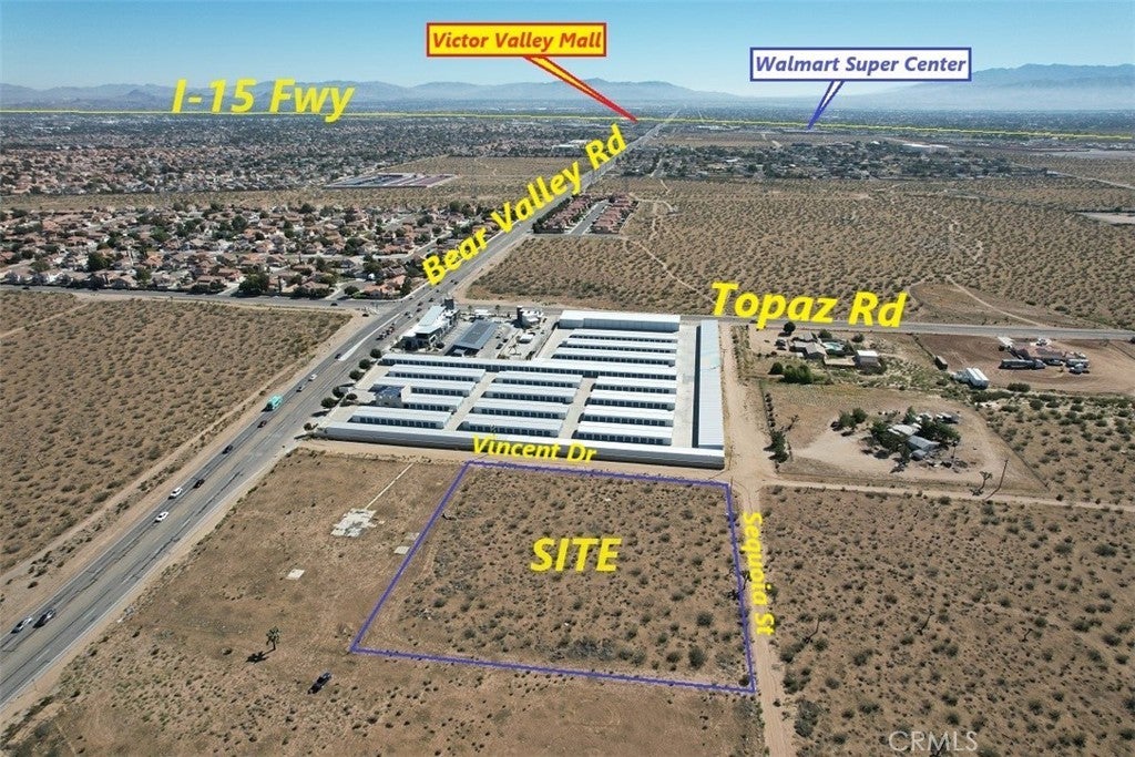 Excellent location, 2.49 acres of Level commercial parcel at the corner of Vincent Dr. and Sequoia St, just 200 ft +/- from Bear Valley Rd, water and electricity on the street. A few permitted uses per city of Victorville are Storage containers, parking lot sale, Restaurant, small recycling facility, Vehicle Storage, etc. The configuration of the site allows for easy access and visible from Bear Valley Rd. Lot located just one mile from US- 395 Hwy to the west of the property and only 2 miles from I-15 Fwy (Exit 147) to the east of the property, (C-1) Commercial Zoned, and next to a self-storage close to a major thorough fare Bear Valley Rd, (Seller may carry with 50% down, 8% interest rate, up to 5 years amortized monthly payments.) Google Maps coordinates for location of the property are: 34.469000, -117.384639