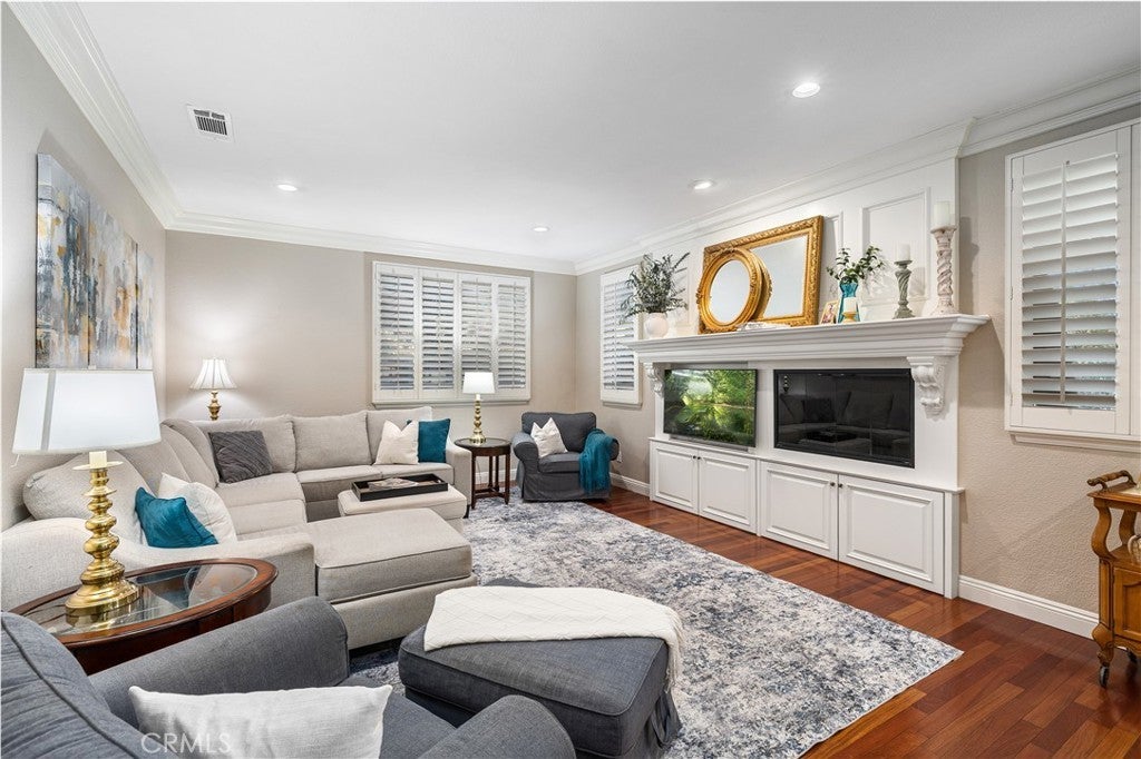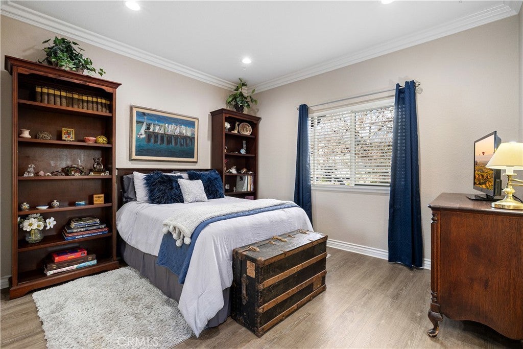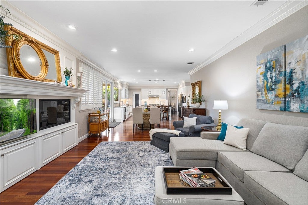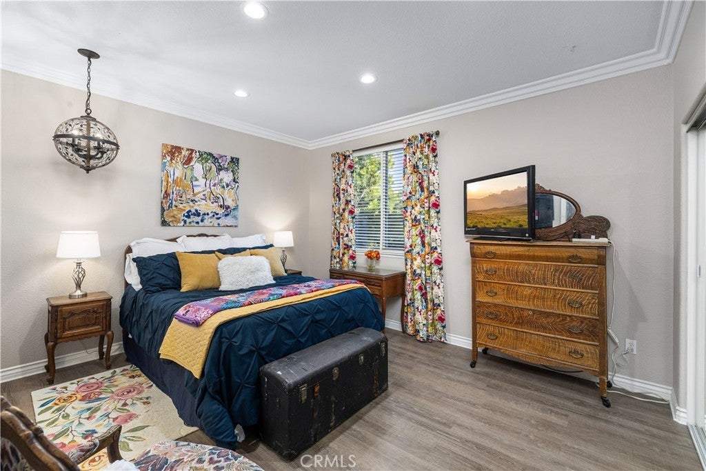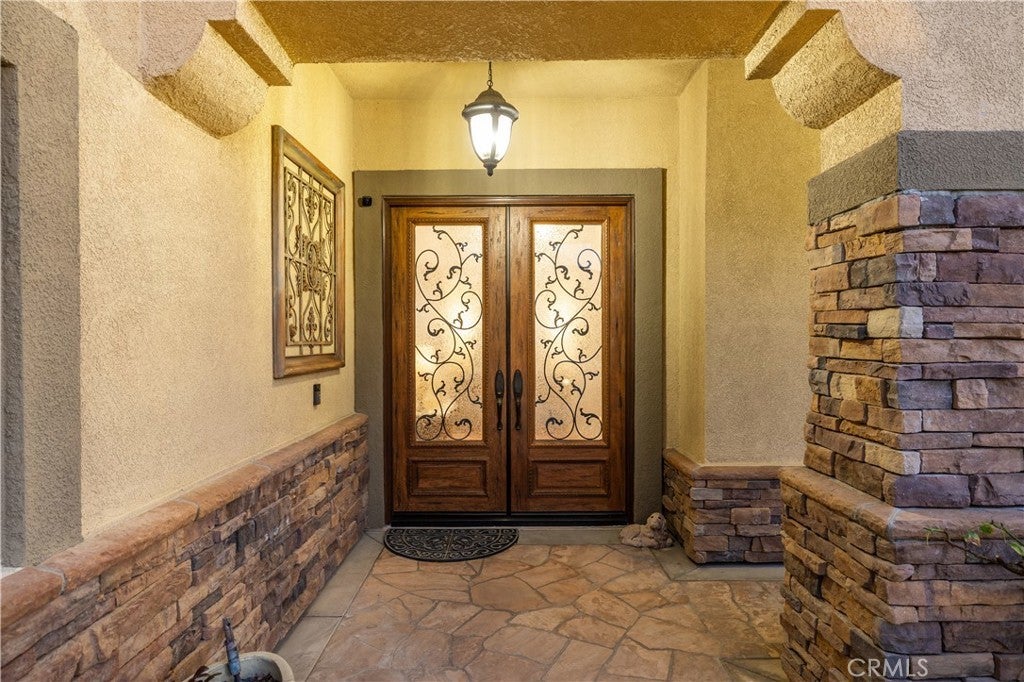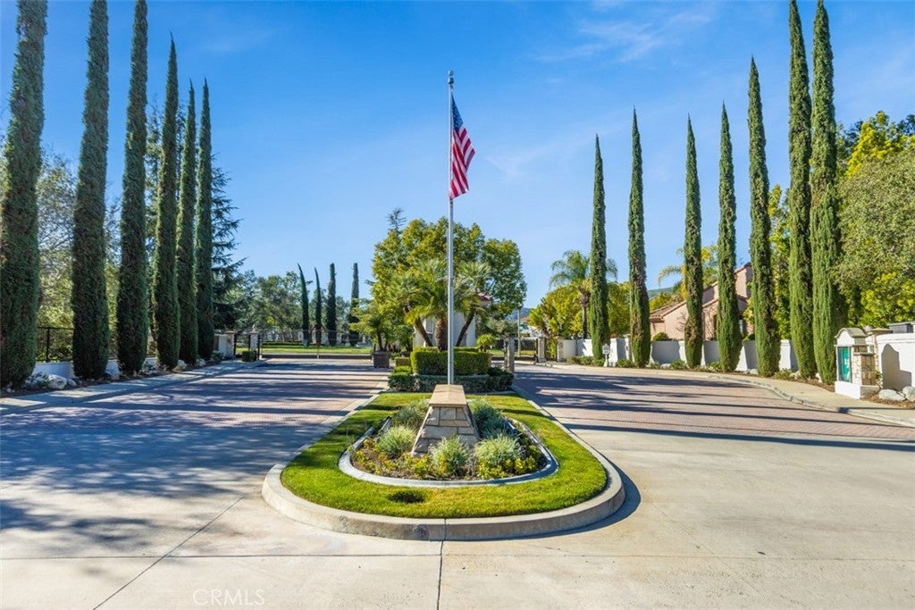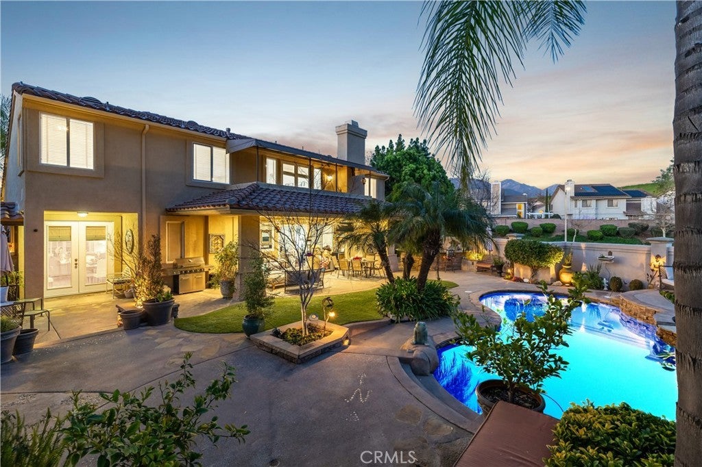 Positioned at the end of a cul-de-sac within the gated La Verne Heights community, this expansive residence blends architectural scale, refined detailing, and resort-inspired outdoor living. A four-car garage, dedicated RV parking, and approx. ten additional uncovered parking spaces provide exceptional flexibility. An artificial turf front lawn and a walkway lead through manicured landscaping with a fountain, and to a private front courtyard. The covered entry is framed by stone columns and double wood doors with iron and glass inlays. Inside, a two-story foyer showcases soaring ceilings, a chandelier, rich hardwood flooring, and a staircase with wood handrails and iron balusters. The formal living room features vaulted ceilings and a large window overlooking the front yard. The adjacent dining room offers crown molding, French doors to the backyard, and direct access to the kitchen. The remodeled kitchen is appointed with classic white cabinetry, granite countertops with full tile backsplash, stainless steel appliances, a center island with pendant lighting and seating, a walk-in pantry, a breakfast nook and a corner butler’s pantry. The family room includes LED lighting, crown molding, an elevated fireplace with custom carpentry detail, plantation shutters, and French doors providing backyard access. A downstairs bedroom, currently used as an office with double doors, offers direct access to the guest bathroom. The laundry room features cabinetry, a folding counter, utility sink, and garage access. Upstairs, a large bonus room offers vaulted ceilings, LVP flooring, and mountain views. The primary suite features French doors to a private view balcony and a two-sided fireplace shared with a retreat. The primary bath is separated by a barn door and includes dual sinks, a vanity counter, a custom tiled shower with frameless glass enclosure, a separate soaking tub, and two walk-in closets. Two secondary bedrooms share a remodeled Jack-and-Jill bathroom, while a third bedroom has direct access to an additional bath that also serves the loft. The private backyard is designed for entertaining, featuring a pool and spa with custom stone and tile work, a spa with an elevated spillway, a spanning covered patio with tongue-and-groove ceiling and recessed lighting, a built-in BBQ with seating and stone finish, an outdoor fireplace with matching stone, concrete decking with stone inlay, mature perimeter landscaping, turf, lighting, privacy hedges, and stucco walls.