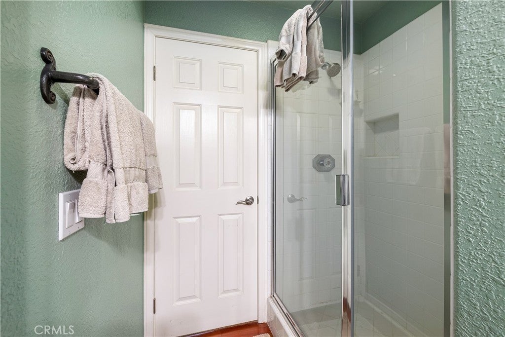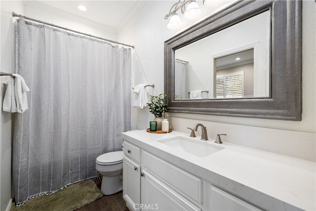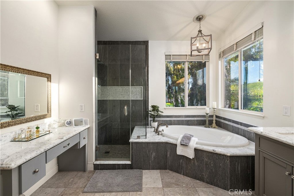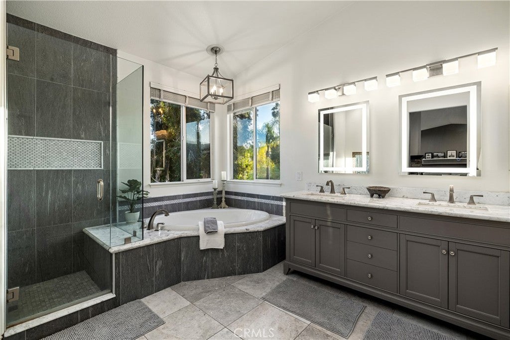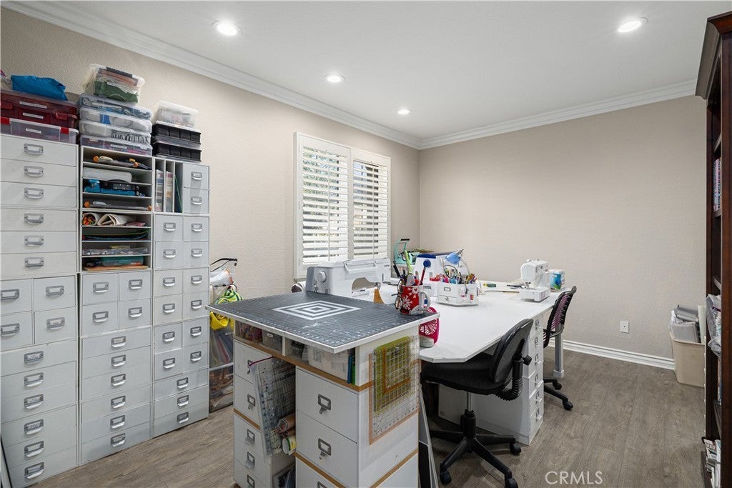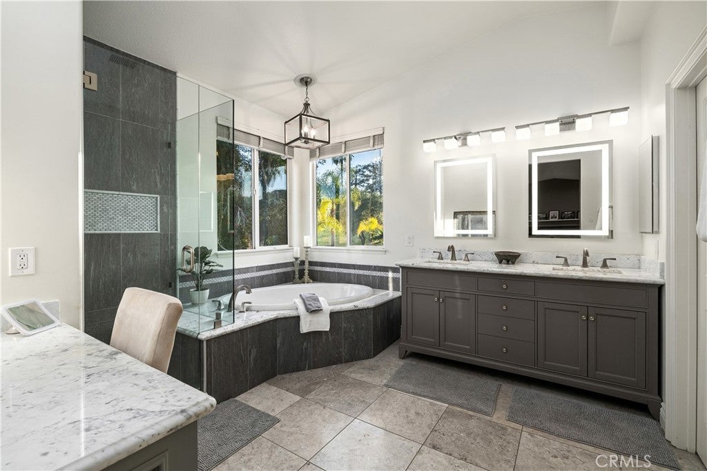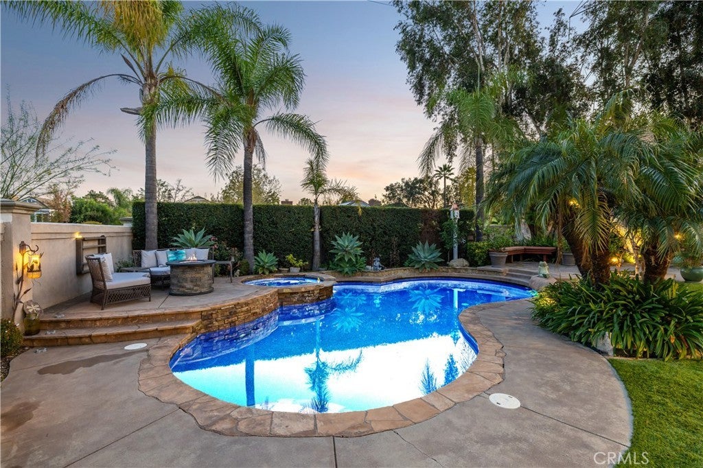 Positioned at the end of a cul-de-sac within the gated La Verne Heights community, this expansive residence blends architectural scale, refined detailing, and resort-inspired outdoor living. A four-car garage, dedicated RV parking, and approx. ten additional uncovered parking spaces provide exceptional flexibility. An artificial turf front lawn and a walkway lead through manicured landscaping with a fountain, and to a private front courtyard. The covered entry is framed by stone columns and double wood doors with iron and glass inlays. Inside, a two-story foyer showcases soaring ceilings, a chandelier, rich hardwood flooring, and a staircase with wood handrails and iron balusters. The formal living room features vaulted ceilings and a large window overlooking the front yard. The adjacent dining room offers crown molding, French doors to the backyard, and direct access to the kitchen. The remodeled kitchen is appointed with classic white cabinetry, granite countertops with full tile backsplash, stainless steel appliances, a center island with pendant lighting and seating, a walk-in pantry, a breakfast nook and a corner butler’s pantry. The family room includes LED lighting, crown molding, an elevated fireplace with custom carpentry detail, plantation shutters, and French doors providing backyard access. A downstairs bedroom, currently used as an office with double doors, offers direct access to the guest bathroom. The laundry room features cabinetry, a folding counter, utility sink, and garage access. Upstairs, a large bonus room offers vaulted ceilings, LVP flooring, and mountain views. The primary suite features French doors to a private view balcony and a two-sided fireplace shared with a retreat. The primary bath is separated by a barn door and includes dual sinks, a vanity counter, a custom tiled shower with frameless glass enclosure, a separate soaking tub, and two walk-in closets. Two secondary bedrooms share a remodeled Jack-and-Jill bathroom, while a third bedroom has direct access to an additional bath that also serves the loft. The private backyard is designed for entertaining, featuring a pool and spa with custom stone and tile work, a spa with an elevated spillway, a spanning covered patio with tongue-and-groove ceiling and recessed lighting, a built-in BBQ with seating and stone finish, an outdoor fireplace with matching stone, concrete decking with stone inlay, mature perimeter landscaping, turf, lighting, privacy hedges, and stucco walls.