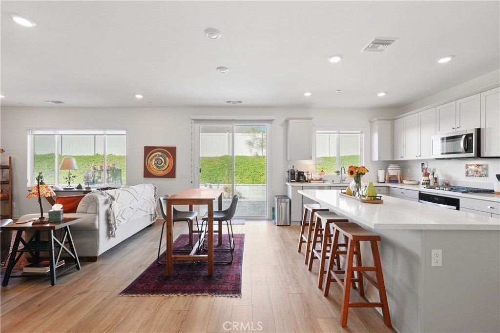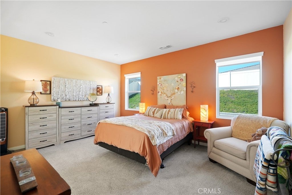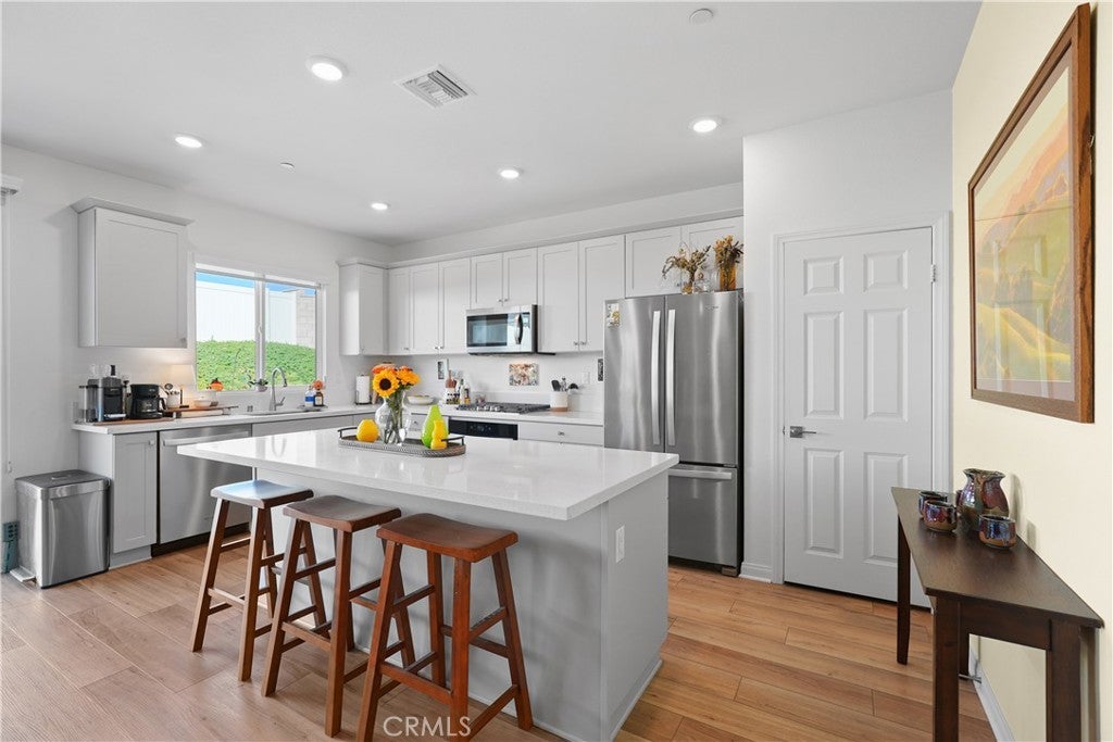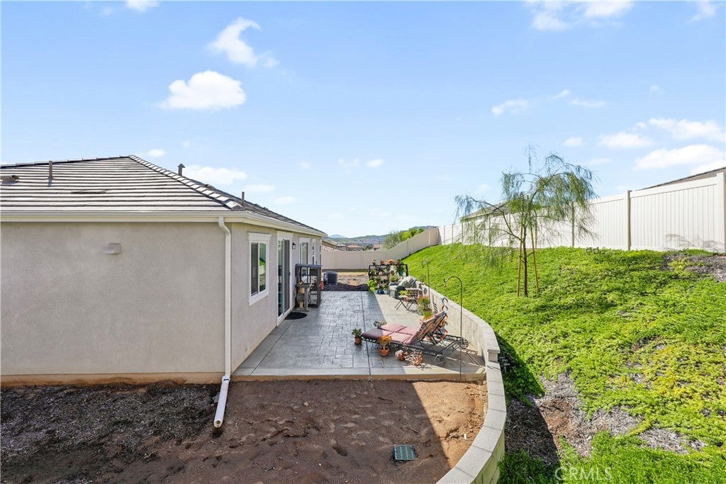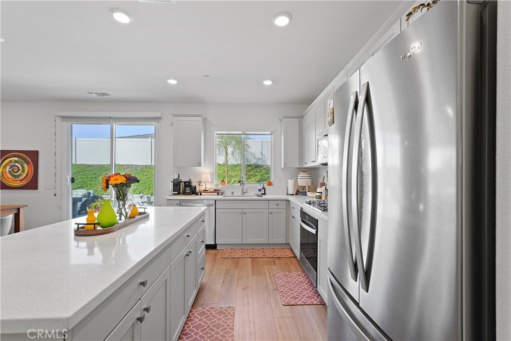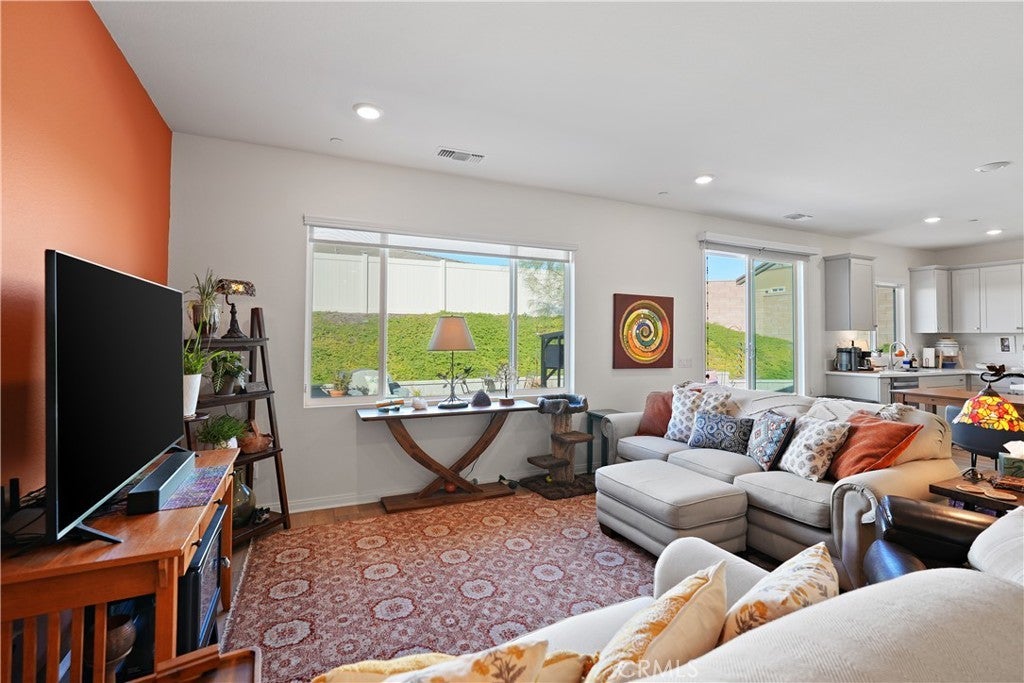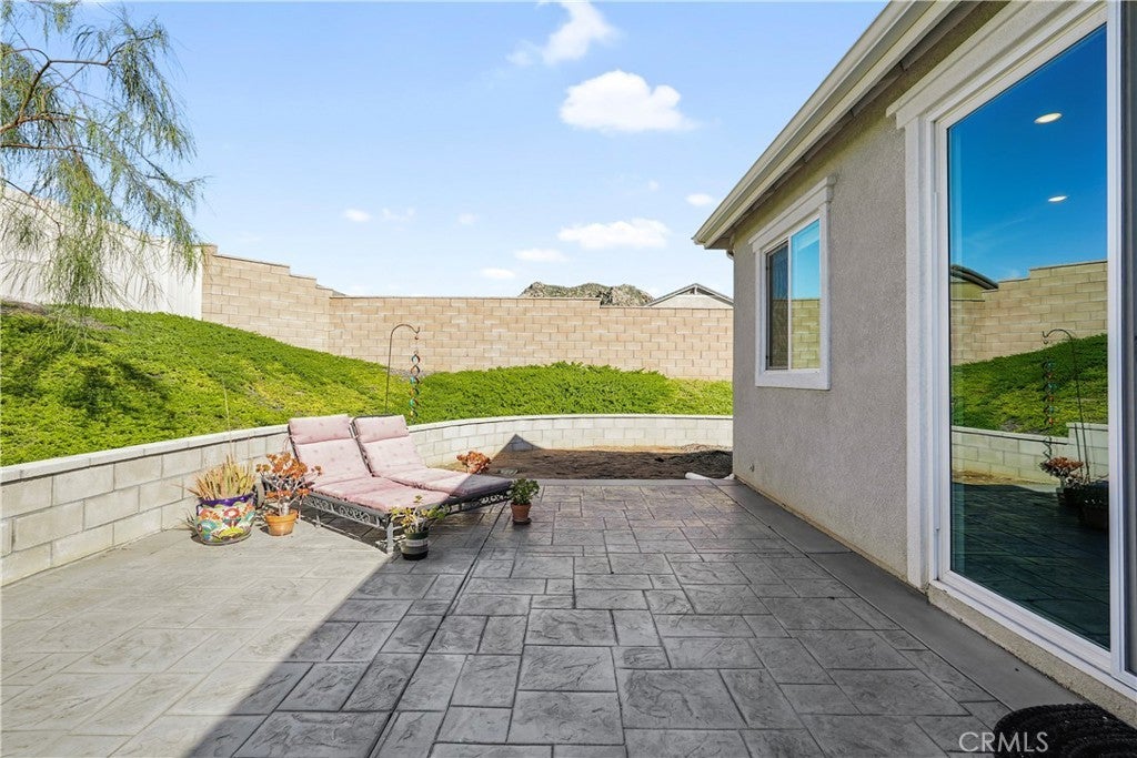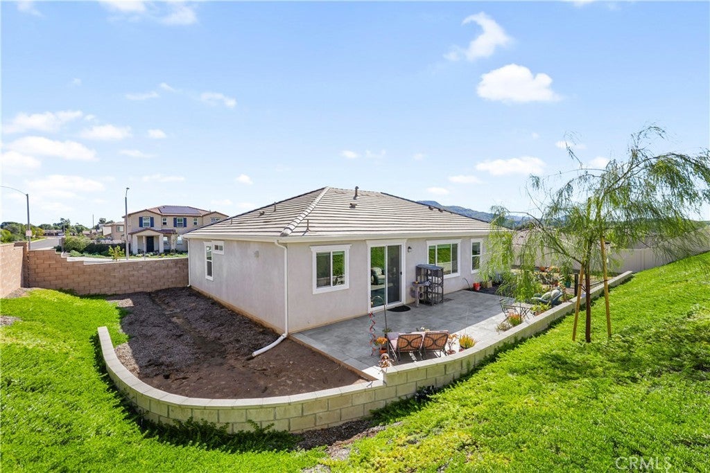 Built in 2023, this beautifully maintained single-story home offers 4 bedrooms and 2 bathrooms on a spacious 10,000+ sq ft corner lot in Moreno Valley. A welcoming foyer entry leads into an open-concept layout featuring recessed lighting and dual pane windows throughout the home, a large kitchen island, and a bright living space ideal for everyday living and entertaining. The privately separated primary suite includes a spacious bathroom with a separate soaking tub and glass-enclosed stand-up shower, along with a large walk-in closet, providing comfort and privacy. The flexible floor plan also offers potential for multigenerational living. Exterior highlights include a 4-car driveway, added rain gutters, paved front porch, landscaped garden barrier, and a paved open back patio perfect for outdoor seating and entertaining. The expansive lot offers potential RV parking and ample outdoor space. The home includes fully purchased solar and all green energy appliances, with current utilities reported at approximately $30 per month. Upgrades are already included in the purchase price, providing move-in-ready convenience and exceptional value. Conveniently located near shopping, dining, schools, and commuter access.