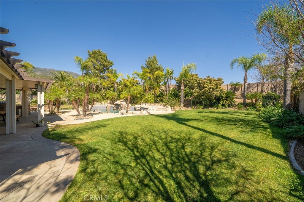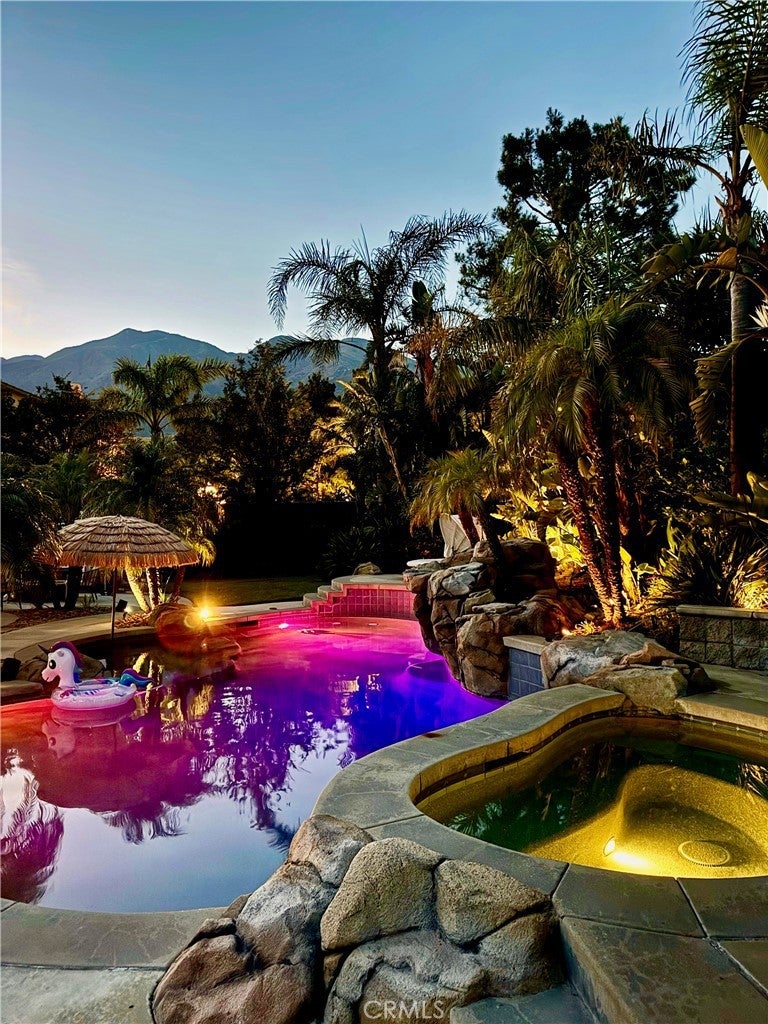Experience resort-style living in this stunning single-story home, with an opportunity to appreciate a property that is perfectly tucked away at the end of a quiet, upscale cul-de-sac. This is a forever home, set against our gorgeous foothills; the perfect retreat in one of Rancho Cucamonga’s most desirable and tranquil neighborhoods. This expansive four-bedroom, two-and-a-half-bathroom masterpiece feels like a private oasis where every day life can feel like a vacation. The bright and airy interior is highlighted by a massive formal living and dining room designed for grand-scale entertaining. The heart of the home boasts a huge open-concept kitchen and den that has an elegant fireplace that can be enjoyed alongside views of your gorgeous backyard. The wood-look flooring throughout the property creates an ambiance where one room flows seamlessly into another. The fourth bedroom could easily be converted into an office for the in-home work experience. Every room has beautiful high-end shutters adorning dual-paned windows. The primary suite offers a seamless indoor-outdoor experience, opening directly to your breathtaking backyard. Enjoy your own private paradise featuring a sparkling pool with a cascading waterfall, lush tropical Hawaiian landscaping, and sweeping views of the gorgeous snow-capped mountains. Car enthusiasts and hobbyists will appreciate the two separate garages, both of which feature pristine, durable epoxy flooring; the first is a spacious two-car garage, while the second is a single-car garage that includes a dedicated workshop area for projects and storage. With a sprawling lot that provides plenty of room for side-yard RV parking and ample space to potentially add a secondary dwelling unit, or an option to convert one of the existing garages into a guest house. The possibilities are endless. Located just steps from scenic walking and hiking trails, this peaceful and tranquil property offers a lifestyle of total relaxation. Whether you are unwinding poolside or taking in the stunning natural surroundings, this home offers a sense of privacy and elegance. From the sprawling floor plan to the beautifully kept yards, this property was designed to be a peaceful, comfortable place for anyone who loves the space and ease of a big single-story home. Come and see for yourself why this home is the perfect place to enjoy day and night. Step inside, take in the beauty, and enjoy the California lifestyle at its finest!