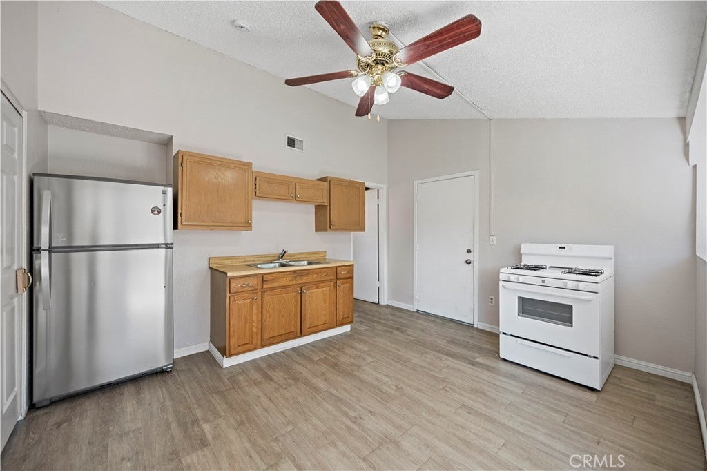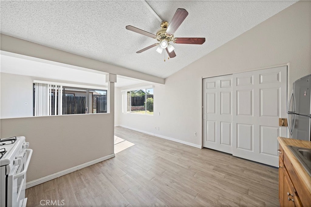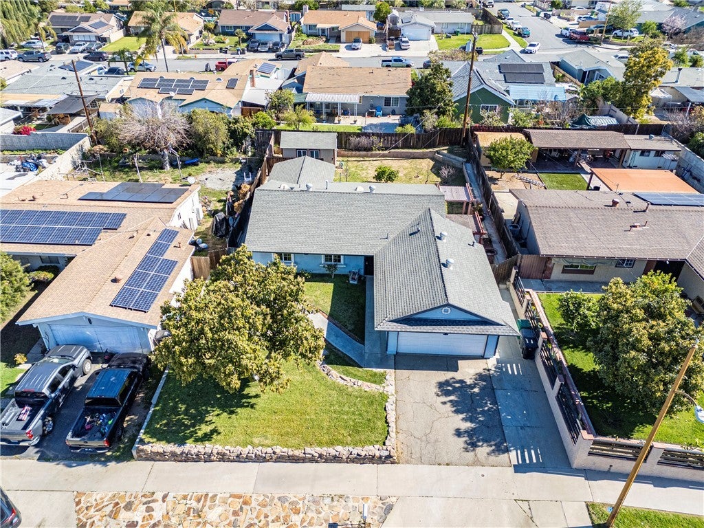 Spacious single-story home featuring 4 bedrooms including an attached 1-bedroom guest suite with its own 3/4 bathroom and kitchenette. This flexible layout offers options for extended living, guests, or potential rental use. The main living area features vaulted ceilings and sliding glass doors that open to the backyard, creating an inviting indoor-outdoor flow. The kitchen includes tile countertops, gas range, built-in microwave, dishwasher, dual-basin sink, and direct access to the patio area. All bedrooms offer natural light and closet storage. The attached guest suite includes a separate entrance, kitchenette with cabinetry and range, wood-style flooring, and its own shower bathroom, providing added privacy and versatility. Step outside to a generously sized backyard featuring a concrete patio, raised planter beds, mature citrus trees, and a detached storage shed. Additional features include central air and heat, dual-pane windows, a 2-car attached garage with automatic opener. Conveniently located near neighborhood parks, shopping, dining, and commuter routes. A unique opportunity offering flexible living space on a spacious lot in an established community.