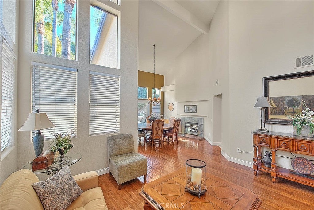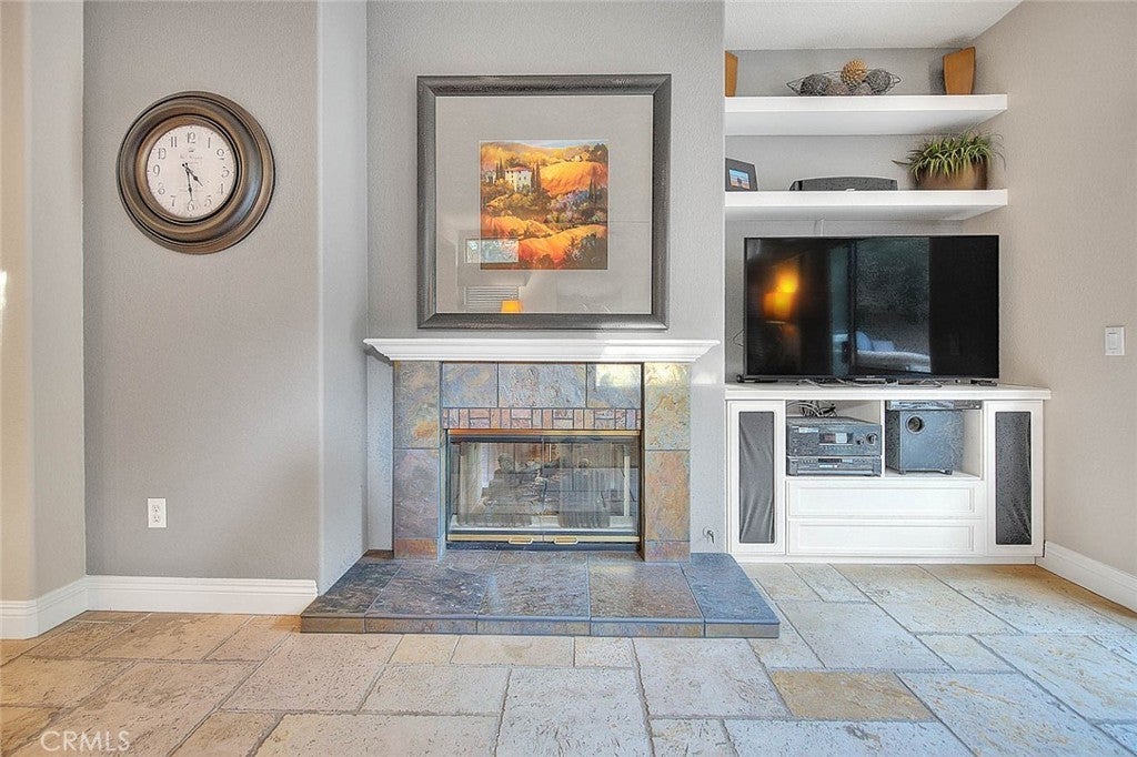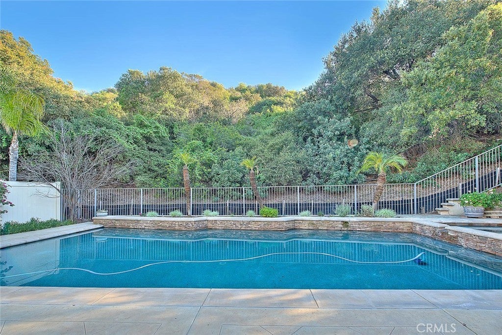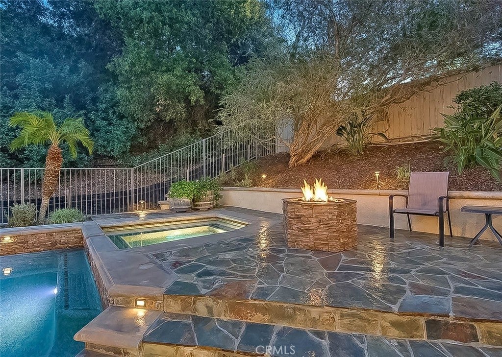 Beautiful, highly upgraded Corona 4 bedroom, 4 bath home with a resort-style backyard featuring a pool, spa, barbecue island, and firepit. The home was built in a terraced fashion, which offers a high degree of privacy from the neighbors. Offering 3,060 square feet of living space on a 10,019 square foot lot (per tax roll), this property impresses inside and out. Front and rear hardscaping includes flagstone decking and stacked rock accents that elevate curb appeal from the moment you arrive. The open floor plan is filled with natural light and finished in a designer color palette. Soaring ceilings welcome you into the formal living room. A dual-sided fireplace connects the formal dining and family rooms, creating warmth for entertaining or relaxing evenings. The well-designed kitchen features furniture-grade wood cabinetry, granite counters, travertine flooring, stainless steel appliances, recessed lighting, a pantry, a center island, a breakfast bar, and a spacious breakfast nook for casual dining. The primary suite is exceptional. A dual-sided fireplace serves both the bedroom and private retreat, ideal for a home office or reading lounge. A balcony off the retreat overlooks the backyard. The en-suite bath offers a dual sink vanity, walk-in shower, soaking tub, and large walk-in closet with built-ins. Upstairs includes two guest bedrooms, each with its own en-suite bath. A main-level bedroom and full bath provide flexibility for guests or multigenerational living. The first floor also features an indoor laundry room with extra storage. The private backyard has no rear neighbor and mature greenery for a serene backdrop. Enjoy the spa year-round, pool in summer, firepit seating area, and stacked rock barbecue island with ample counter space for serving. A large three-car garage and generous driveway parking complete the home. This one delivers on space, upgrades, privacy, and outdoor living. This home is move in ready to enjoy!