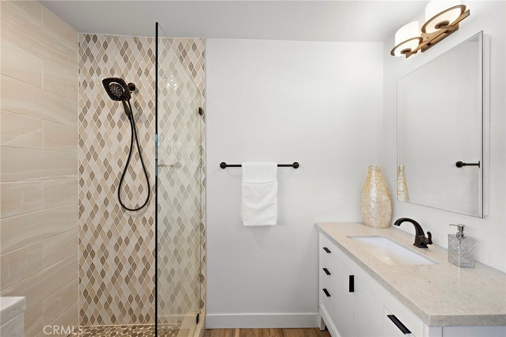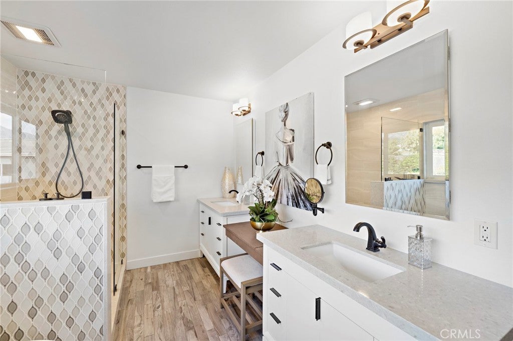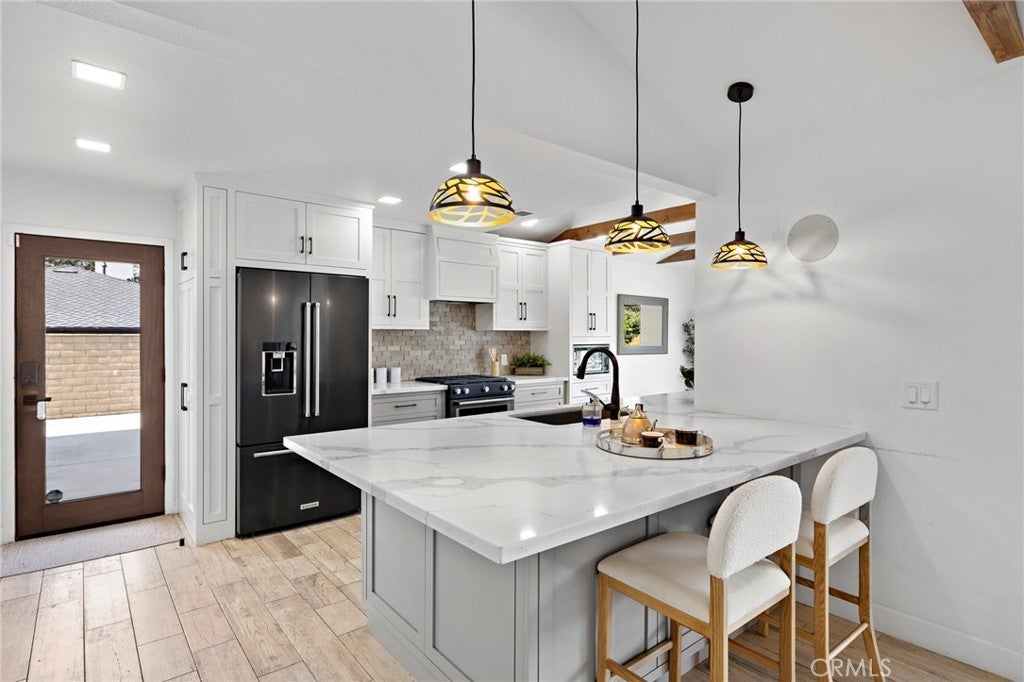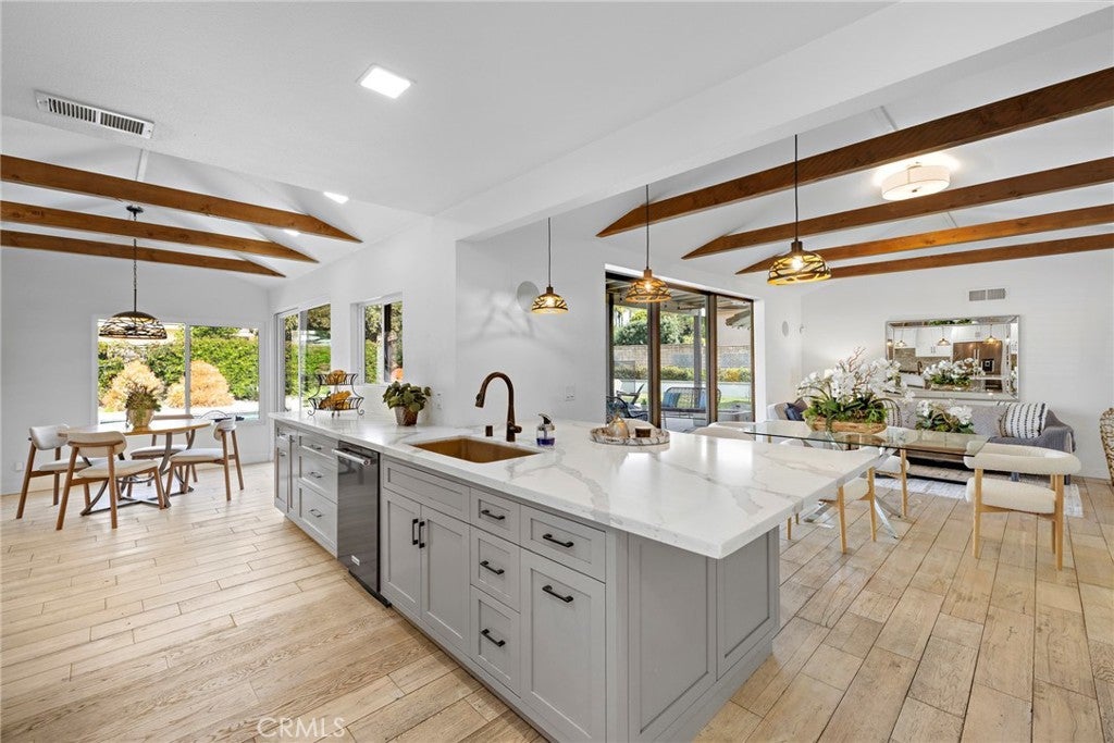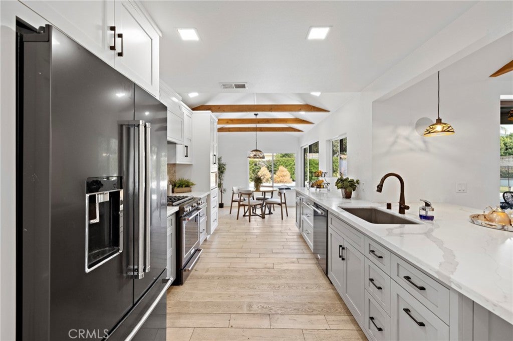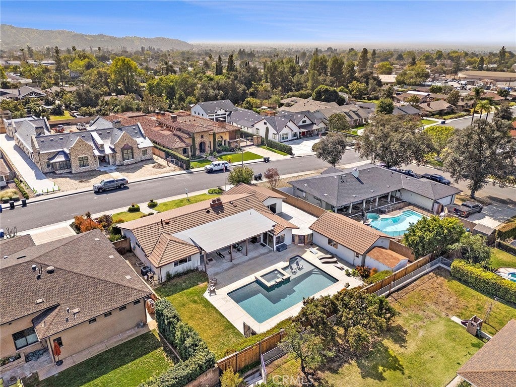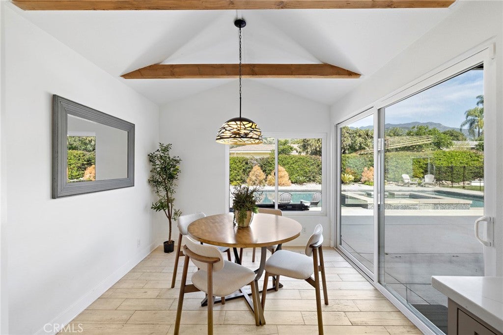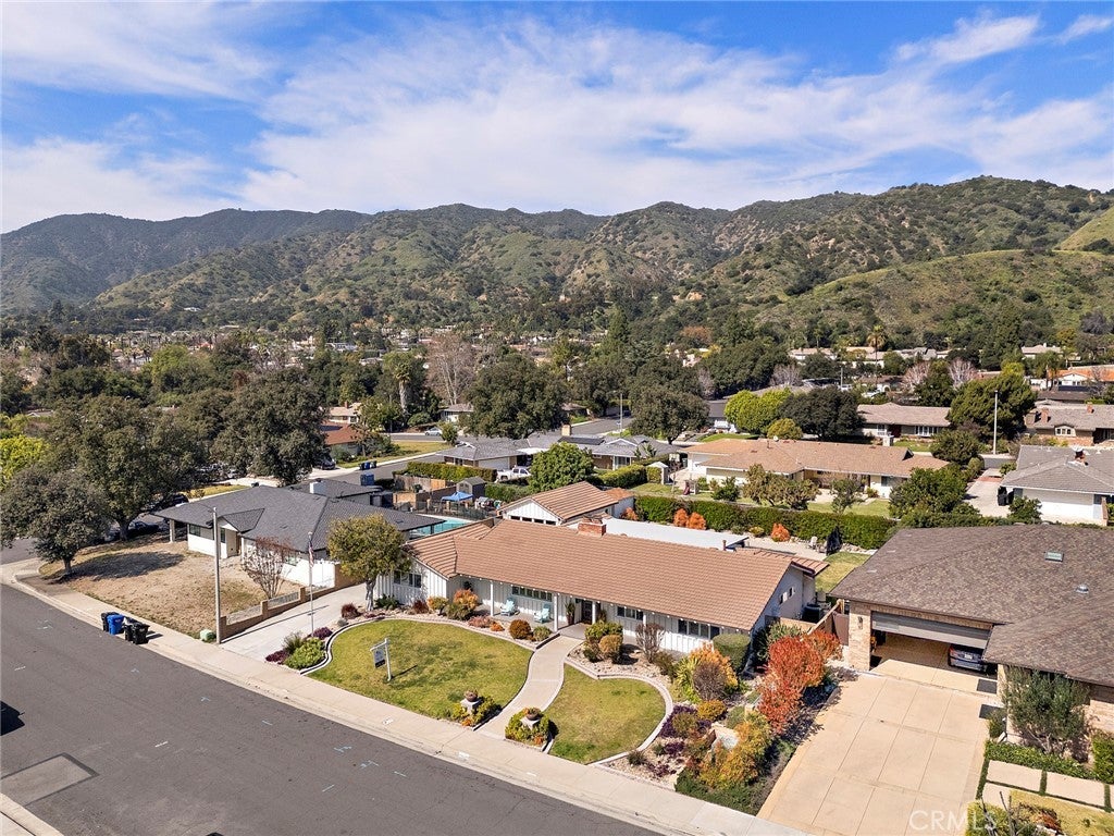 A rare find in the prestigious Hidden Springs neighborhood, this beautifully renovated single-story home showcases refined modern farmhouse style and bright, open living spaces throughout. Designed for relaxed everyday living and effortless entertaining, the thoughtfully crafted floor plan features a dramatic multi-slide patio door that opens to a spacious California room — perfect for outdoor dining and hosting gatherings year-round. The kitchen blends timeless shaker cabinetry with sleek dark stainless appliances, a cheerful dining nook, and a generous quartz island that flows seamlessly into the family room with vaulted, beamed ceilings. A spacious game room offers the ultimate setting to gather with friends and family. Stunning mountain views grace most rooms, including the serene primary suite complete with a spa-inspired bath featuring a walk-in shower, dual custom quartz vanities, and a freestanding soaking tub. The fourth bedroom is currently configured as a den or home office with convenient access to an adjacent three-quarter bath. All three bathrooms are beautifully updated with stylish, contemporary finishes. Step outside to your private backyard retreat, where a fully renovated pool with Baja shelf and raised spa is complemented by an expansive patio and tranquil mountain views. Water-wise landscaping with succulents and native plantings ensures easy maintenance and year-round appeal. A new concrete driveway leads to a detached two-car garage. Ideally located within the highly regarded Glendora Unified School District and just a short Distance to Sellers Elementary school, Goddard Intermediate School and George Manooshian Park and its sports fields, this exceptional home offers the perfect blend of comfort, style, and location.