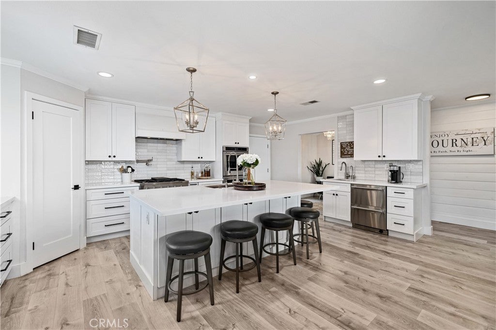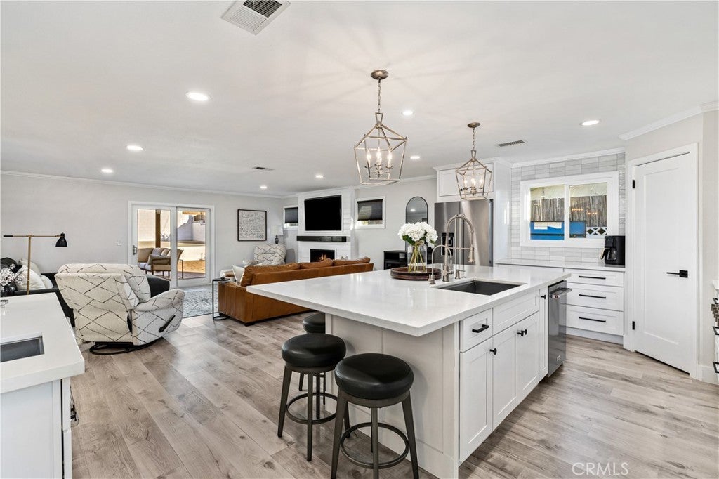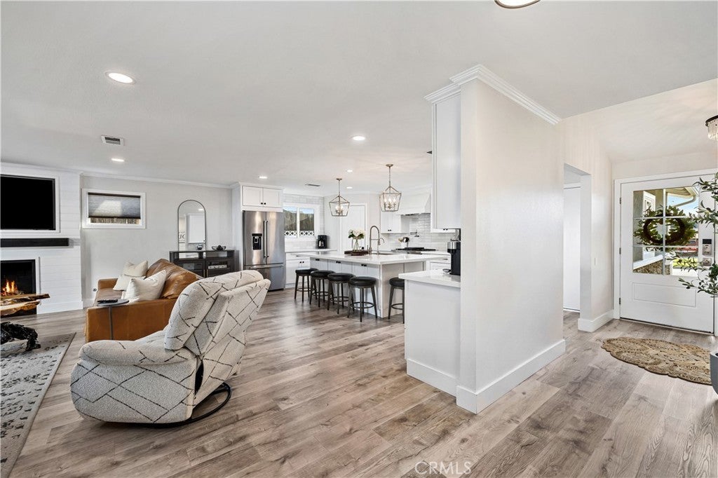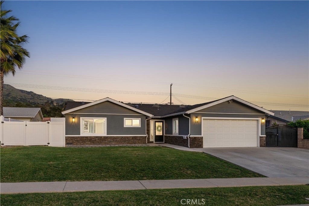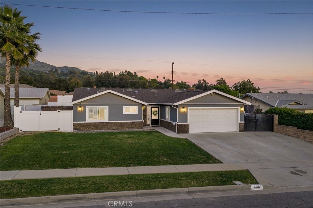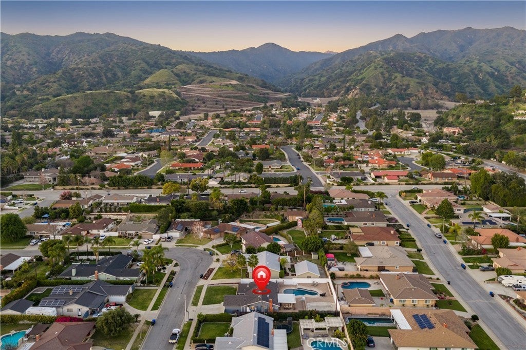 Positioned in a desirable Glendora foothill neighborhood just south of Sierra Madre and within walking distance to Sellers Elementary School, Goddard Middle School, and Glendora High School, this extensively remodeled single-level residence offers an open floor plan, refined finishes, and an expansive lot framed by scenic mountain views. The exterior blends stacked-stone accents and contrasting trim, while a concrete walkway leads to a fiberglass and glass-paneled front door with sidelight opening to a foyer highlighted by crown molding and a shiplap accent wall. The interior opens to a spacious great room anchored by a remodeled kitchen centered around a large island with seating and a sink. White shaker cabinetry, quartz countertops, and a full tile backsplash complement premium appliances including a Bosch gas cooktop, KitchenAid refrigerator, double ovens, and dishwasher. Additional highlights include a coffee bar with a Thermador refrigerator/freezer drawers and an instant hot water dispenser, pendant lighting above the island, recessed lighting, and cabinetry for storage. The kitchen flows seamlessly into the living area where a fireplace with a horizontal mantel creates a focal point and sliding glass doors open to the backyard. The primary suite features recessed lighting and a large window bringing in natural light. A shiplap accent wall adds architectural detail while the en-suite bath includes a dual-sink quartz vanity, framed mirrors, globe lighting, and a glass-enclosed shower with full-height tile and frameless enclosure. A spacious walk-in closet completes the suite. Two additional bedrooms offer windows overlooking the backyard and surrounding foothills, while the hall bathroom includes a dual-sink quartz vanity and glass-enclosed tile shower. A dedicated laundry room provides cabinetry and a utility sink. The backyard is designed for both relaxation and recreation, featuring expansive paver decking surrounding a pebble-finish pool with elevated backsplash, concrete coping, Baja shelf, and three umbrella ports, perfect for entertaining. A covered patio with wood post-and-beam supports and an Alumawood roof provides shaded outdoor living with recessed lighting and a ceiling fan. Multiple terraced areas expand the outdoor space, including an upper sport court ideal for pickleball or basketball. Additional features include gated RV parking with a 240V plug and sewer cleanout, upgraded electrical panel, updated HVAC system, and a 30-year roof.