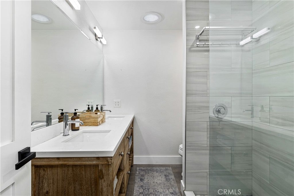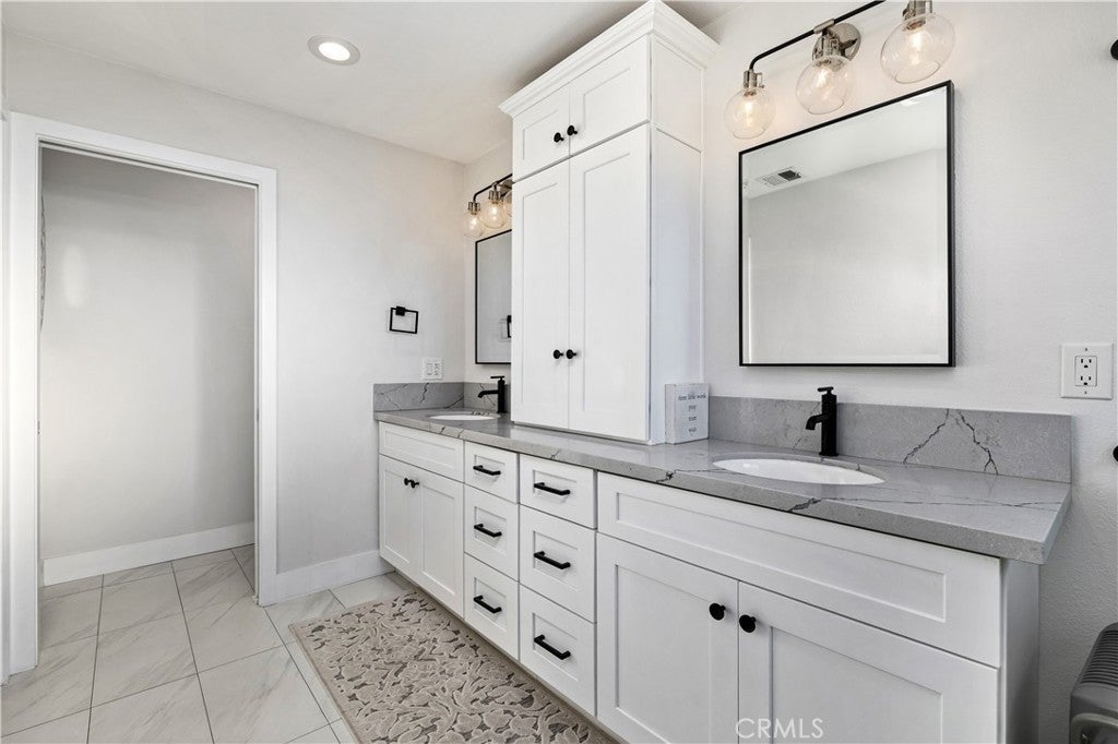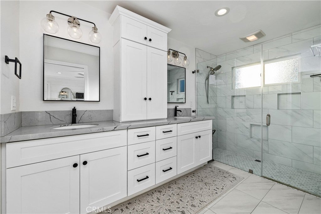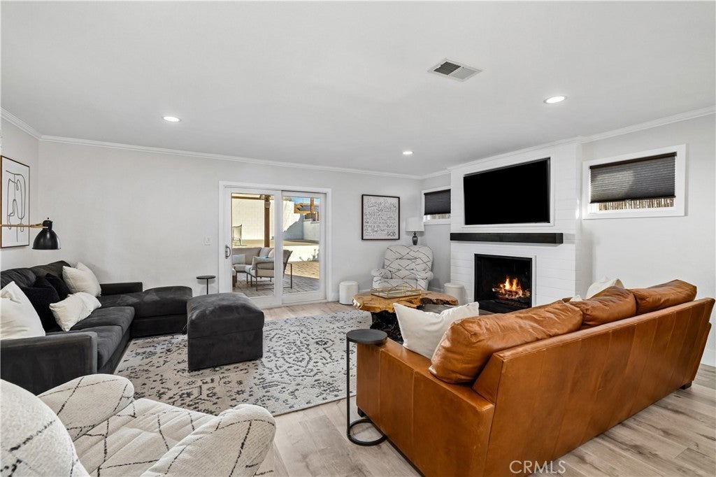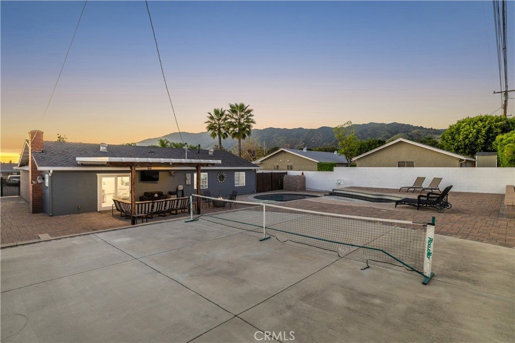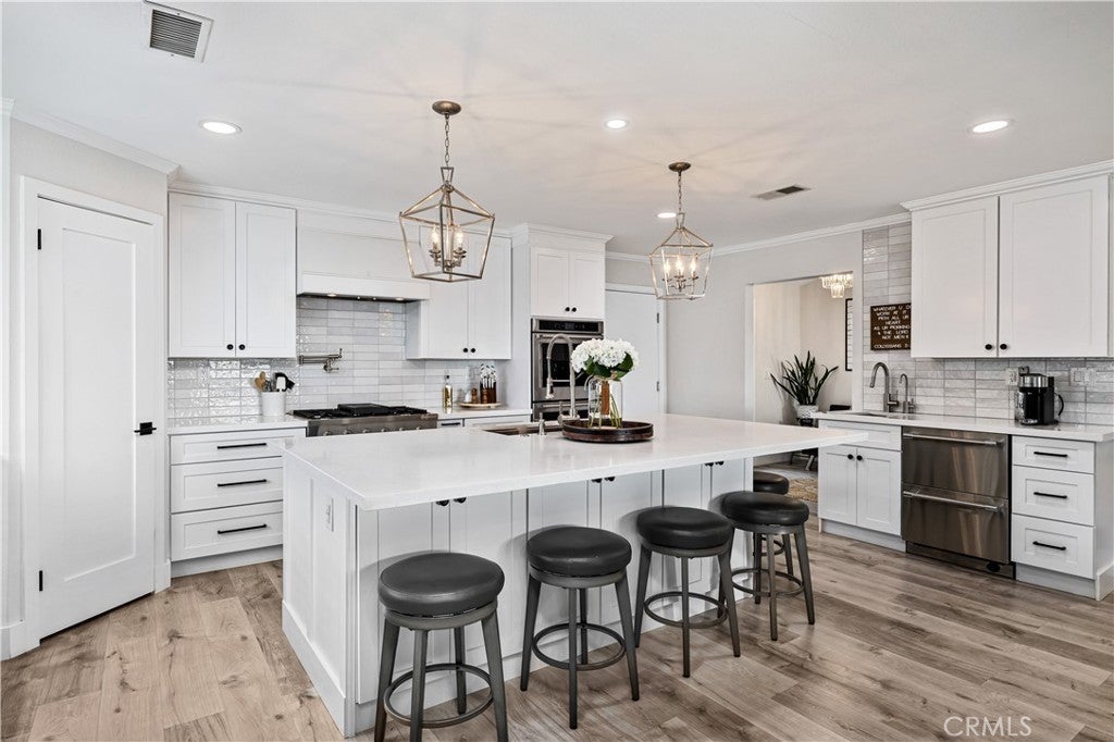 Positioned in a desirable Glendora foothill neighborhood just south of Sierra Madre and within walking distance to Sellers Elementary School, Goddard Middle School, and Glendora High School, this extensively remodeled single-level residence offers an open floor plan, refined finishes, and an expansive lot framed by scenic mountain views. The exterior blends stacked-stone accents and contrasting trim, while a concrete walkway leads to a fiberglass and glass-paneled front door with sidelight opening to a foyer highlighted by crown molding and a shiplap accent wall. The interior opens to a spacious great room anchored by a remodeled kitchen centered around a large island with seating and a sink. White shaker cabinetry, quartz countertops, and a full tile backsplash complement premium appliances including a Bosch gas cooktop, KitchenAid refrigerator, double ovens, and dishwasher. Additional highlights include a coffee bar with a Thermador refrigerator/freezer drawers and an instant hot water dispenser, pendant lighting above the island, recessed lighting, and cabinetry for storage. The kitchen flows seamlessly into the living area where a fireplace with a horizontal mantel creates a focal point and sliding glass doors open to the backyard. The primary suite features recessed lighting and a large window bringing in natural light. A shiplap accent wall adds architectural detail while the en-suite bath includes a dual-sink quartz vanity, framed mirrors, globe lighting, and a glass-enclosed shower with full-height tile and frameless enclosure. A spacious walk-in closet completes the suite. Two additional bedrooms offer windows overlooking the backyard and surrounding foothills, while the hall bathroom includes a dual-sink quartz vanity and glass-enclosed tile shower. A dedicated laundry room provides cabinetry and a utility sink. The backyard is designed for both relaxation and recreation, featuring expansive paver decking surrounding a pebble-finish pool with elevated backsplash, concrete coping, Baja shelf, and three umbrella ports, perfect for entertaining. A covered patio with wood post-and-beam supports and an Alumawood roof provides shaded outdoor living with recessed lighting and a ceiling fan. Multiple terraced areas expand the outdoor space, including an upper sport court ideal for pickleball or basketball. Additional features include gated RV parking with a 240V plug and sewer cleanout, upgraded electrical panel, updated HVAC system, and a 30-year roof.